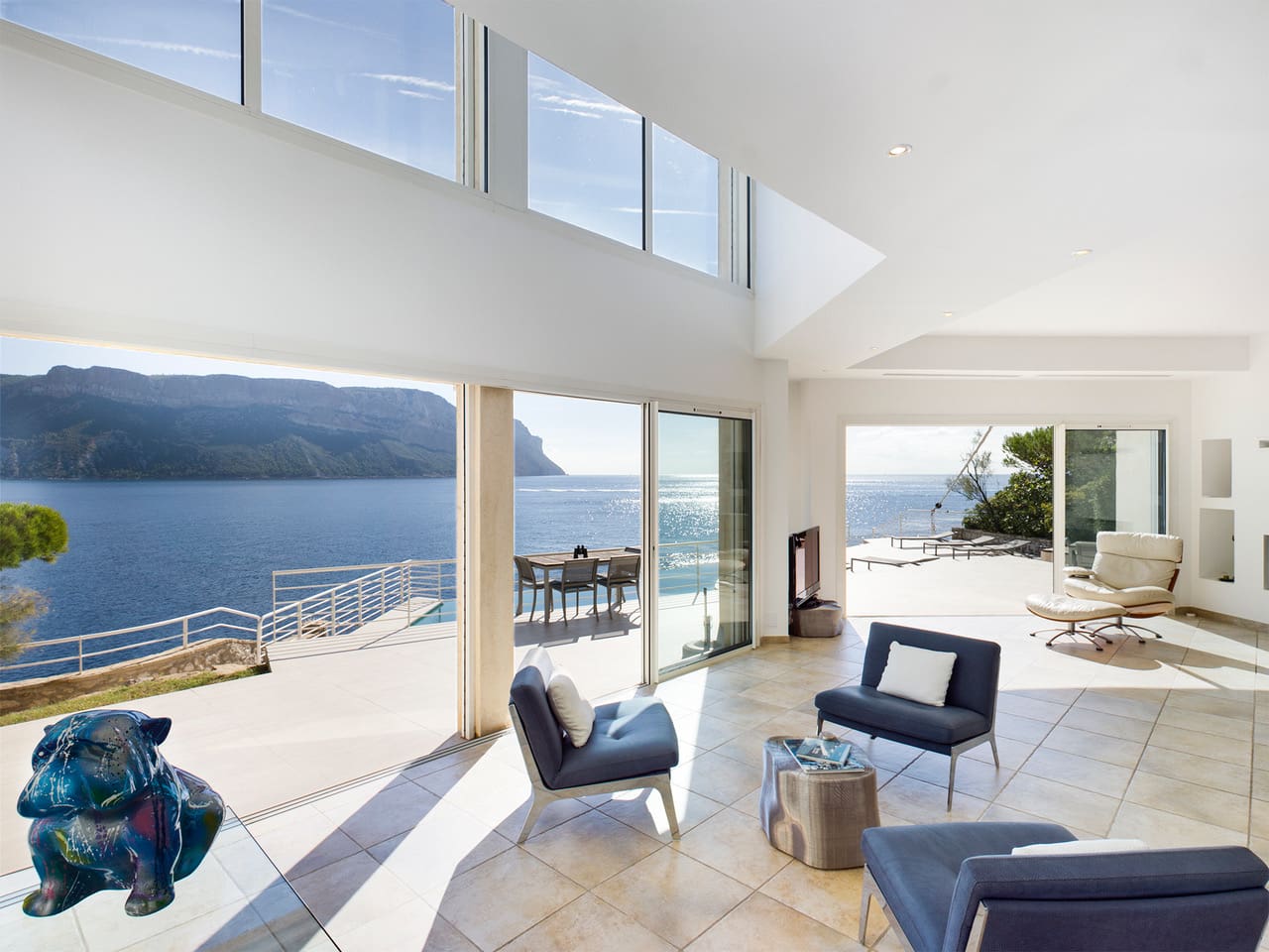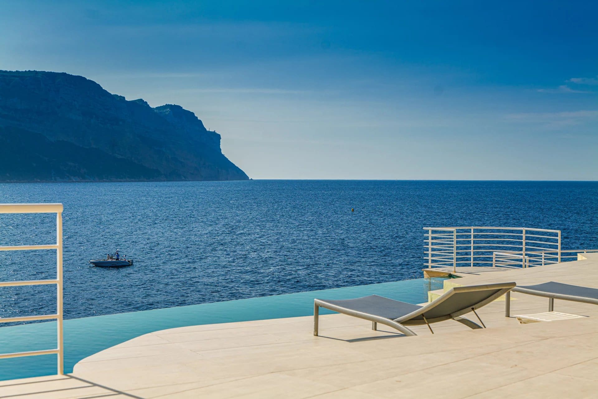 Le long des calanques de Cassis, en s’approchant du port depuis Marseille, se cache une villa qui vaut le détour! Conçue pour recueillir la lumière naturelle, et arborant un style moderne et épuré, la villa entière est dédiée aux plaisirs que procure la mer Méditerranée. Ouverte sur la mer, la propriété dispose d’une piscine à débordement qui se fond avec les eaux azur de Cassis. La terrasse de 400 m2, qui entoure la piscine, et depuis laquelle on emprunte le petit chemin vers la mer, vous offre de grands espaces de détente, et une vue panoramique sur le Cap Canaille et la baie de Cassis.