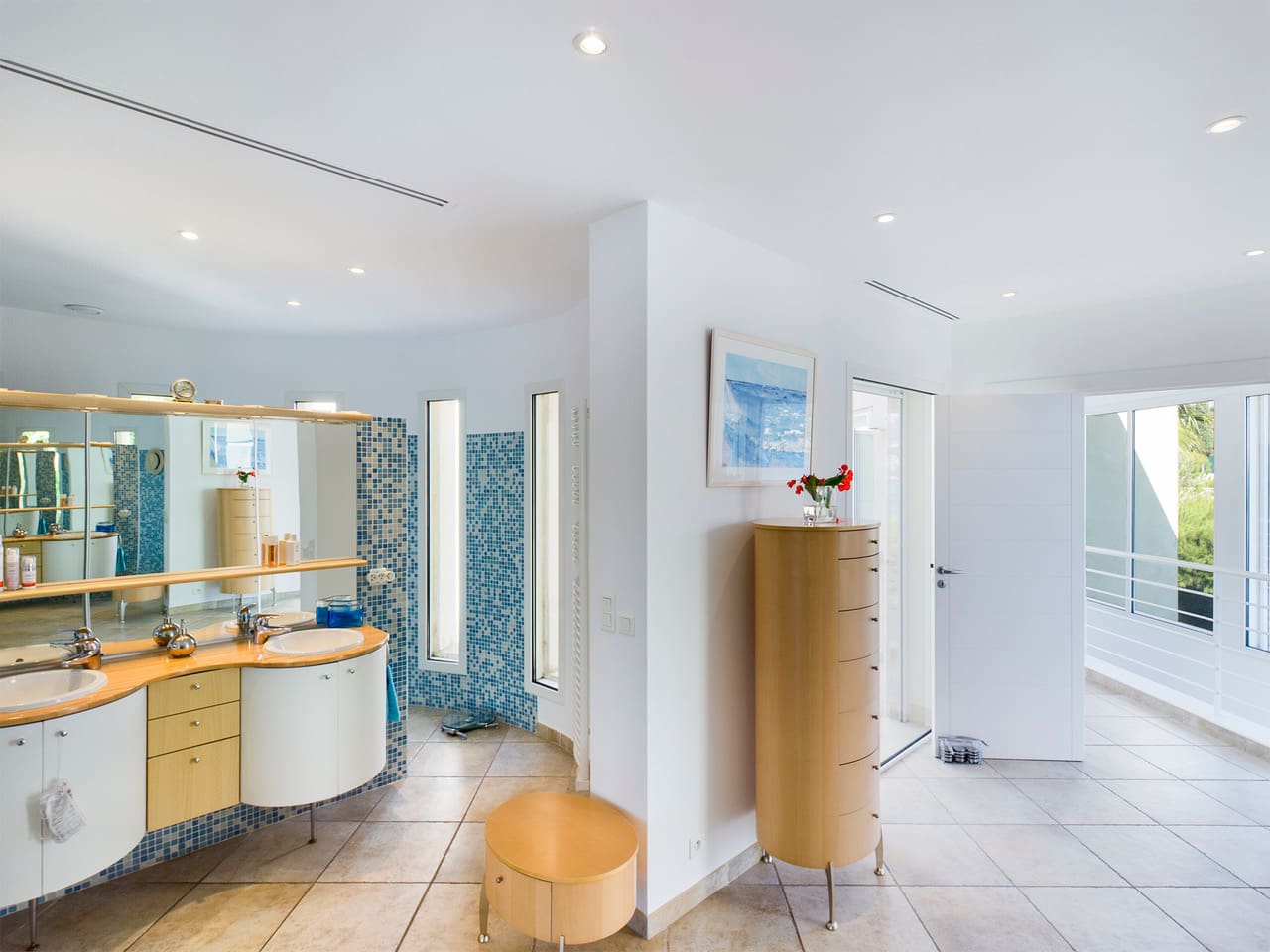 La cuisine, indépendante et très bien équipée, donne sur le jardin sobre et soigné, une belle pelouse agrémentée de pins et de palmiers. La villa dans son ensemble est meublée avec élégance. De nombreux tableaux et objets de design viennent parfaire la décoration.