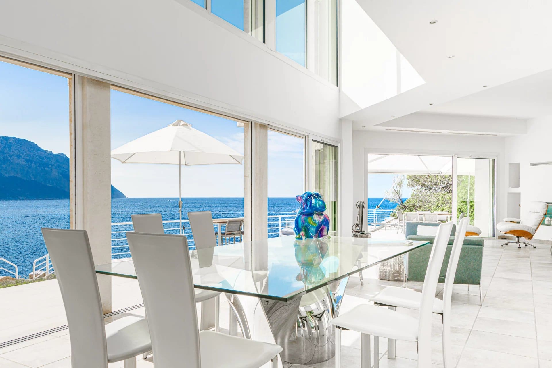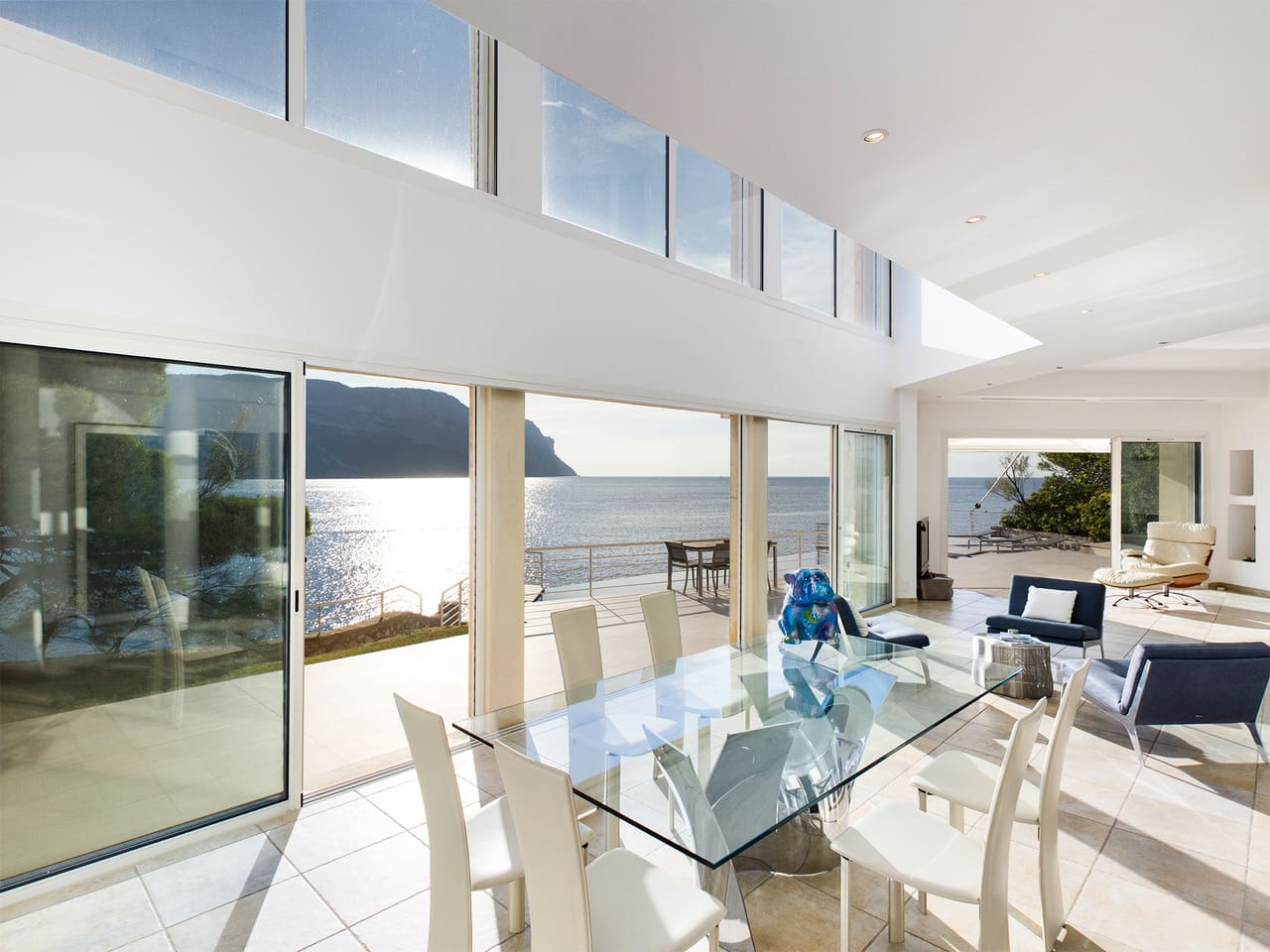 L’espace pour les repas est ouvert sur toute la hauteur de la maison et jouit ainsi d’une parfaite luminosité, générée par les grandes baies vitrées donnant sur la mer depuis les deux niveaux de la villa.