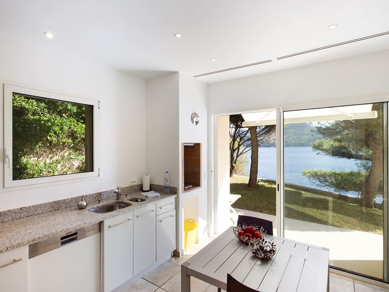 Cuisine donnant d’un côté sur le jardin, avec BBQ, et de l’autre sur le salon - salle à manger avec four électrique, four micro ondes, plaques vitrocéramiques, lave vaisselle, réfrigérateur, cafetière nespresso, grille pain