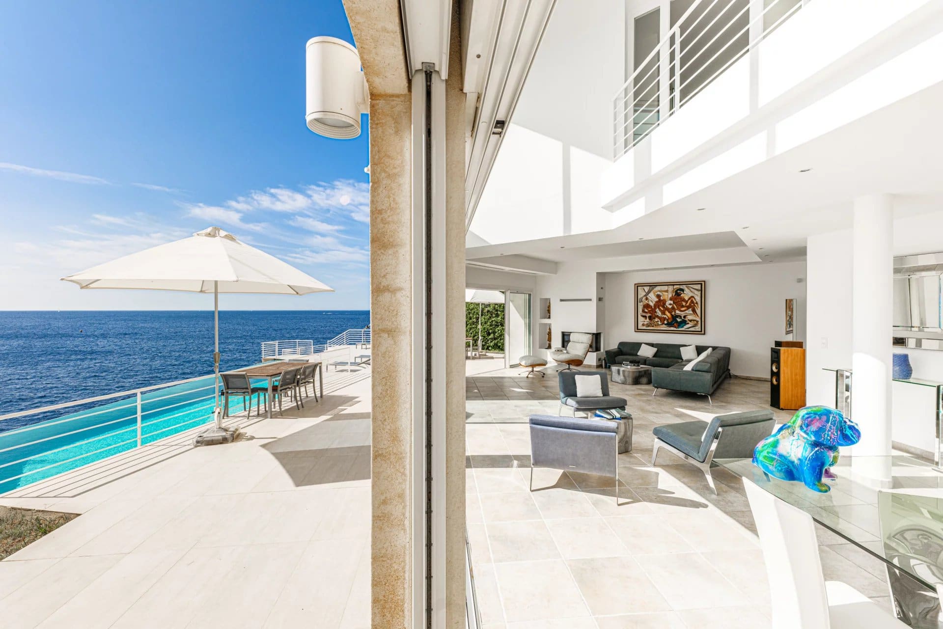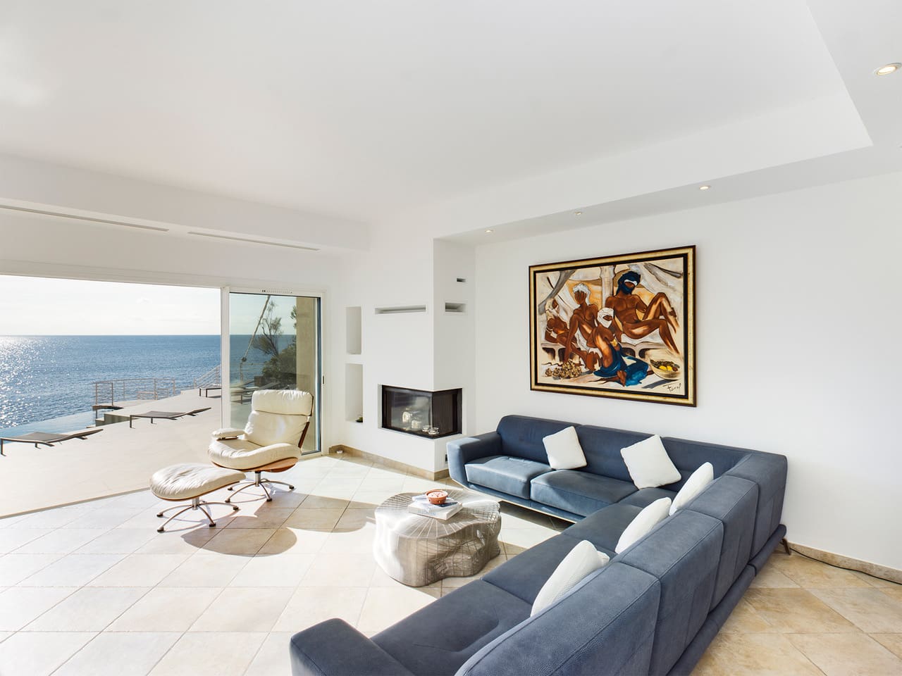 Salon - salle à manger très lumineux, avec de grandes baies vitrées donnant sur la mer avec cheminée, télévision lcd, climatisation, vue mer, vue piscine, vue jardin