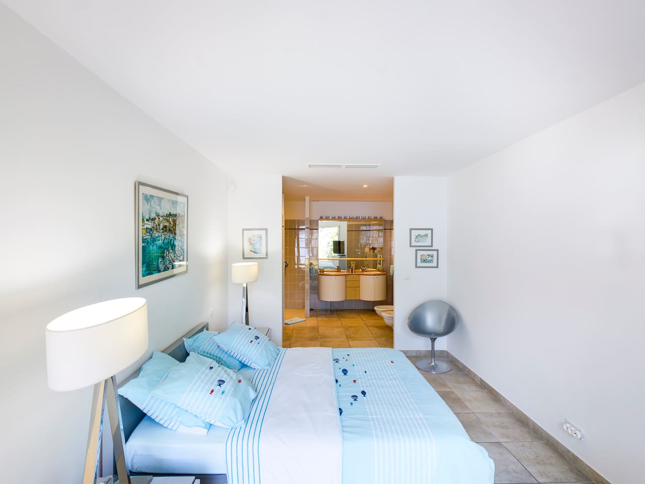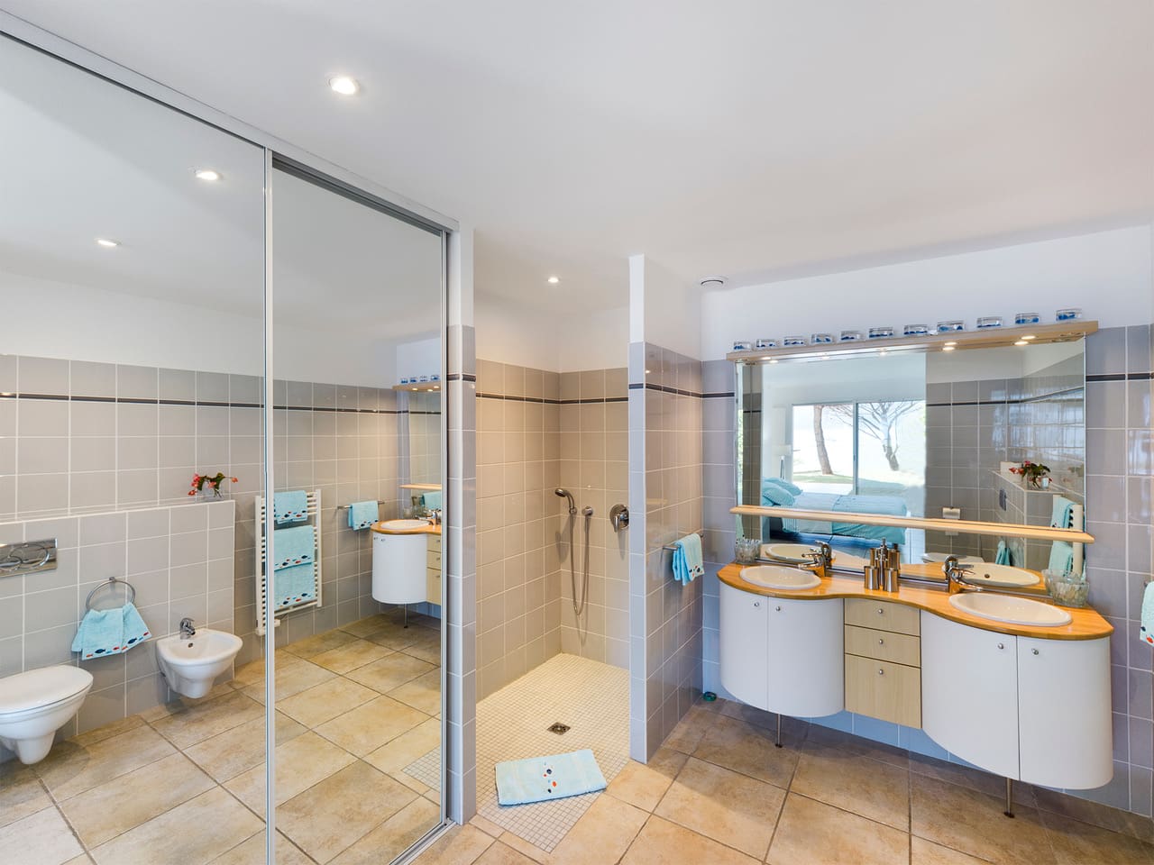 Chambre double avec lit 160, accès terrasse, accès jardin, coin bureau et Salle de bain en suite avec wc, douche, lavabo double, bidet