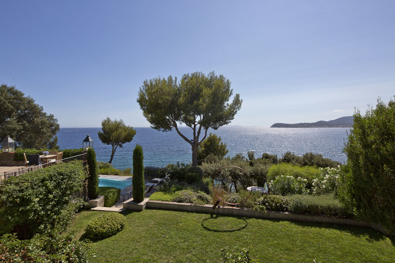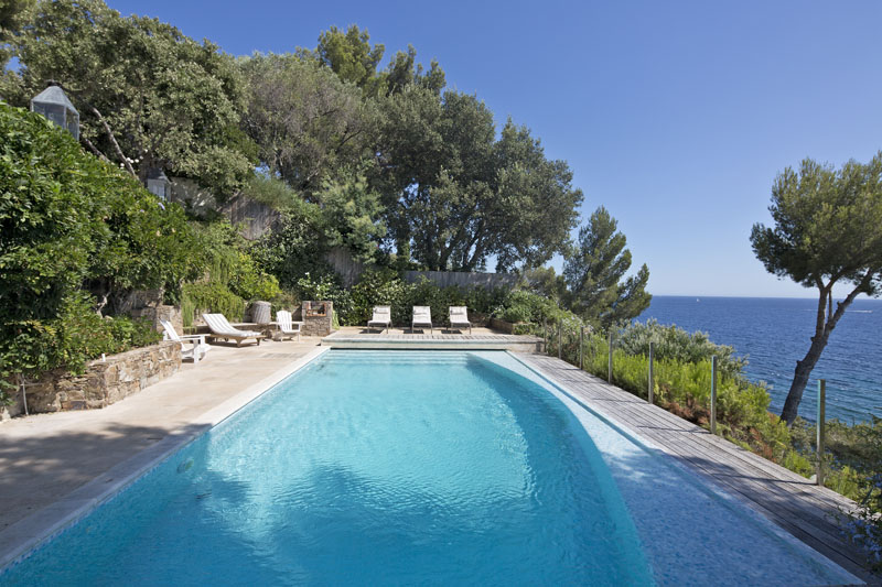 Cette maison orientée plein sud avec vue sur les îles du Levant, se situe en front de mer avec accès privé, possède une piscine à débordement, dans un cadre de verdure arboré et paisible.