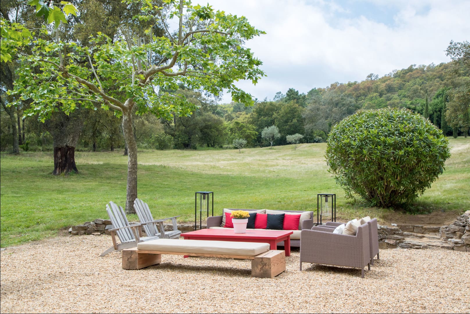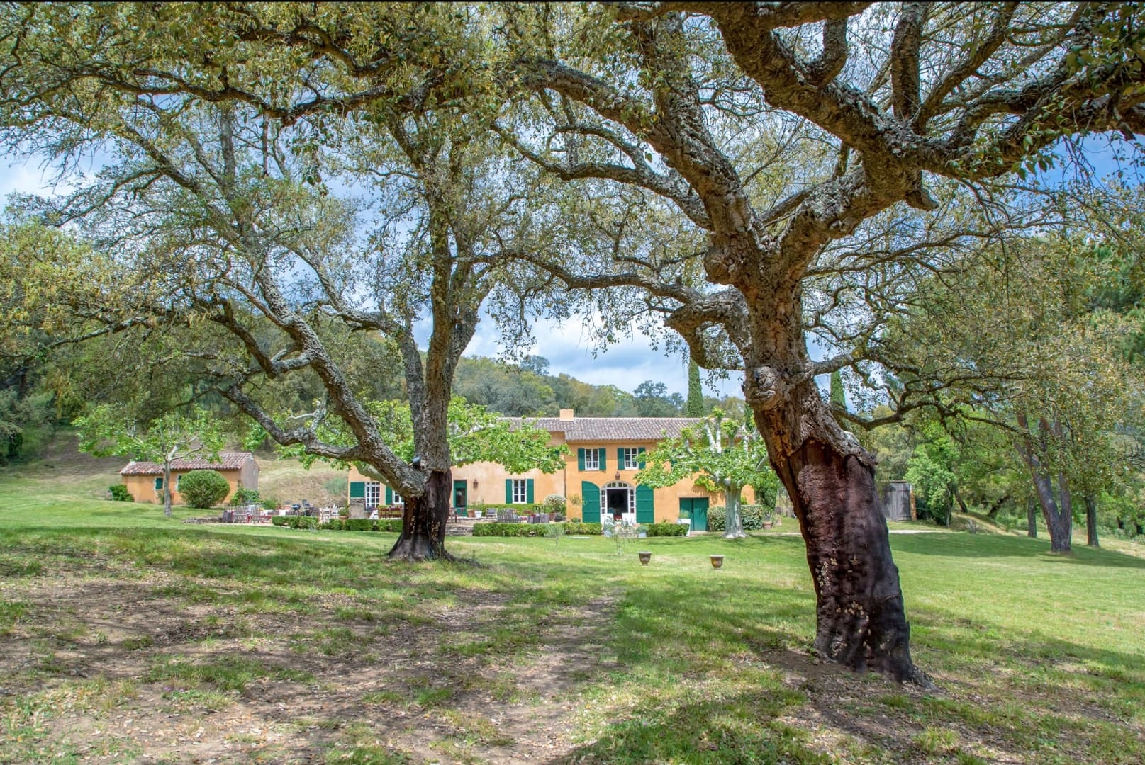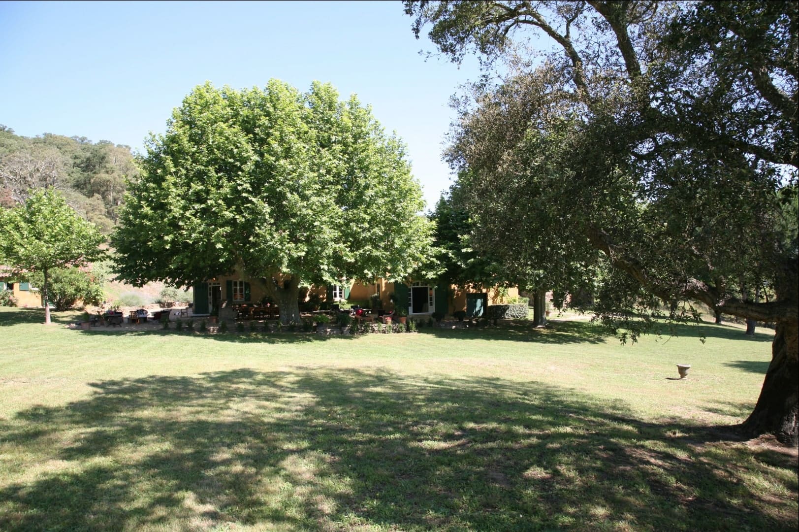 Construite il y a plus d'un siècle au milieu de ses 20 hectares de bois, de maquis et de vignes en lisière de forêt domaniale, la maison principale est posée sur une prairie en pente douce ouverte vers un paysage de collines sauvages. Une terrasse ombragée par un platane centenaire et ses deux jeunes frères, offre le confort d'un salon d'extérieur d'une grande douceur.