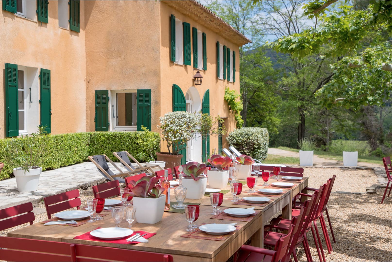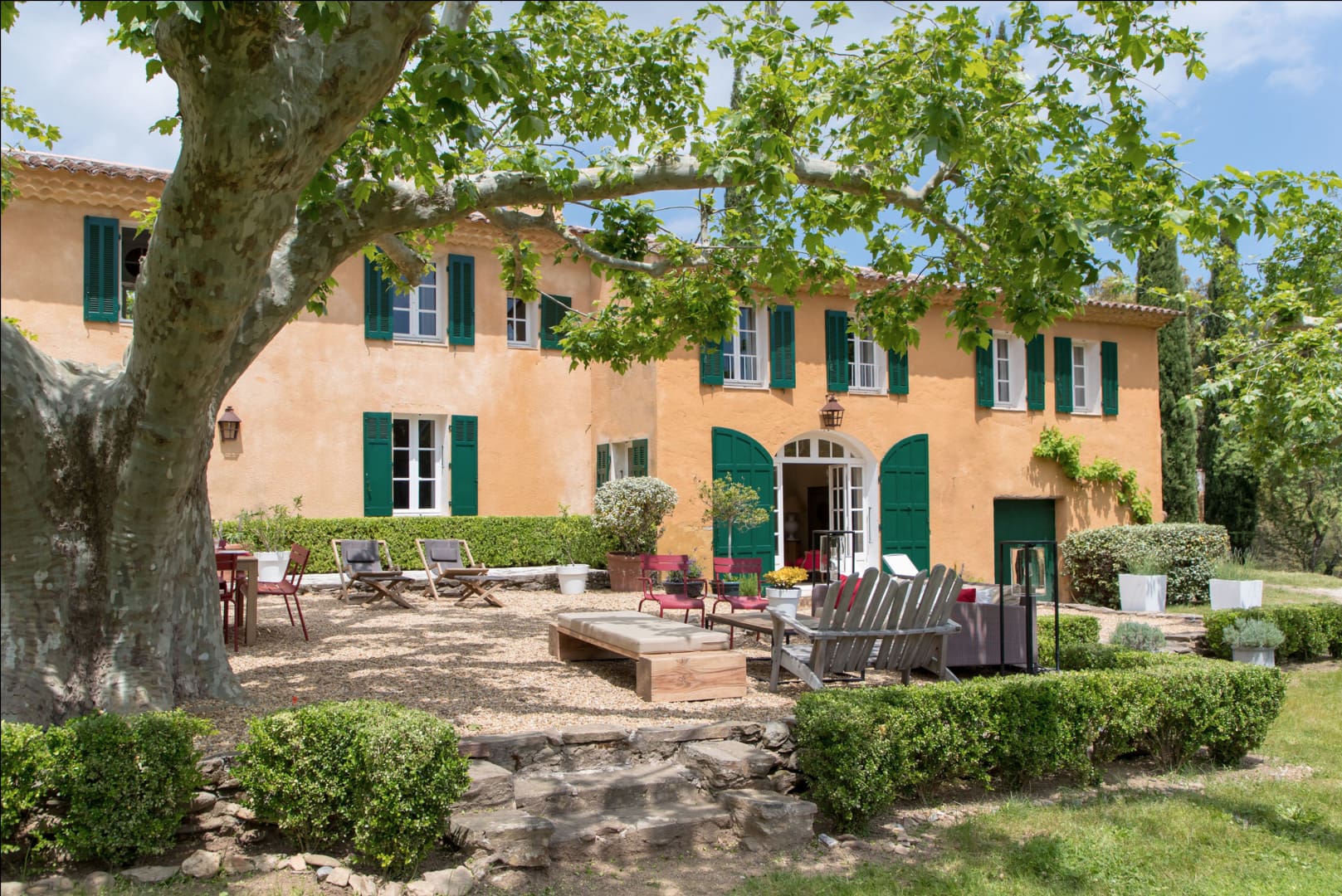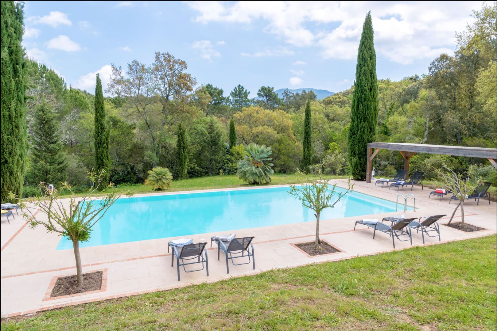 Construite il y a plus d'un siècle au milieu de ses 20 hectares de bois, de maquis et de vignes en lisière de forêt domaniale, la maison principale est posée sur une prairie en pente douce ouverte vers un paysage de collines sauvages. Une terrasse ombragée par un platane centenaire et ses deux jeunes frères, offre le confort d'un salon d'extérieur d'une grande douceur.