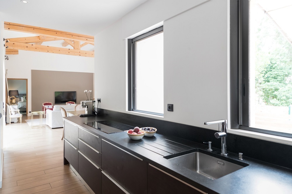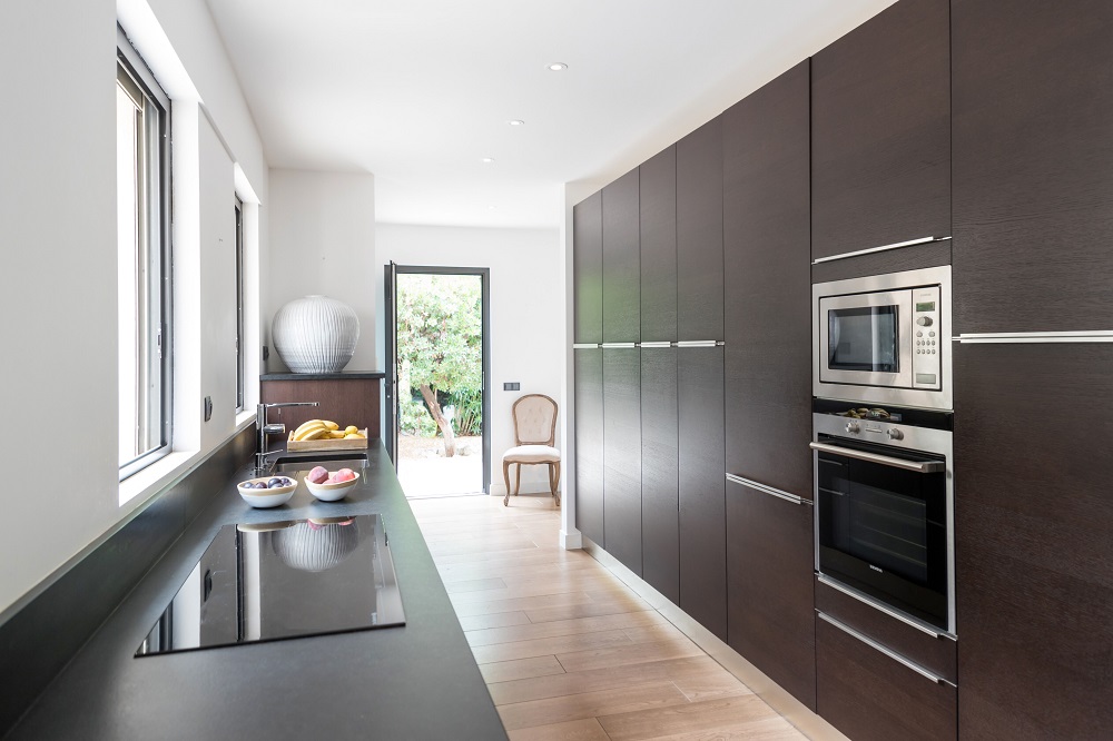 Cuisine ouverte avec réfrigérateur, congélateur, plaques à induction, lave vaisselle