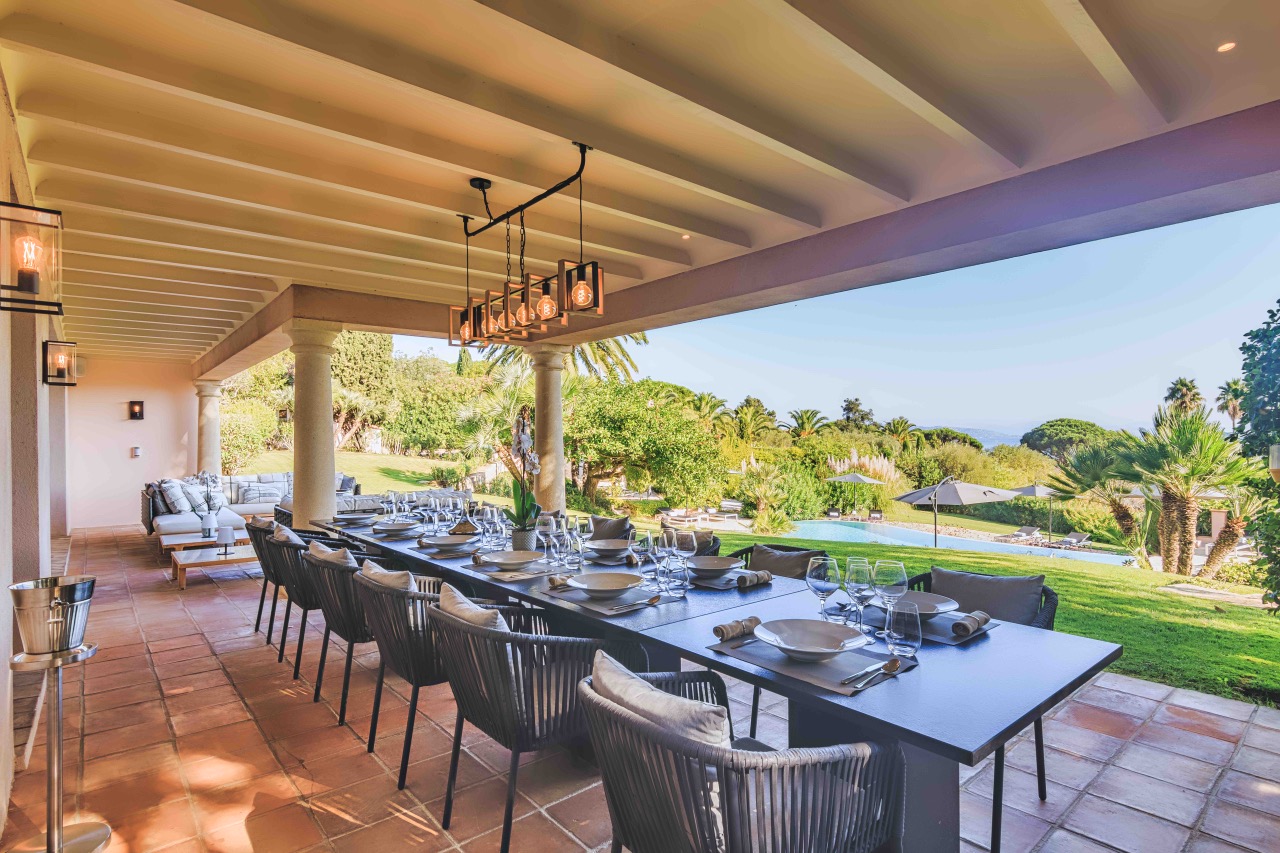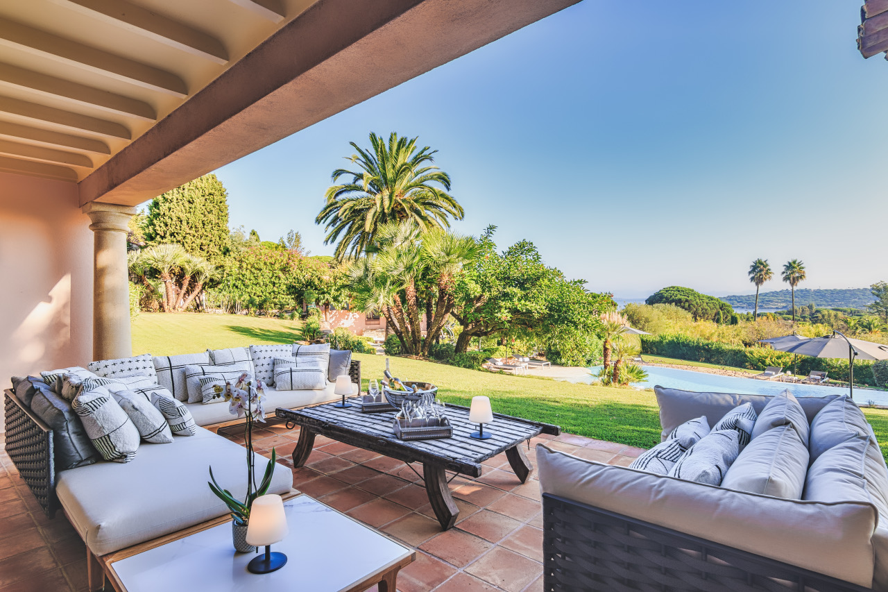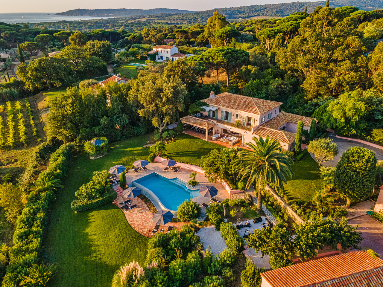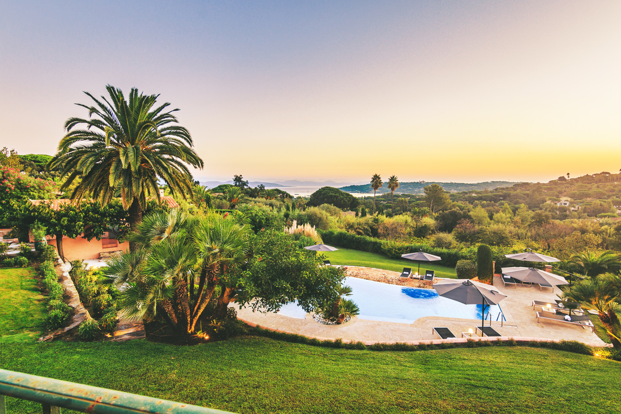 Cette sublime villa de luxe est nichée dans un écrin de verdure entre vignes et arbres méditerranéens, proche de Saint-Tropez. Elle profite d’une vue sur la baie des Canoubiers et sur le Château Borelli. Depuis certaines pièces, une jolie vue s’offre à vous avec les palmiers et les pins en premier plan, et la mer à l’horizon.