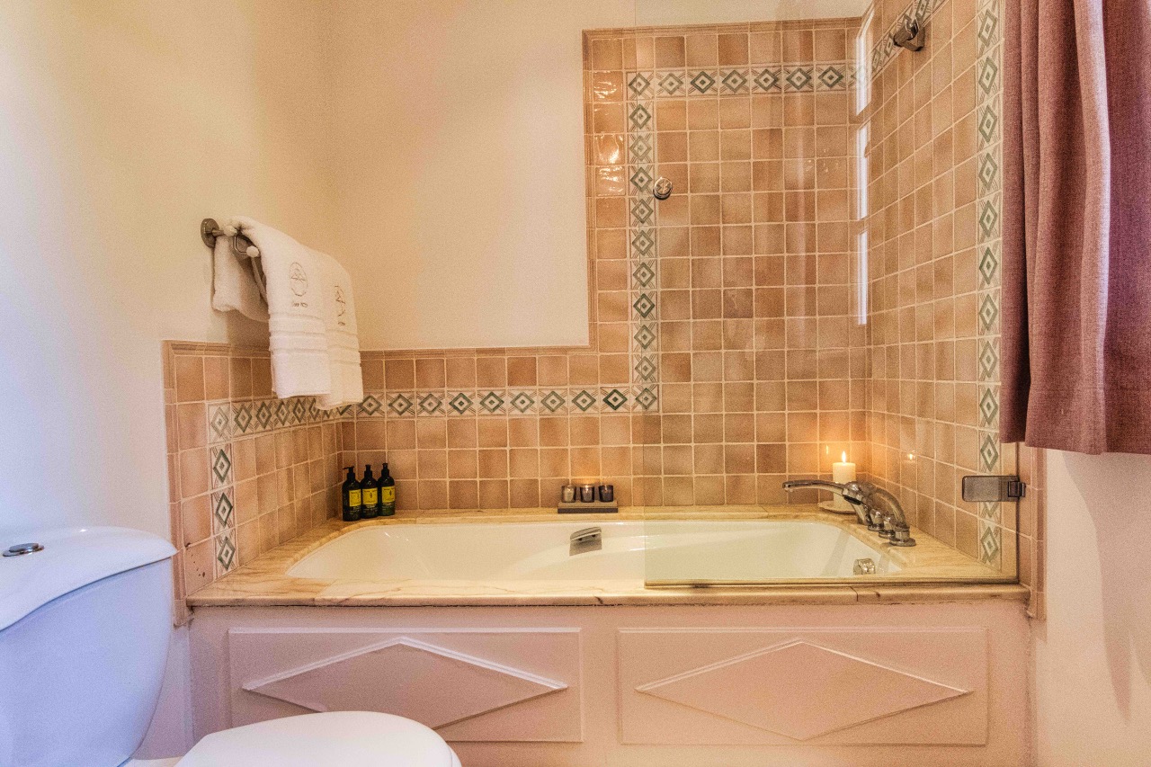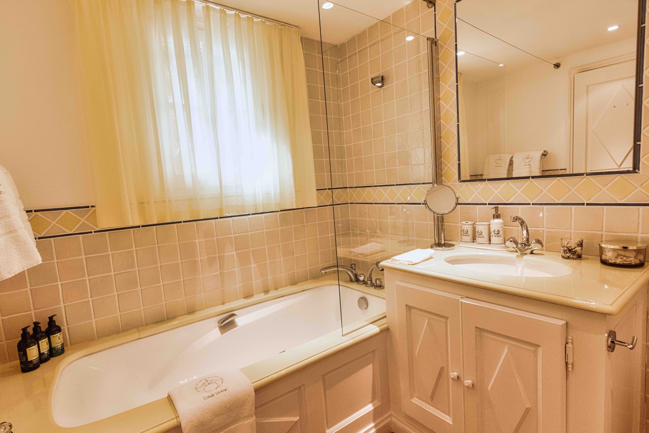 Chambre à lits jumeaux de 24 m2 avec lits jumeaux convertibles en un lit 180 avec lit 90, télévision, coffre fort, accès jardin et Salle de bain en suite avec wc, baignoire, lavabo simple, fenêtre