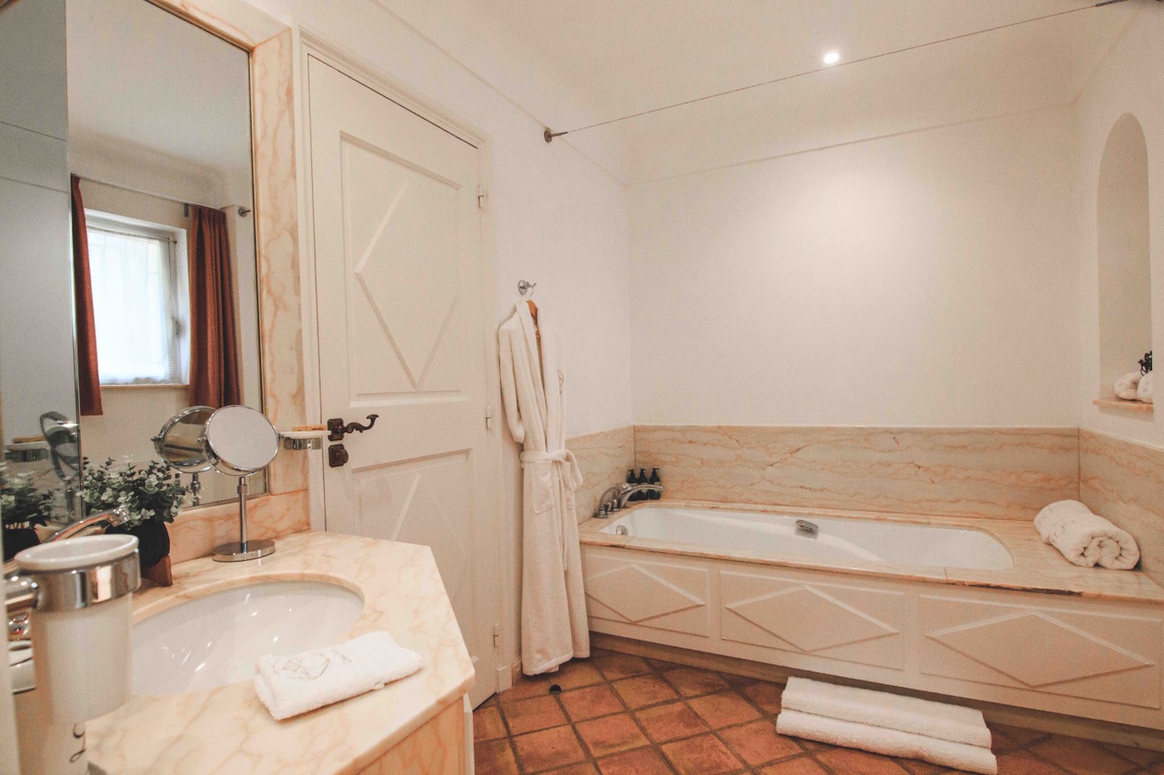 Chambre à lits jumeaux de 22 m2 avec lits convertibles en un lit 180 avec lit 90, télévision, dressing, coffre fort, accès jardin et Salle de bain en suite avec lavabo simple, baignoire, bidet, wc, fenêtre