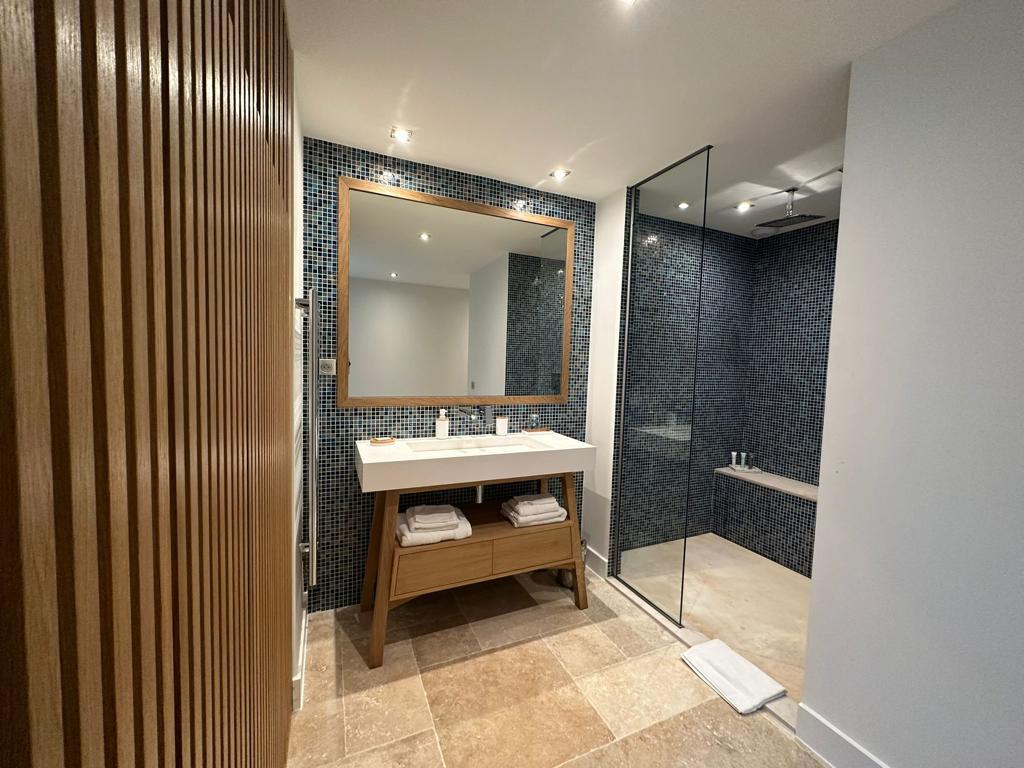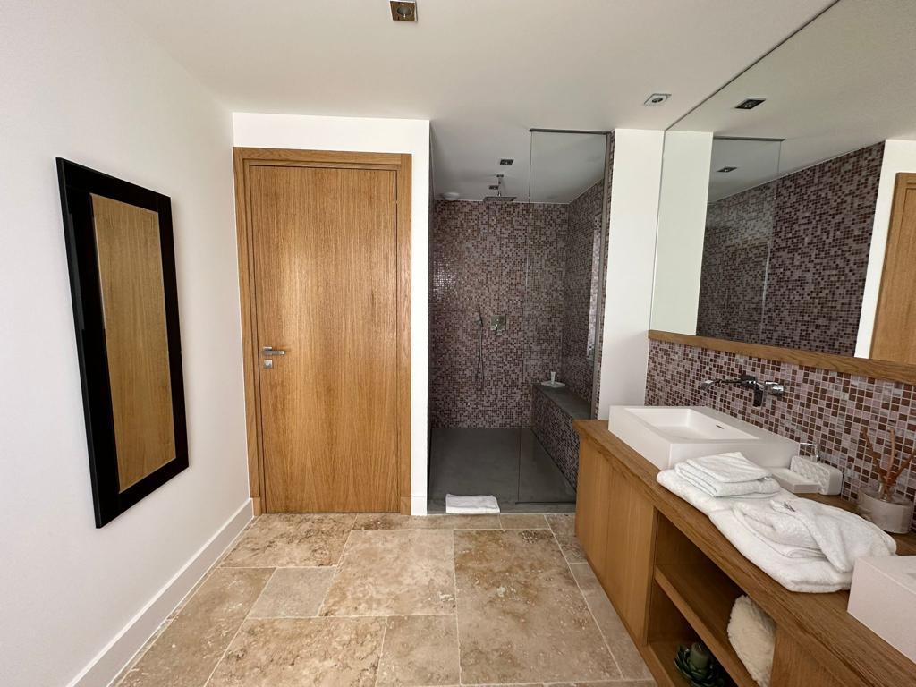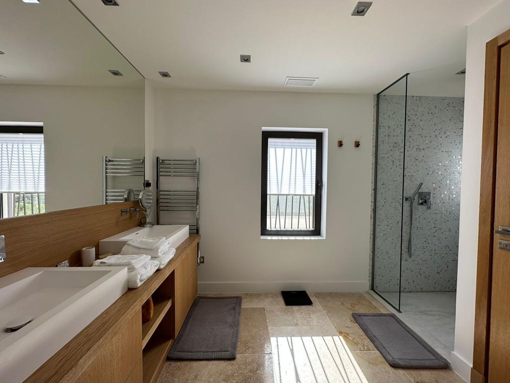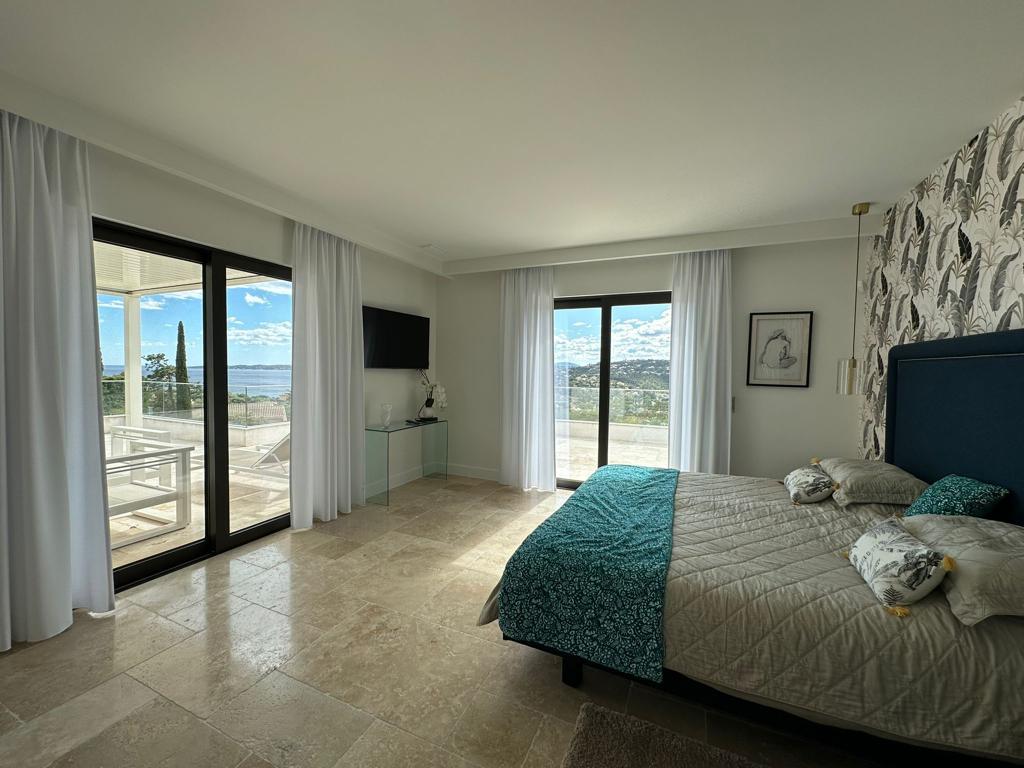 Chambre double avec dressing, climatisation et Salle de bain en suite avec douche, lavabo double et Terrasse couverte avec vue mer