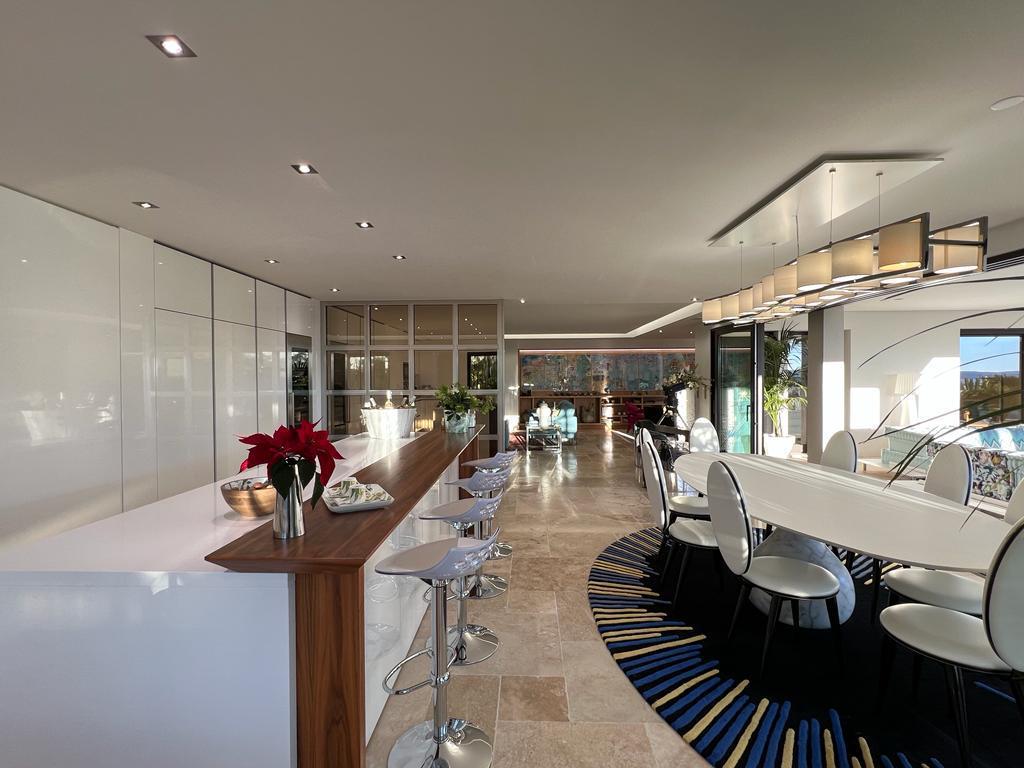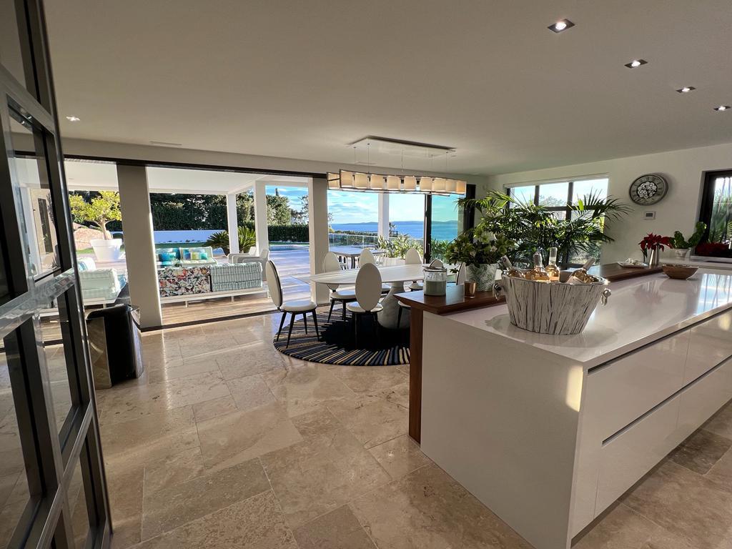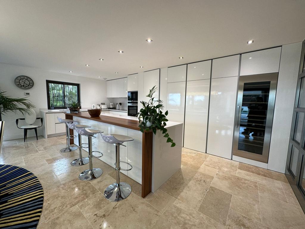 Cuisine ouverte avec cave à vins, four électrique, four micro ondes, réfrigérateur, congélateur, cafetière nespresso, machine à glacons, lave vaisselle, table de cuisson à gaz, grille pain et Terrasse couverte et aménagée avec vue mer