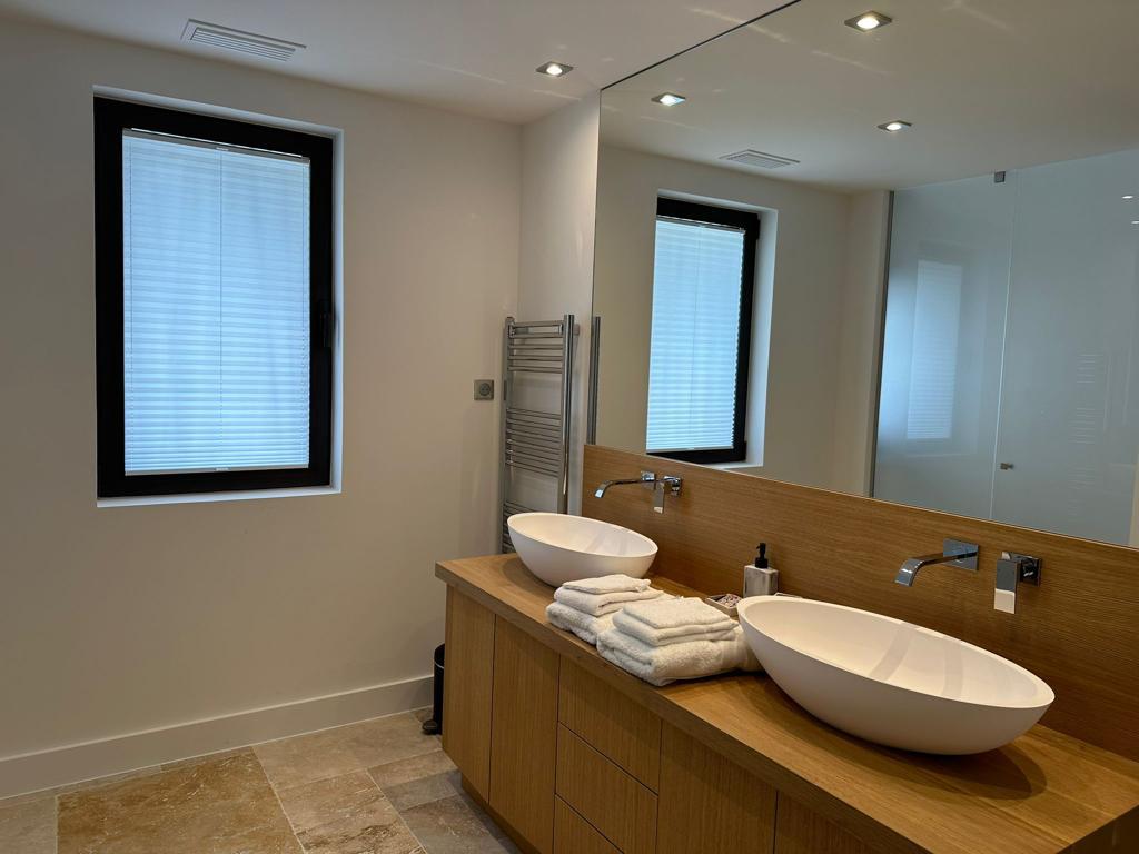 Chambre à lits jumeaux et Salle de bain en suite avec lavabo double, douche