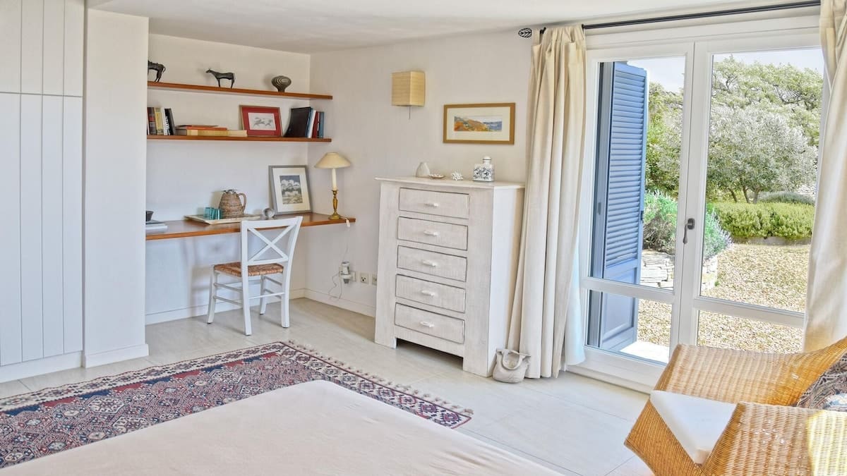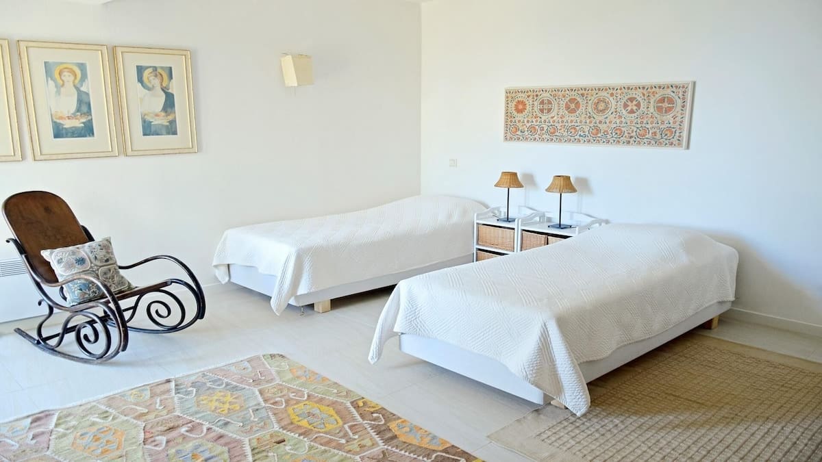 Chambre à lits jumeaux qui peuvent être joints et devenir lit double, possibilité d’ajouter un lit supplémentaire avec accès jardin et Salle de bain en suite