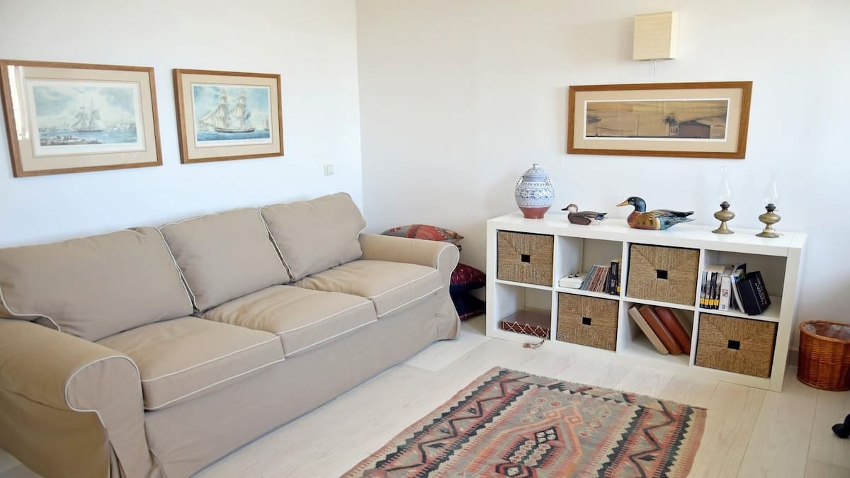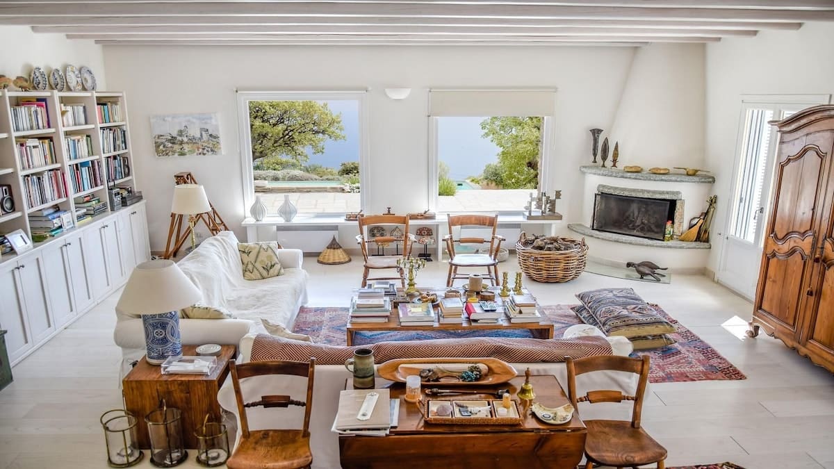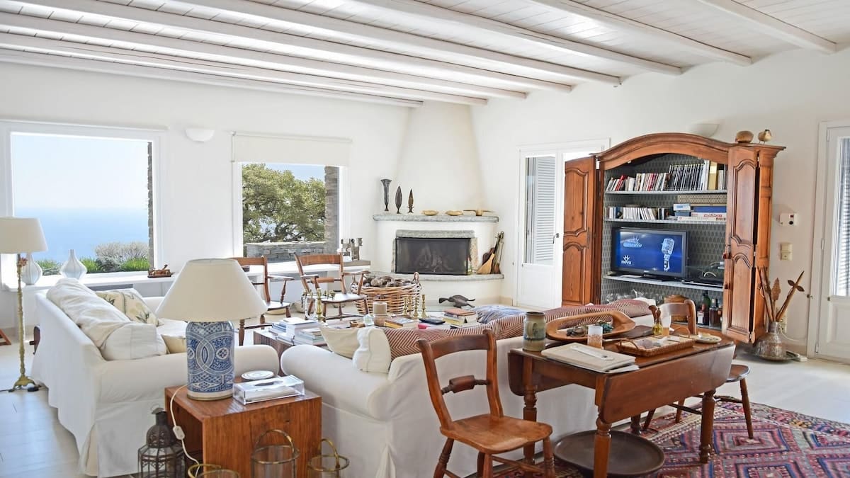 Salon avec cheminée, télévision, chaine hifi, vue mer