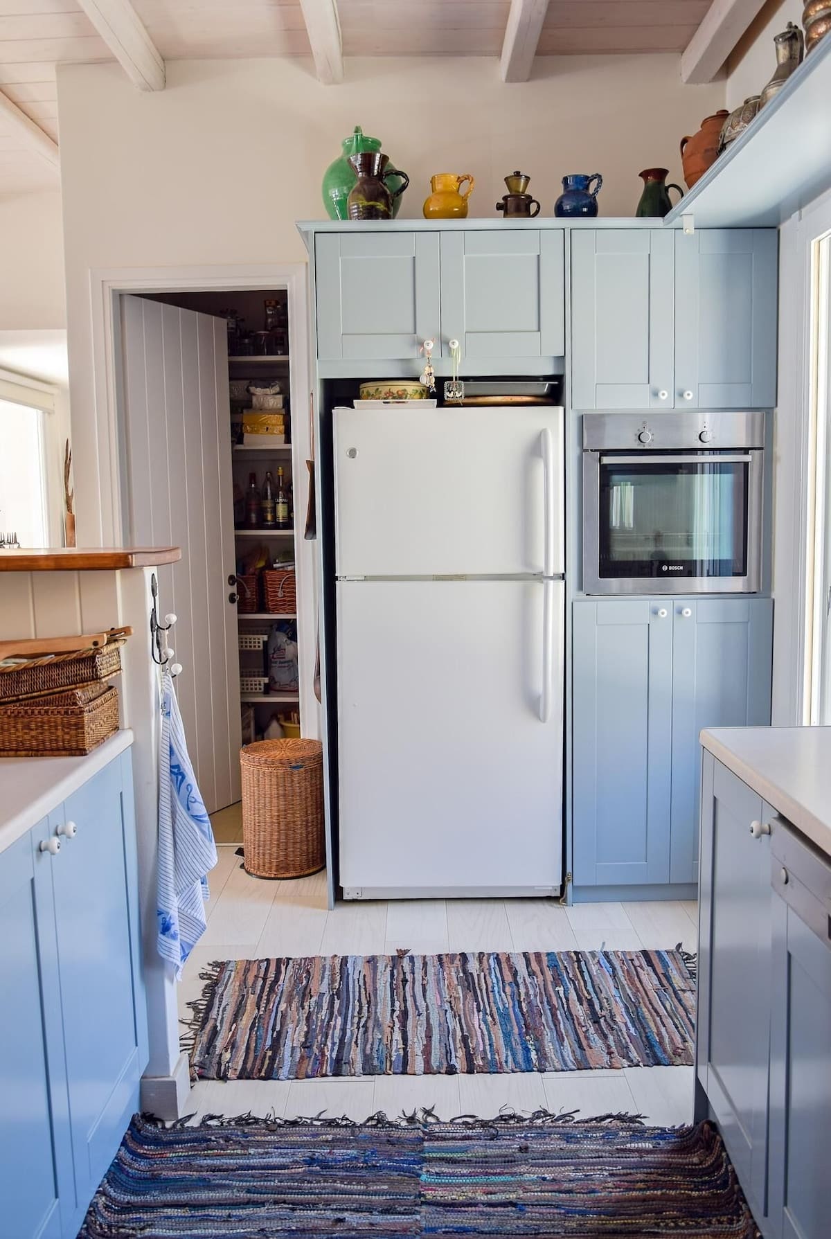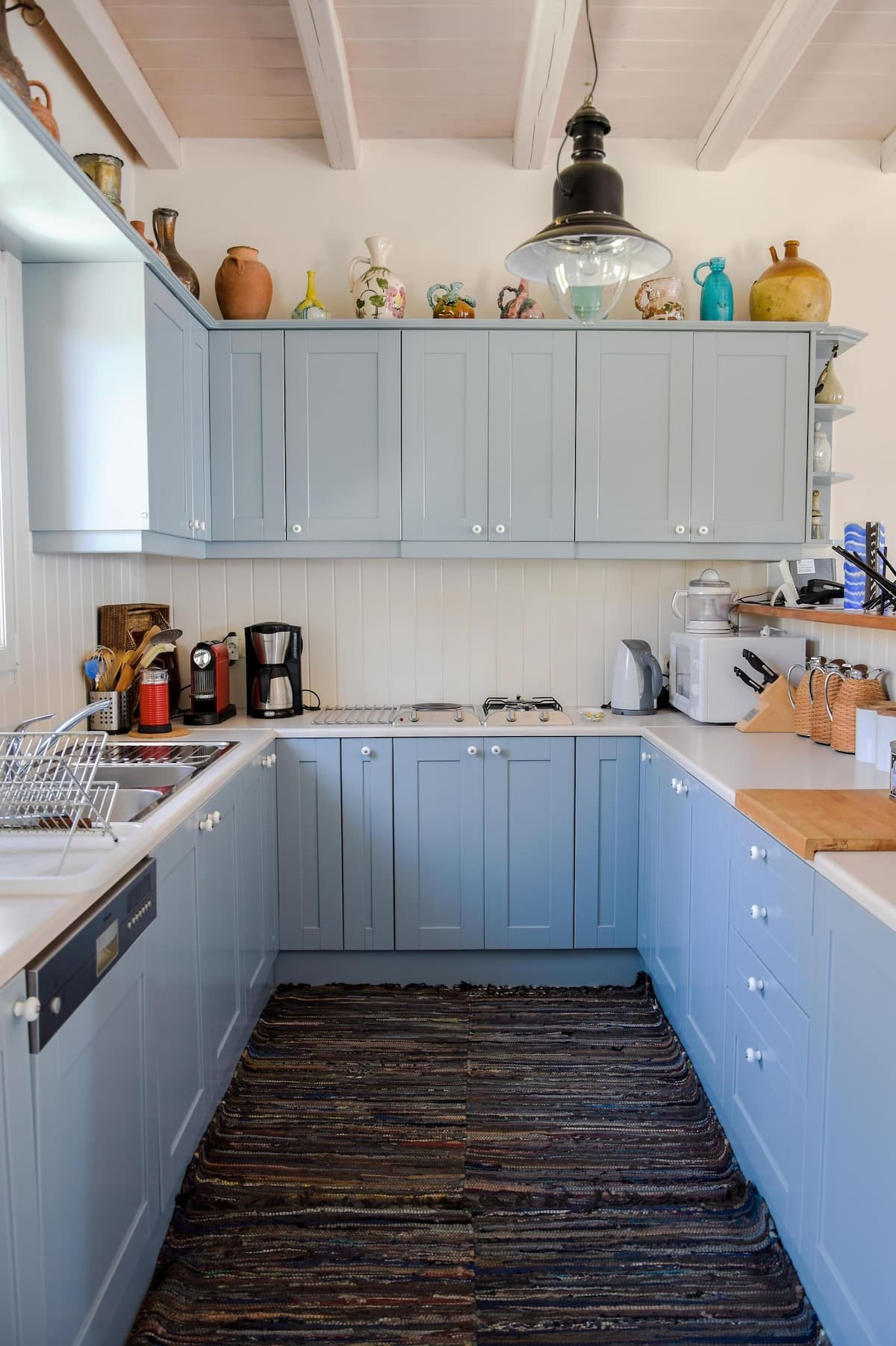 Cuisine ouverte avec réfrigérateur, lave vaisselle, four micro ondes, four électrique, cafetière, machine à expresso, bouilloire