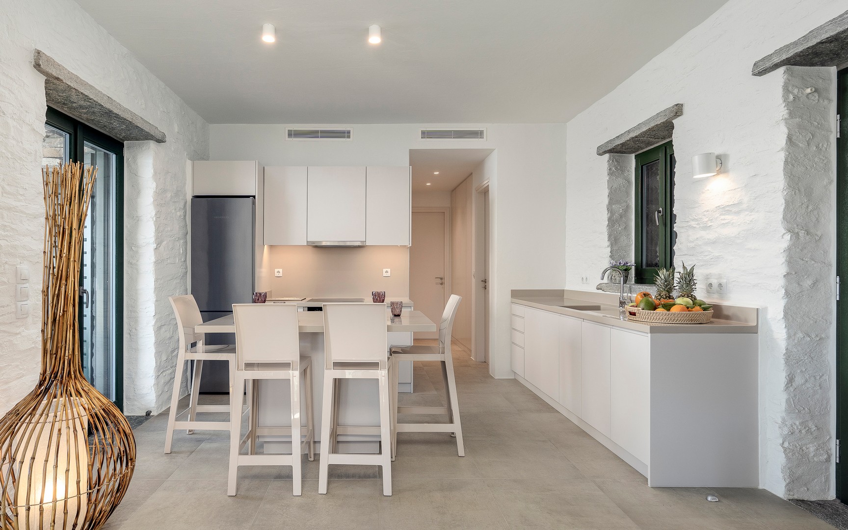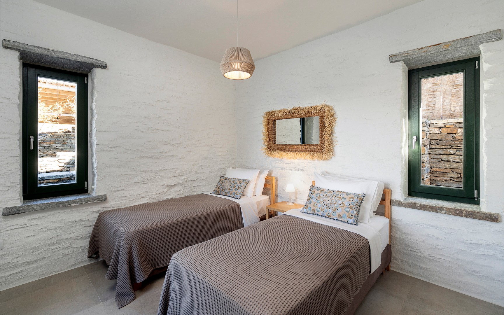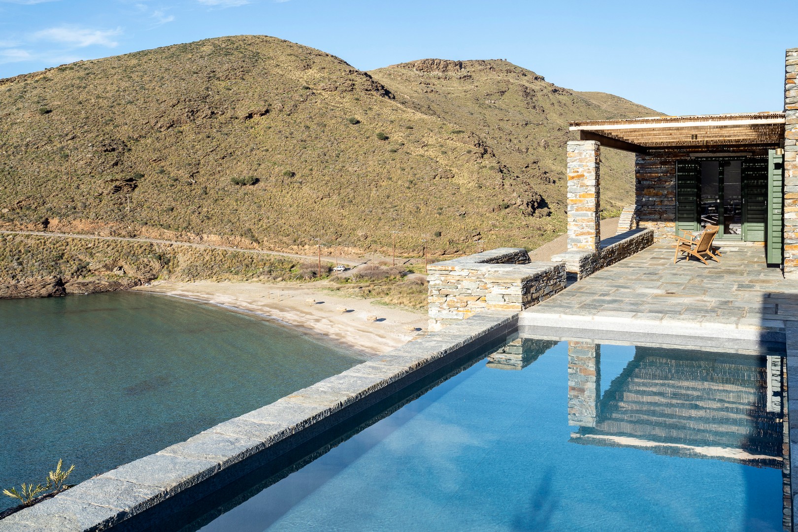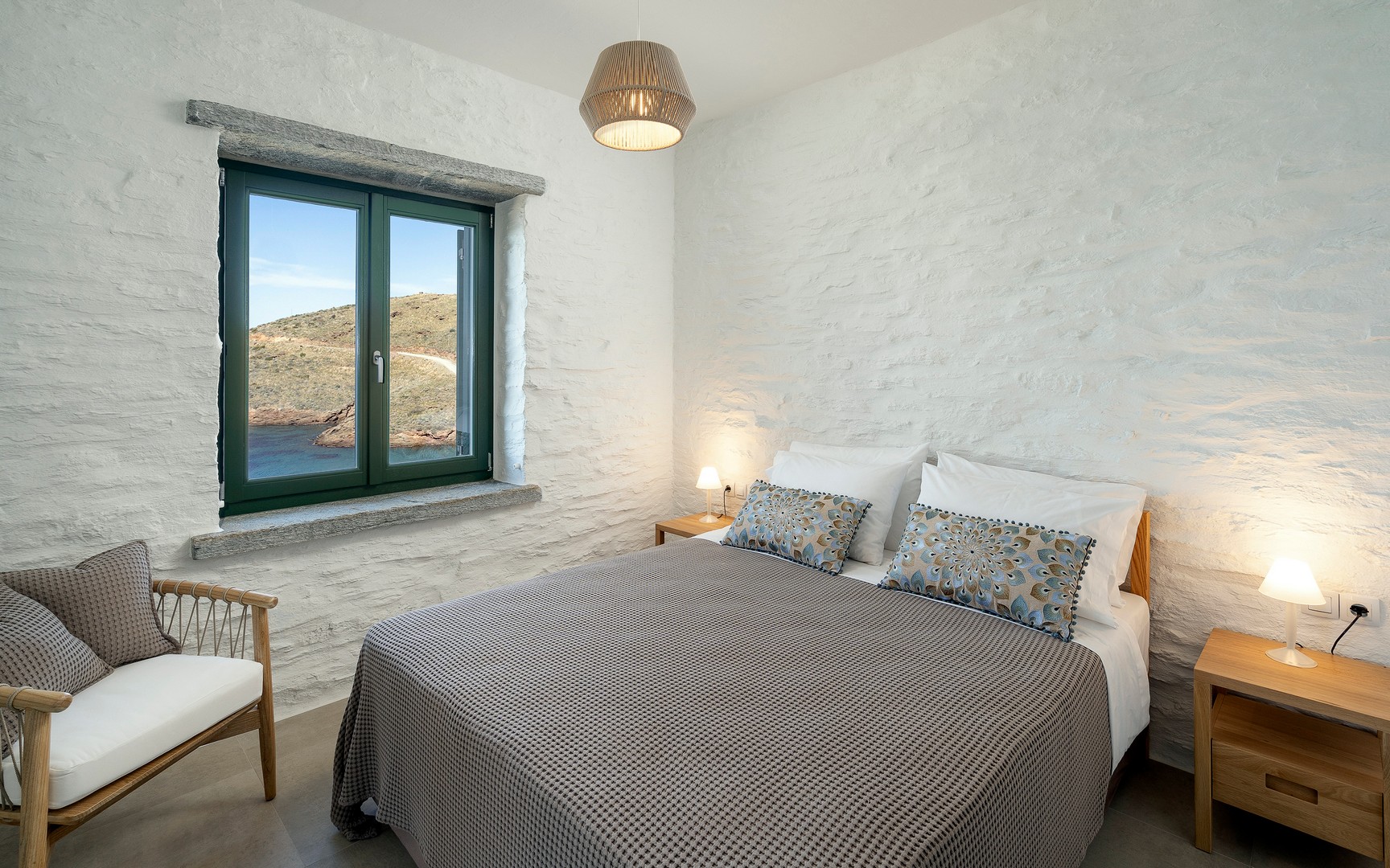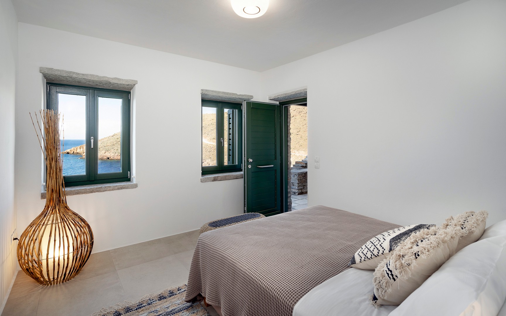 L’intérieur est sobre, très accueillant, dans un esprit cocooning très chaleureux qui vous donnera envie de rester. Entièrement neuve, elle est de plain-pied et est composée d’un espace de vie complètement ouvert qui vous permettra de profiter d’être tous ensemble. La superbe vue sur mer est également appréciable depuis l’intérieur de la villa, et il est impossible de s’en lasser. Vous trouverez dans cette villa 3 chambres et salles de bain attenantes avec douche qui peuvent accueillir jusqu’à 6 invités. La décoration est épurée, tout en restant moderne. Sur la terrasse est disposée une piscine profitant également du magnifique panorama sur la grande bleue ainsi que d’une table ombragée par une pergola. L’endroit est idéal pour les moments de convivialité face à ce paysage incroyable. Entre collines et ciel bleu, vous serez ici dans un cadre authentique et unique à l’entrée des Cyclades.