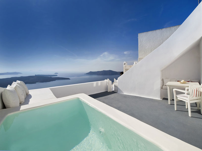 Ces suites luxueuses sont situées dans la région la plus convoitées de l'île de Santorin, en position la plus élevée de la Caldera, dans le village pittoresque d'Imerovigli. Chaque angle des suites offre des vues extraordinaires sur le volcan, la mer et les îles voisines.