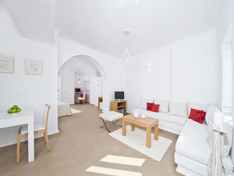 Le design intérieur et l'architecture se situent entre le style traditionnel cycladique et le style contemporain. Les suites sont parfaites pour des hôtes qui recherchent l'élégance et une échappatoire. La sensation d'être au sommet du monde fait que les invités oublient qu'ils se situent sur l'une des îles les plus cosmopolites de la Grèce.