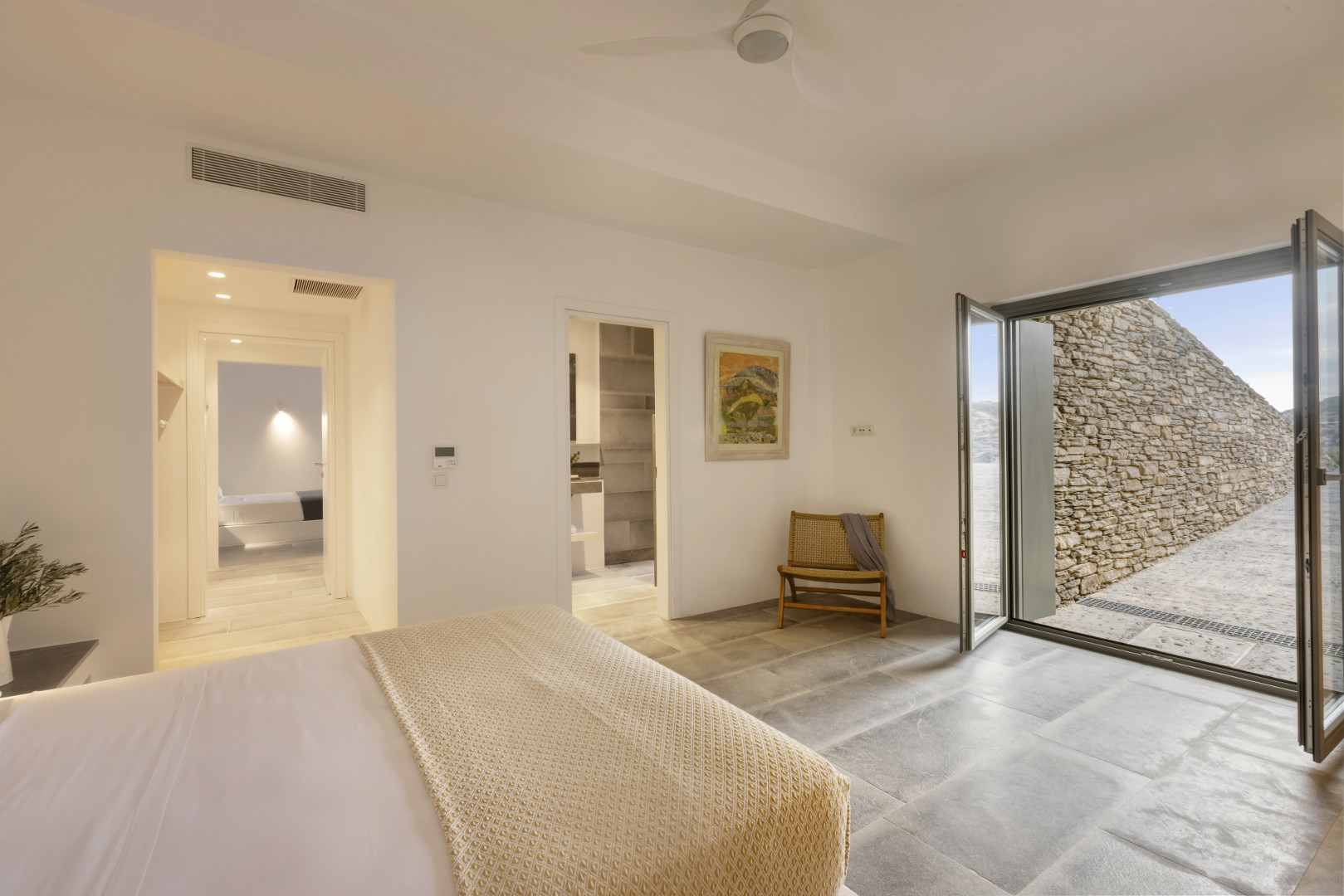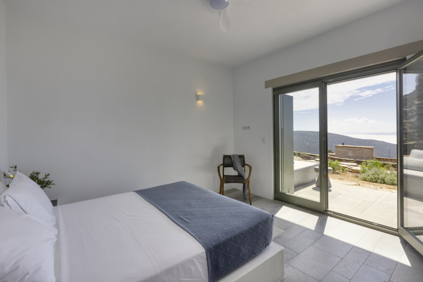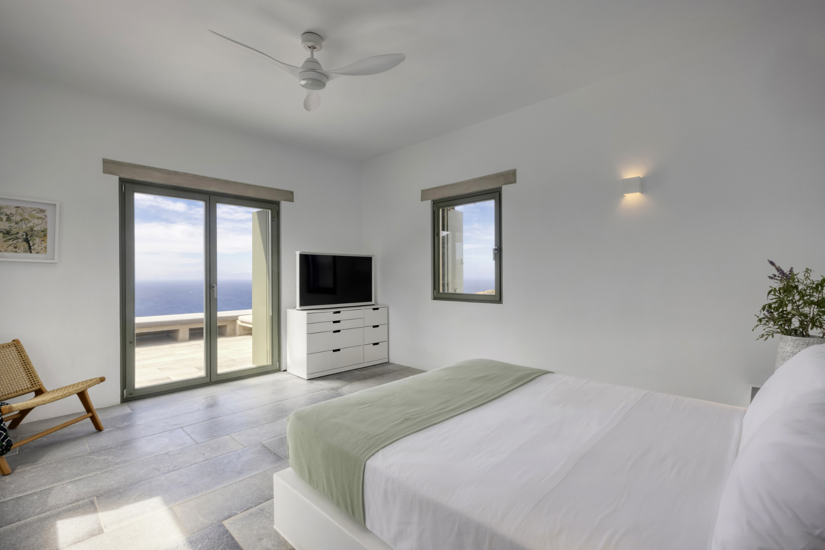 Chambre de Maître avec lit 160, dressing, climatisation, ventilateur et Salle de bain en suite avec douche et Terrasse avec vue mer