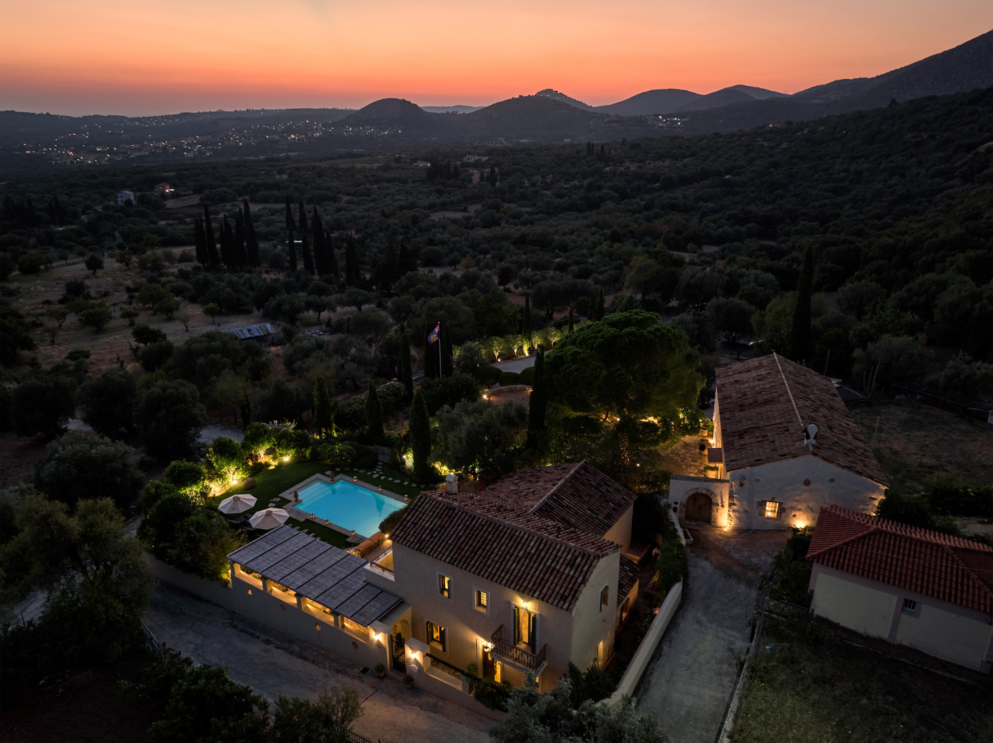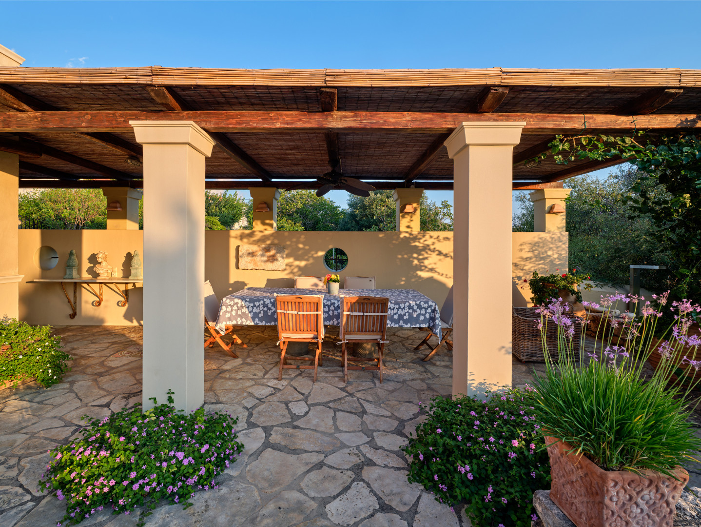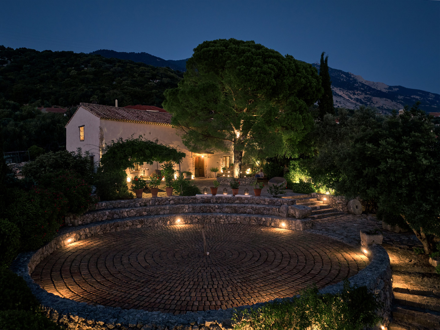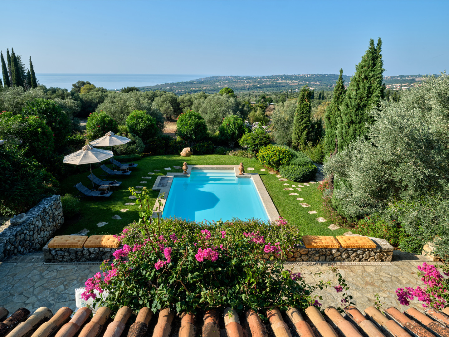 La villa, qui se trouve sur un terrain séparé par un mur et des arbres du reste de la propriété ainsi que du vieux moulin adjacent (habité par les propriétaires), a été nouvellement construite et peut accueillir aussi bien un groupe d'amis qu'une famille. Elle est construite de tuiles anciennes et décorée avec beaucoup de goût, des pièces de collectionneurs et une très belle vue panoramique sur la vallée et la mer Ionienne. Une des particularités de cette villa est sa piscine (11 x5 m), de style Toscan (marches) qui s'étend vers la spacieuse terrasse de la maison. Le superbe jardin offre un cadre naturel charmant. Les chiens ne sont pas acceptés.