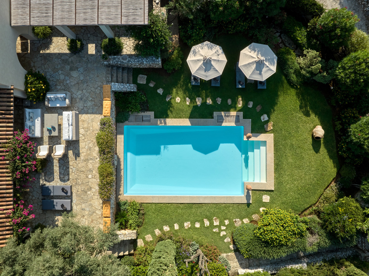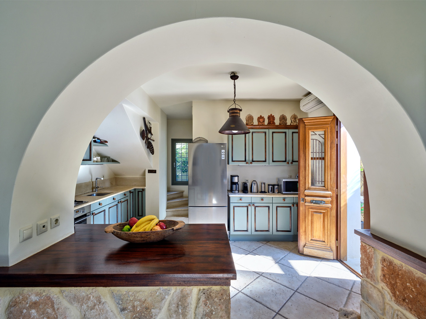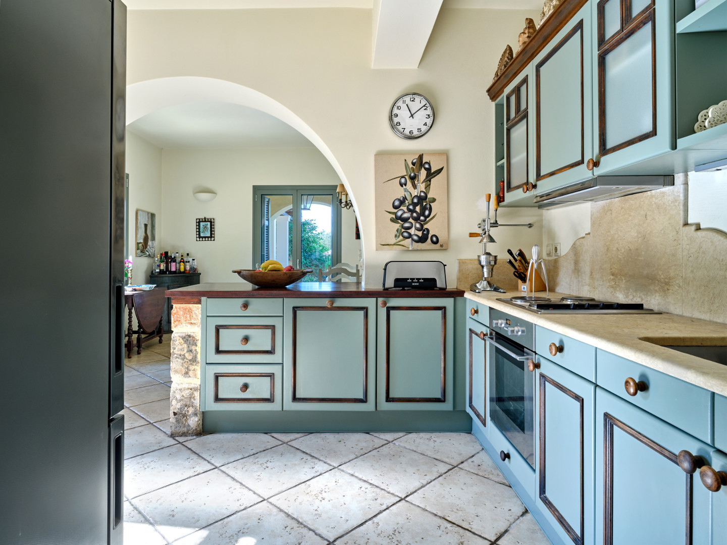 La villa, qui se trouve sur un terrain séparé par un mur et des arbres du reste de la propriété ainsi que du vieux moulin adjacent (habité par les propriétaires), a été nouvellement construite et peut accueillir aussi bien un groupe d'amis qu'une famille. Elle est construite de tuiles anciennes et décorée avec beaucoup de goût, des pièces de collectionneurs et une très belle vue panoramique sur la vallée et la mer Ionienne. Une des particularités de cette villa est sa piscine (11 x5 m), de style Toscan (marches) qui s'étend vers la spacieuse terrasse de la maison. Le superbe jardin offre un cadre naturel charmant. Les chiens ne sont pas acceptés.