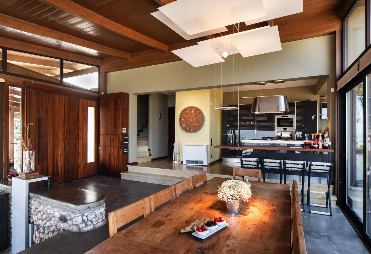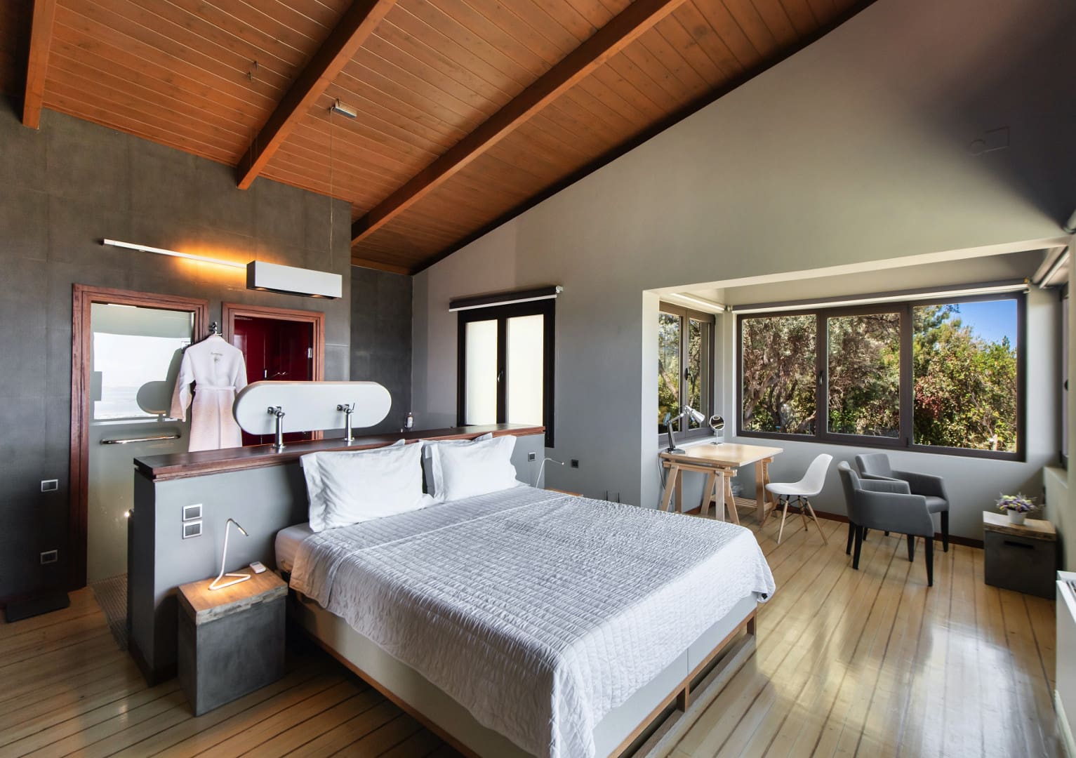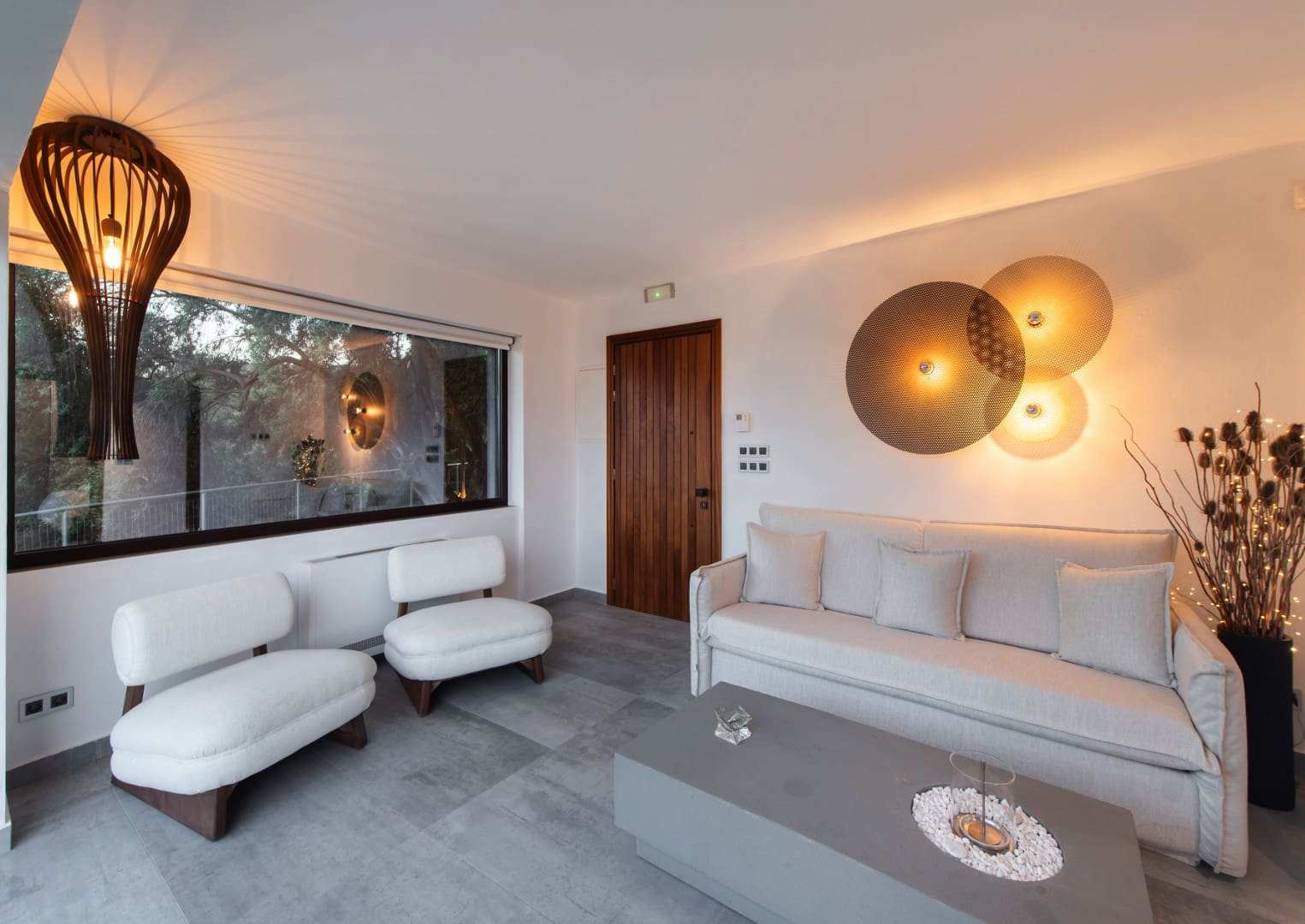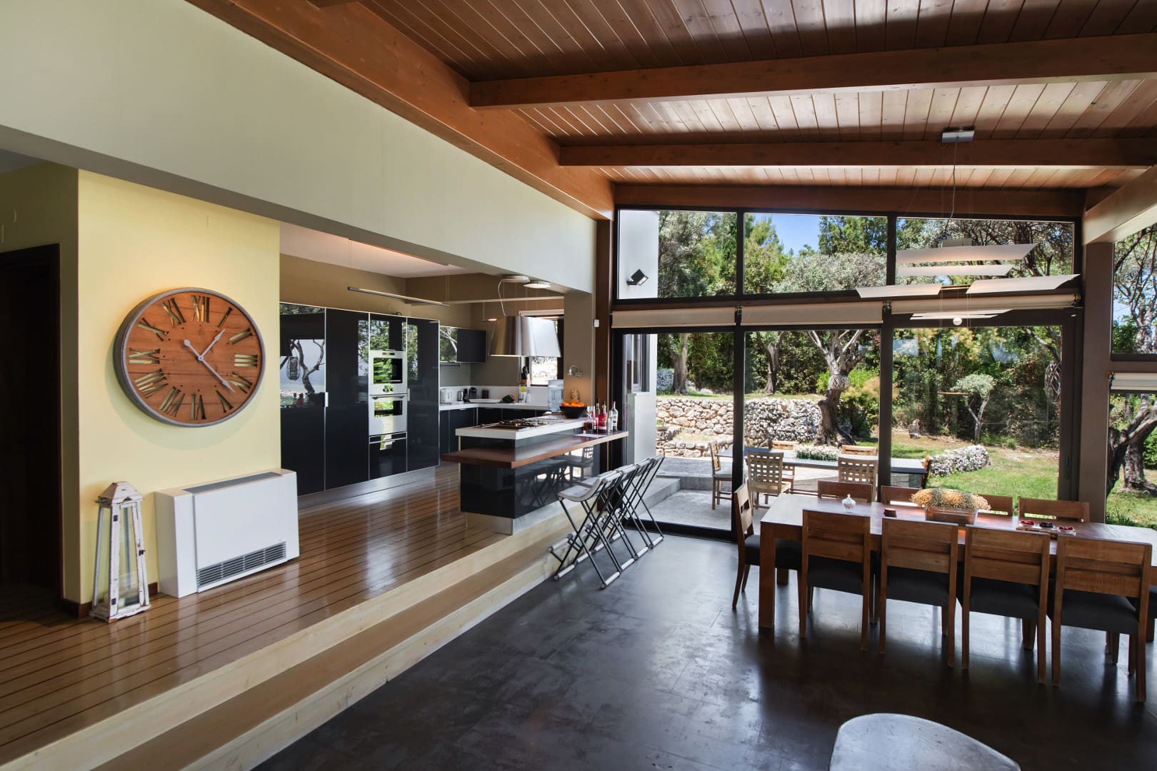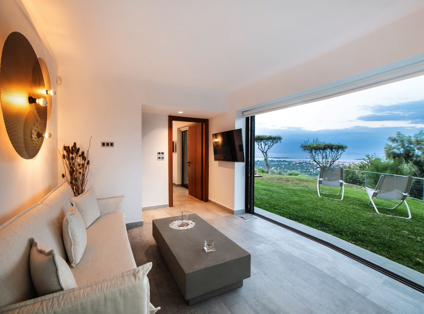 La villa a été dessinée par un designer grec connu qui a profiter de cet environnement luxuriant pour utiliser des matériaux écologique. La villa avec ses baies vitrées est baignée par la lumière et profite des magnifiques vues à partir du séjour et de la salle à manger, tandis que les oliviers qui s’élève sur le devant de la villa donnent une sensation d’être en pleine nature.