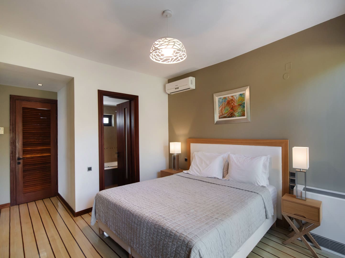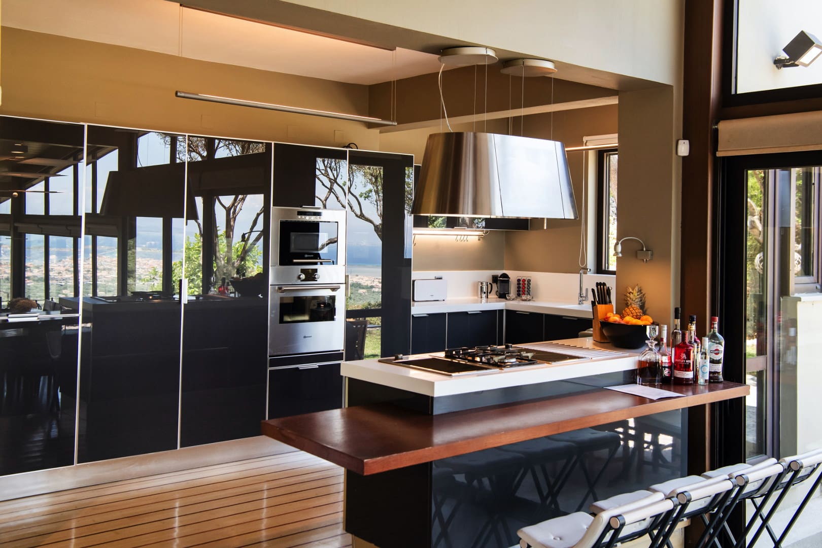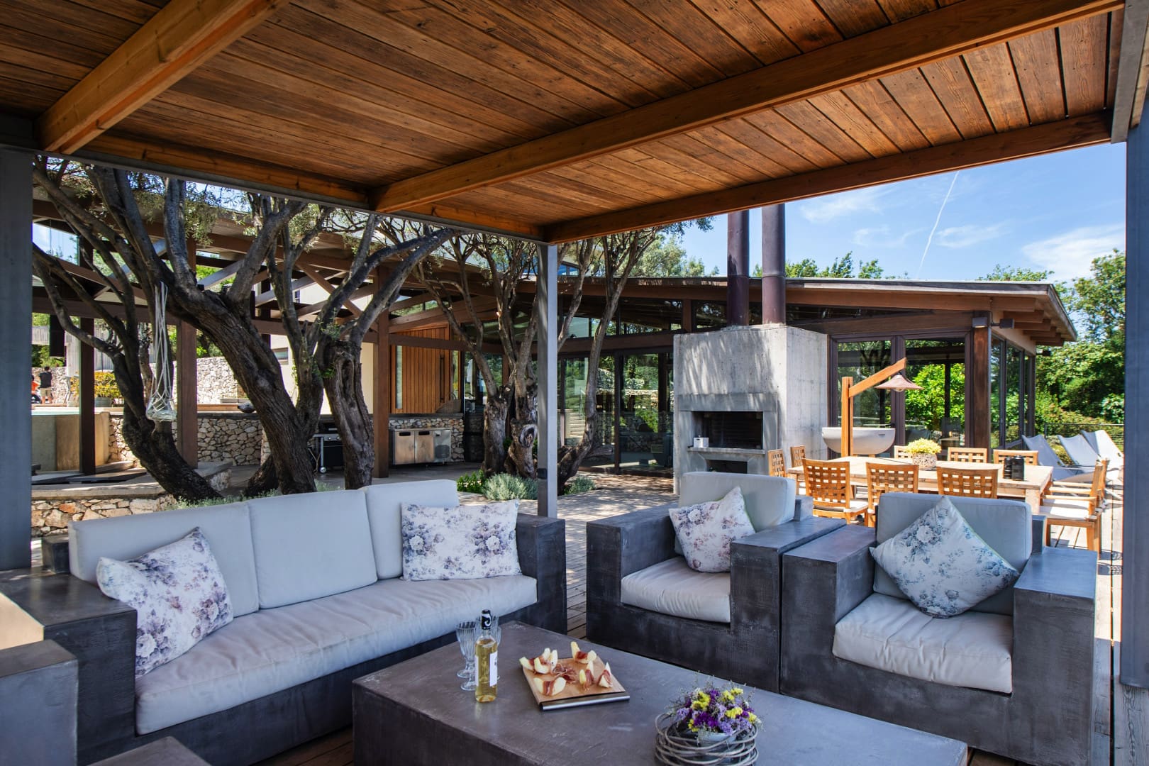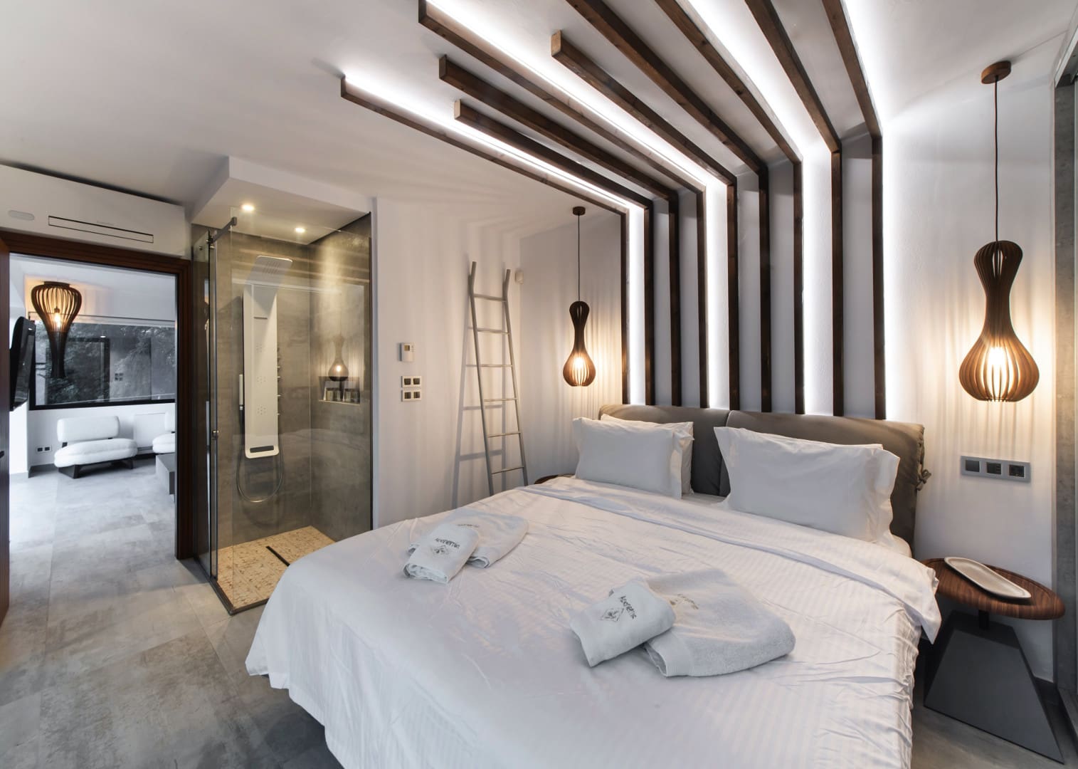 La villa a été dessinée par un designer grec connu qui a profiter de cet environnement luxuriant pour utiliser des matériaux écologique. La villa avec ses baies vitrées est baignée par la lumière et profite des magnifiques vues à partir du séjour et de la salle à manger, tandis que les oliviers qui s’élève sur le devant de la villa donnent une sensation d’être en pleine nature.