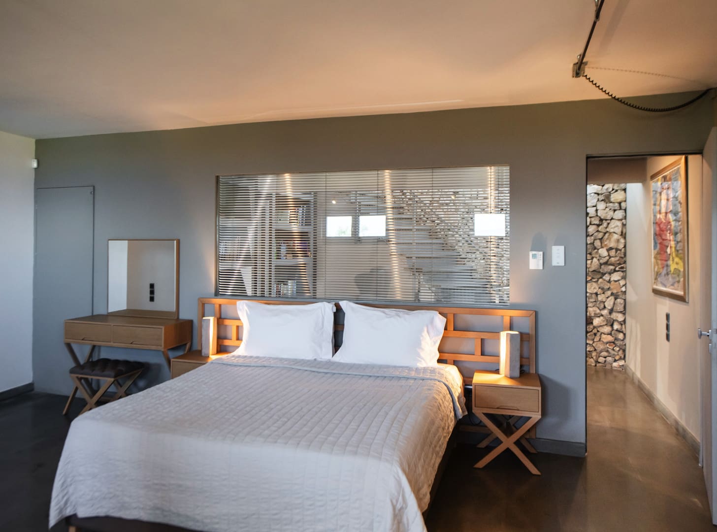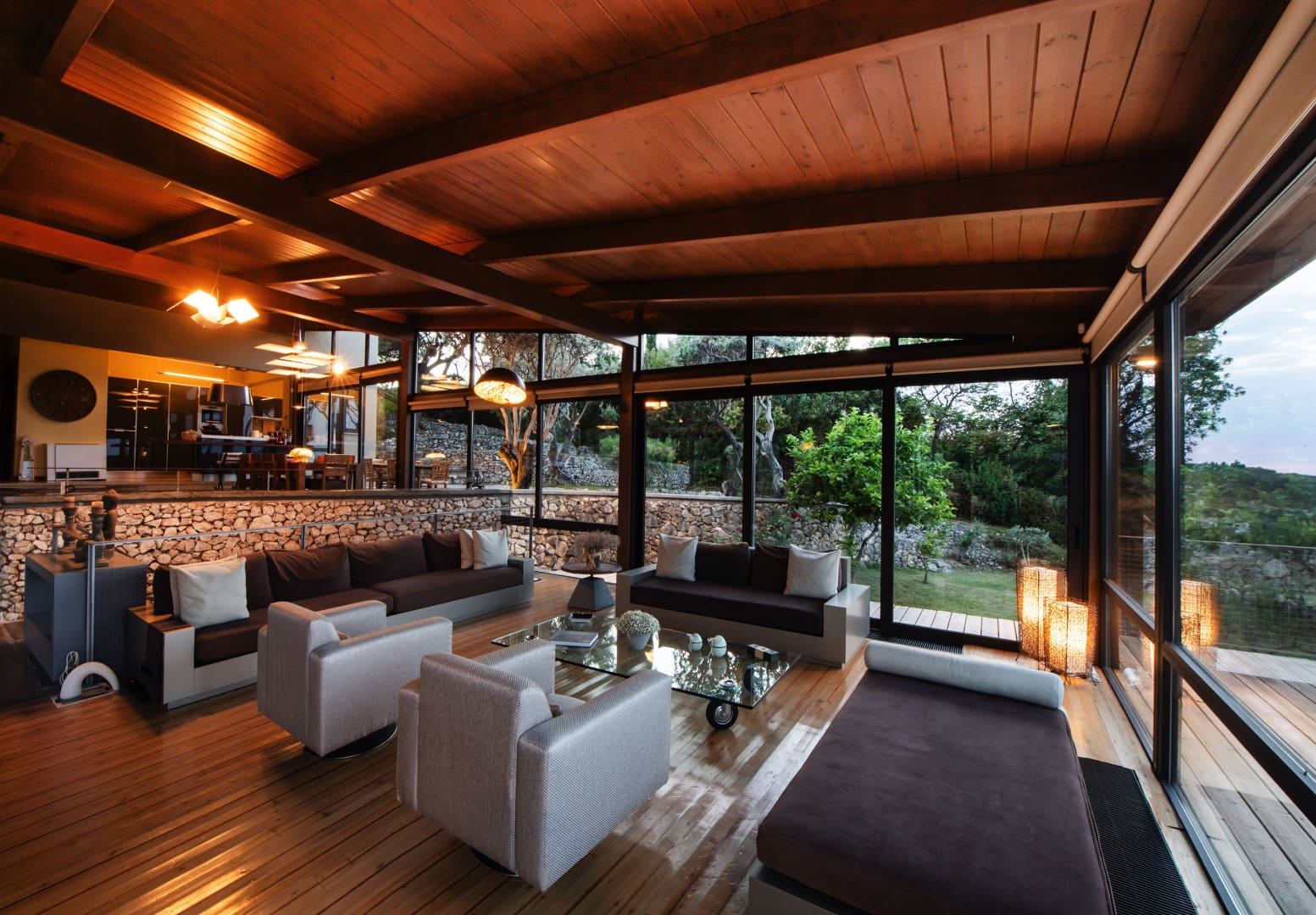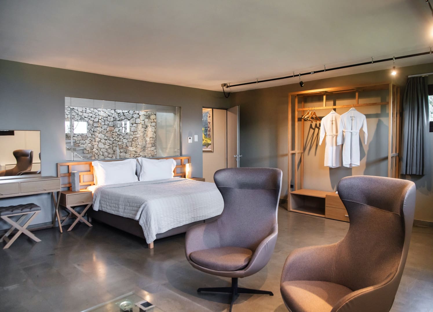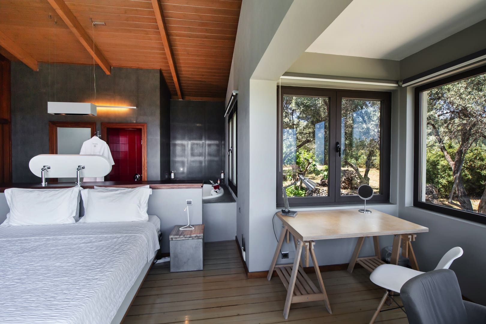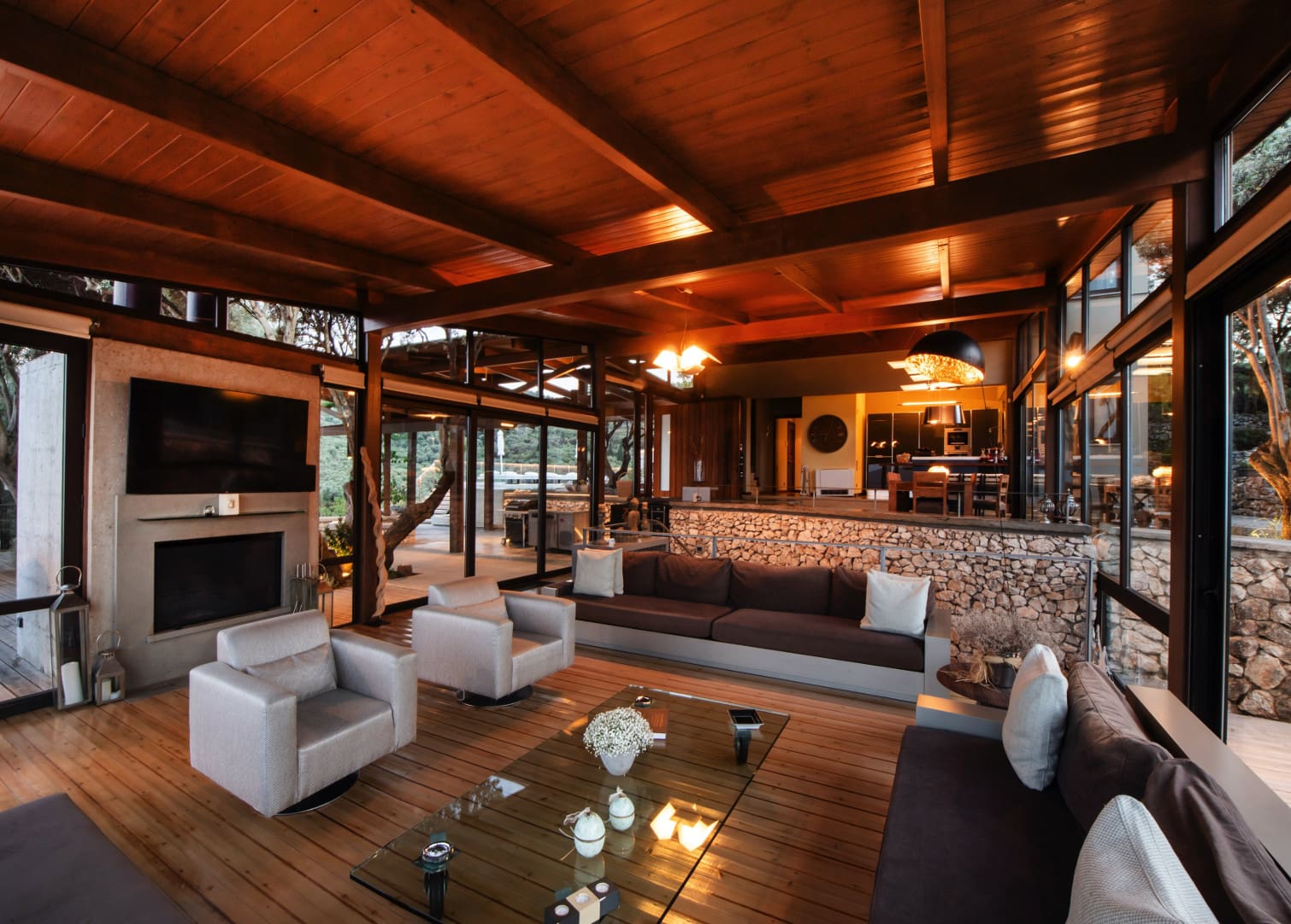 La villa a été dessinée par un designer grec connu qui a profiter de cet environnement luxuriant pour utiliser des matériaux écologique. La villa avec ses baies vitrées est baignée par la lumière et profite des magnifiques vues à partir du séjour et de la salle à manger, tandis que les oliviers qui s’élève sur le devant de la villa donnent une sensation d’être en pleine nature.