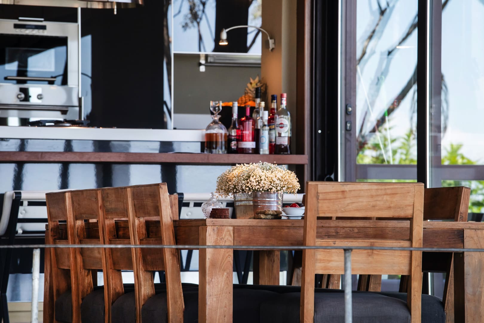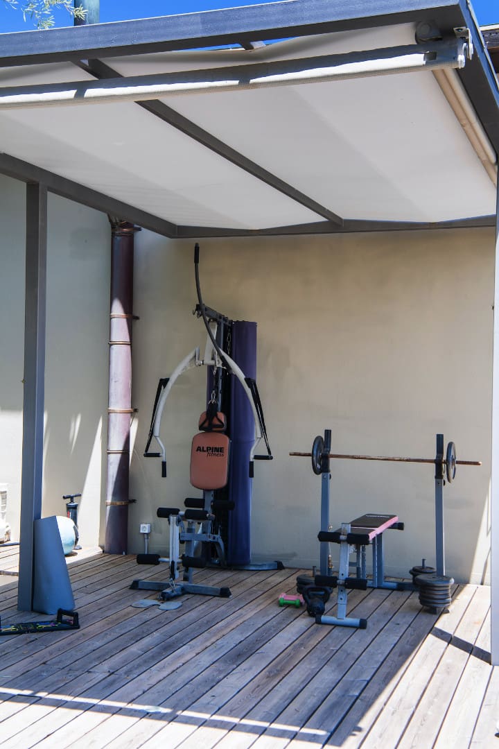 Extérieurs de 900 m2 ombragés, piscine privée, barbecue construit, espace dinatoire, chaises longues, parking privé.