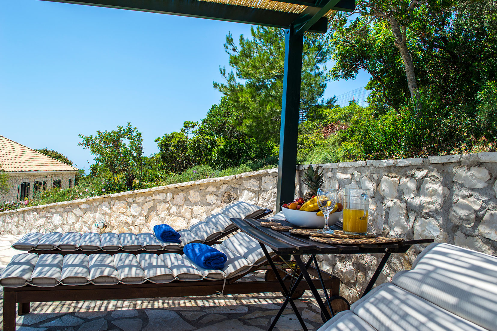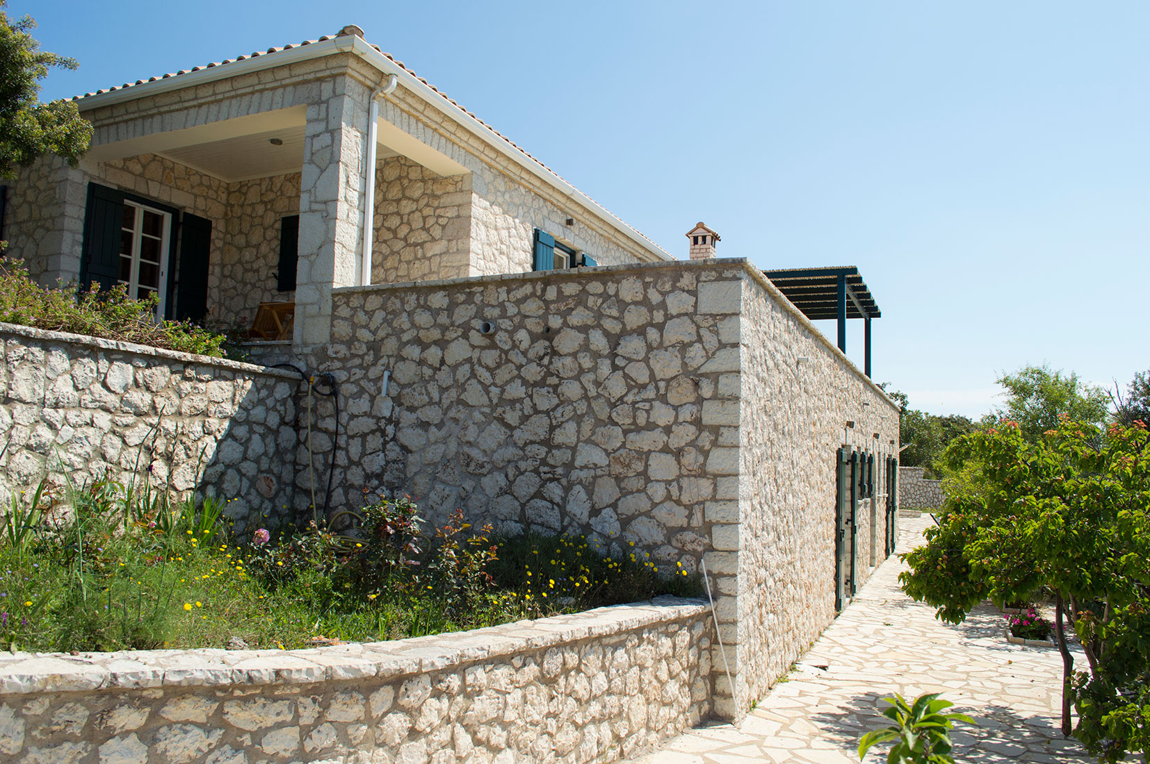 Le jardin est joliment arboré et fleuri, thym, oliviers, cyprès, tout est protégé par des murs en pierre se trouvent autours des terrasses. Il y a également des vignes, des figuiers et des petits arbres fruitiers.
