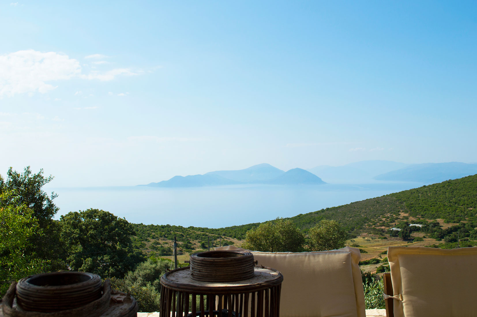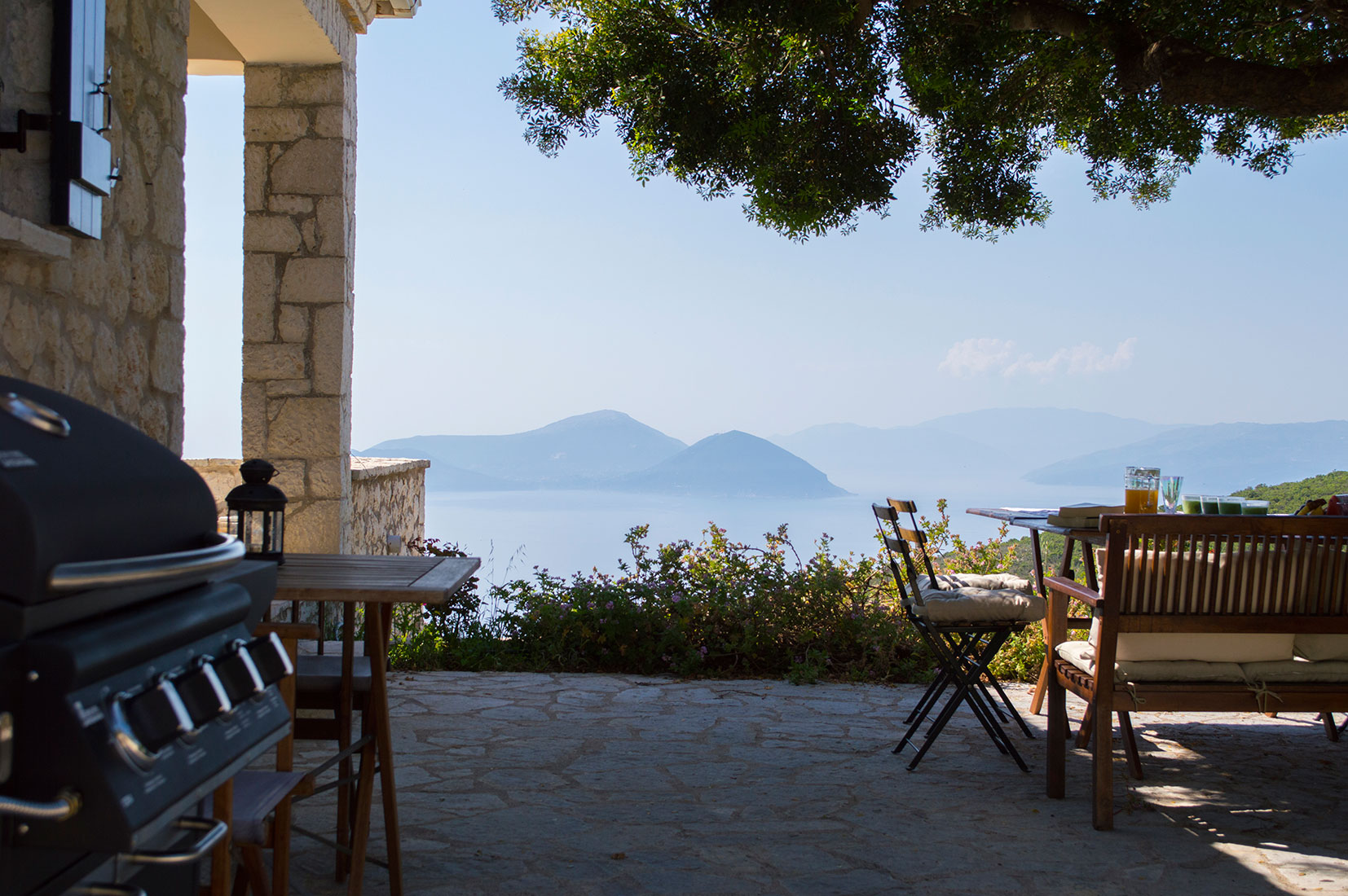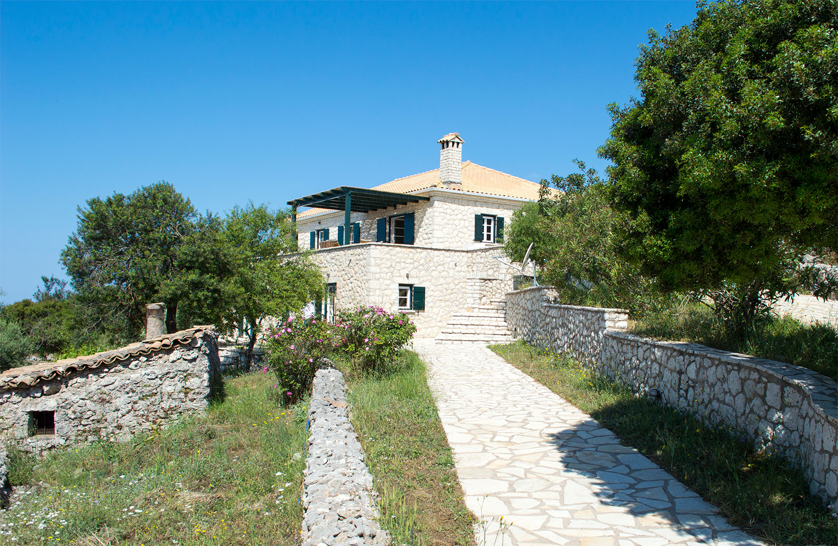 La villa a été construite à partir de matériaux naturels, toit en tuile, poutres apparentes et ossatures extérieures et intérieures en bois, sur 2 niveaux et complètement adapté à l'environnement naturel. Les deux étages communiquent par un escalier intérieur mais ils ont également un accès indépendant via la cours. Toutes les pièces disposent de grandes vérandas et ont une belle vue sur la mer et les îles d'Ithaque et Céphalonie ainsi que de nombreuses petites îles environnantes.