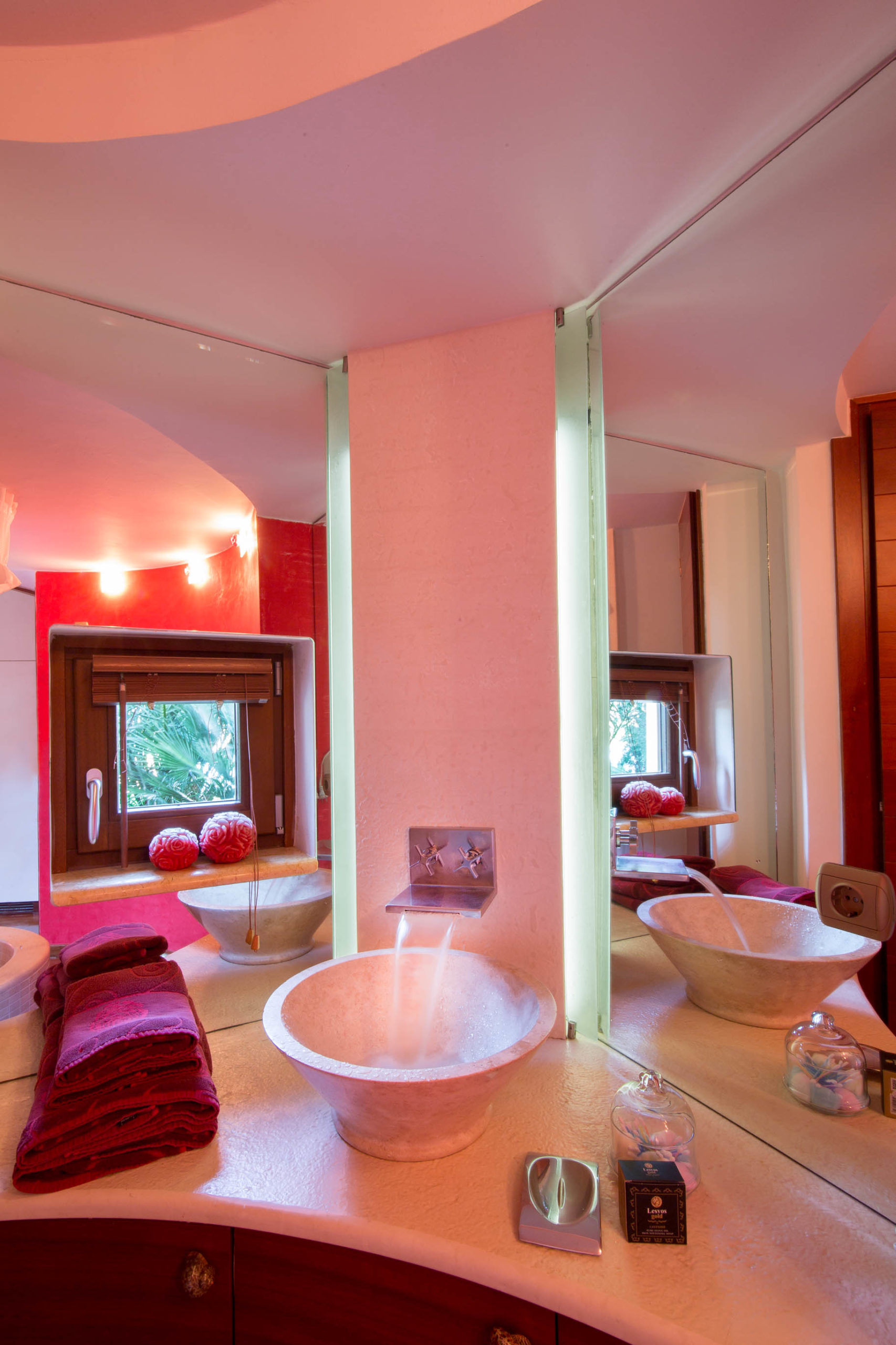 La villa a été construite avec le plus bel ameublement utilisant des matériaux luxueux et des accessoires en bois et en marbre. Le toit de la villa est une fenêtre circulaire à ciel ouvert. L'escalier a été fait main en bois et métal. Les intérieurs sont principalement dans les tons crème et jaune avec un ameublement contemporain italien lumineux.