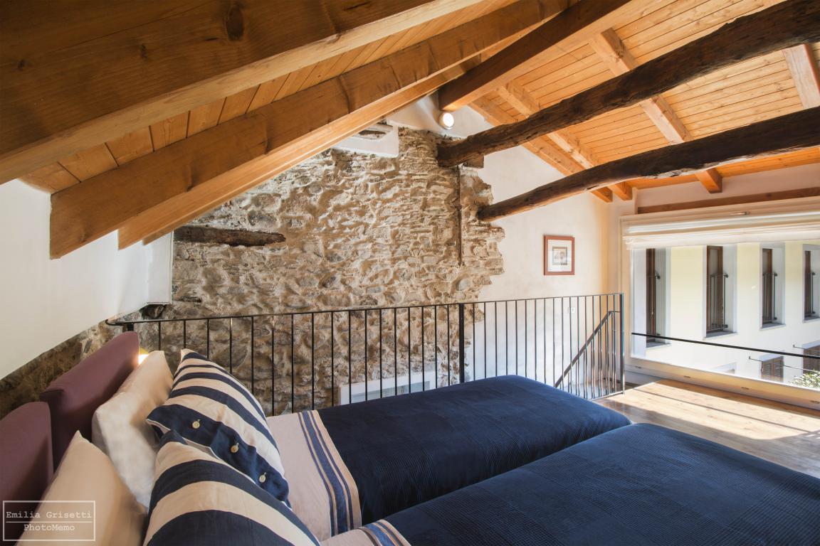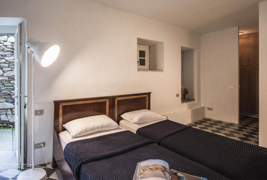Chambre à lits jumeaux convertible en double, accessible uniquement par la terrasse ou par l’autre chambre, vue lac avec ventilateur