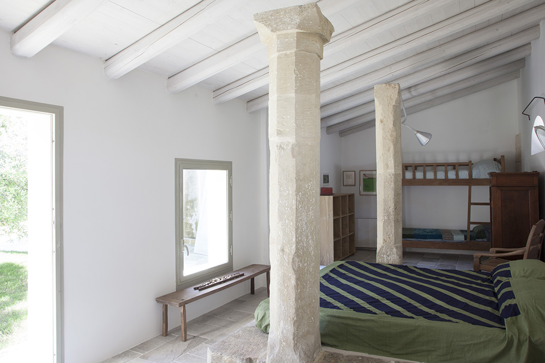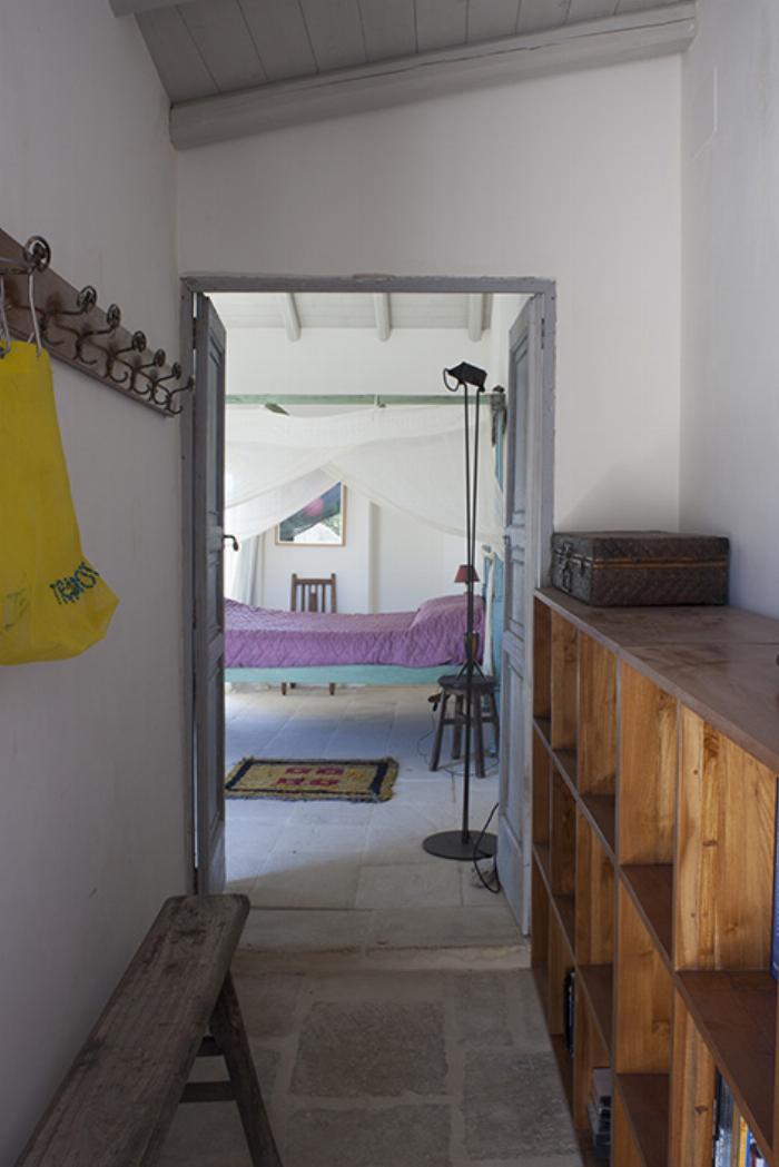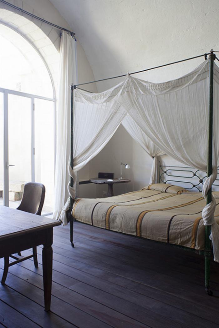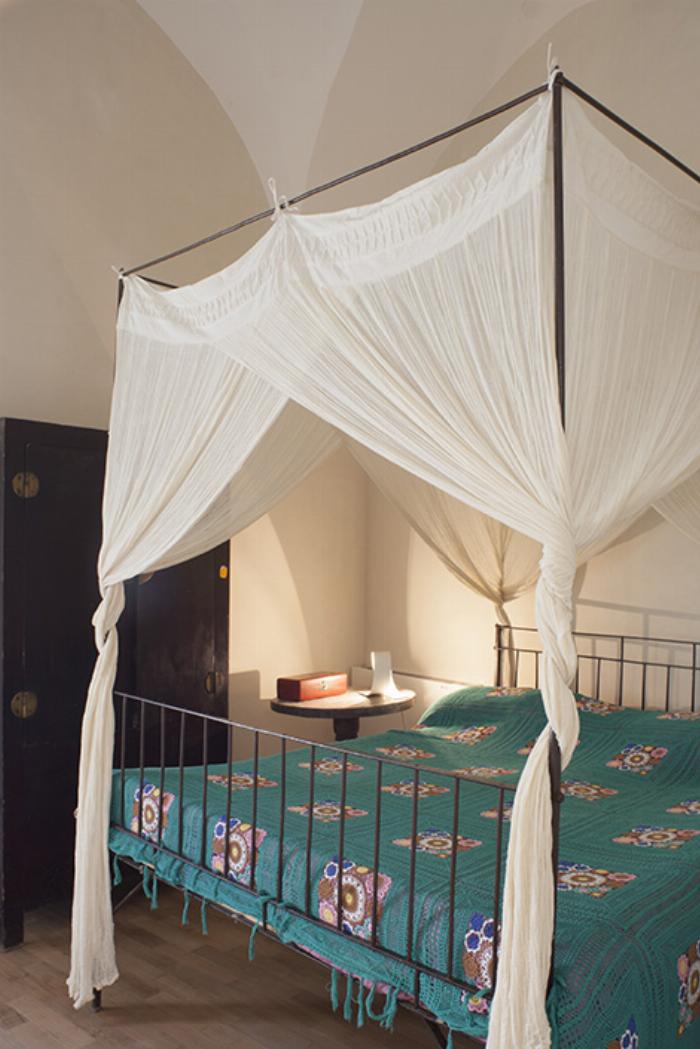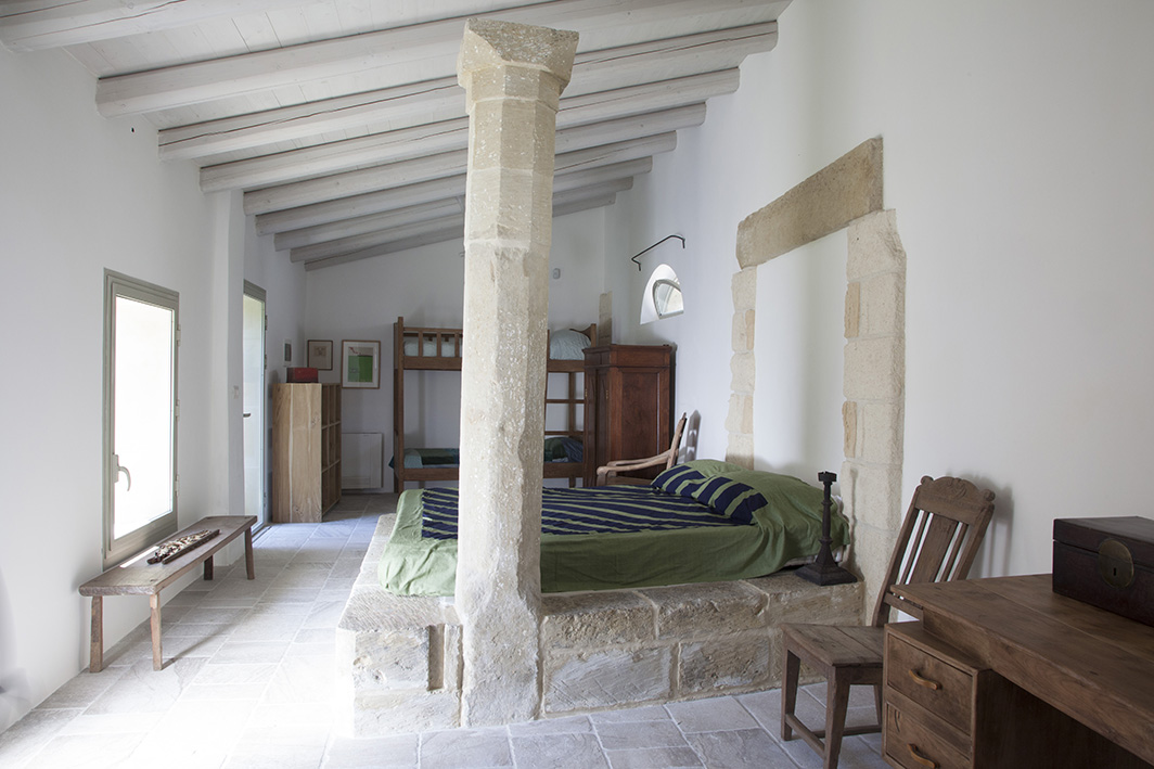 Chambre double avec plafond en bois, lit à baldaquin en pierre et lit superposé avec accès jardin, climatisation