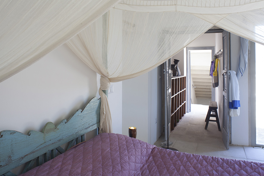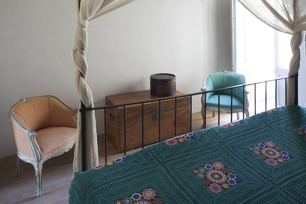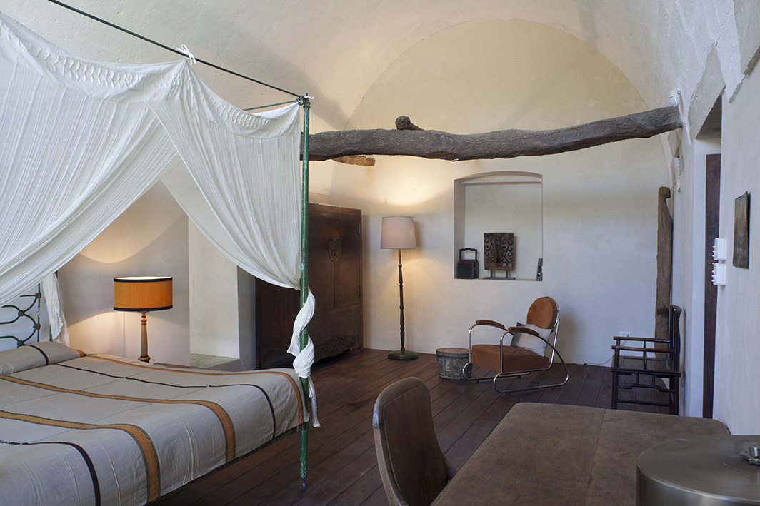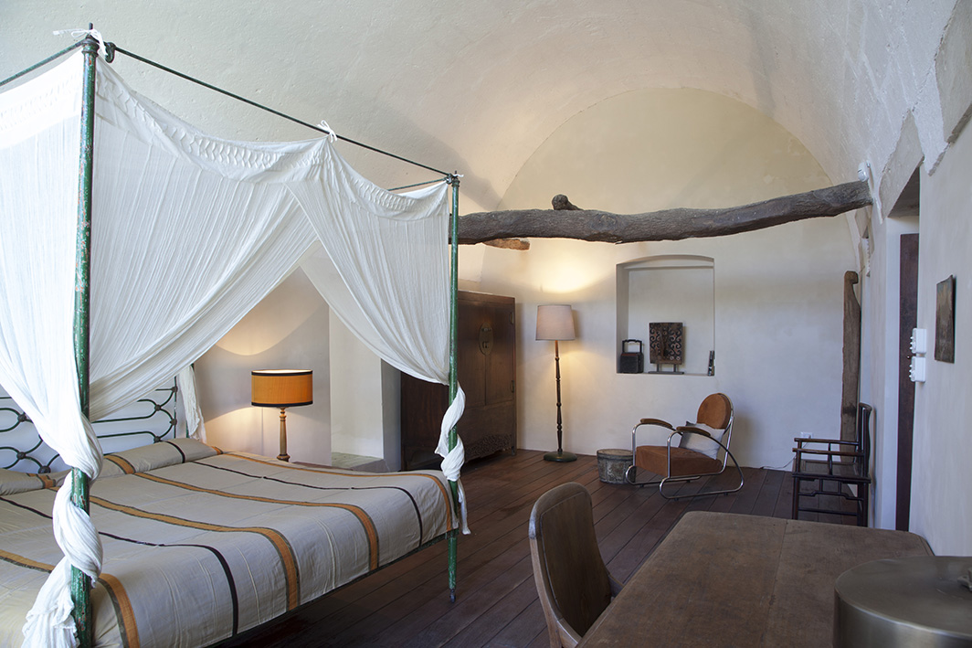 Chambre double avec plafond en bois, lit à baldaquin en pierre et lit superposé avec accès jardin, climatisation