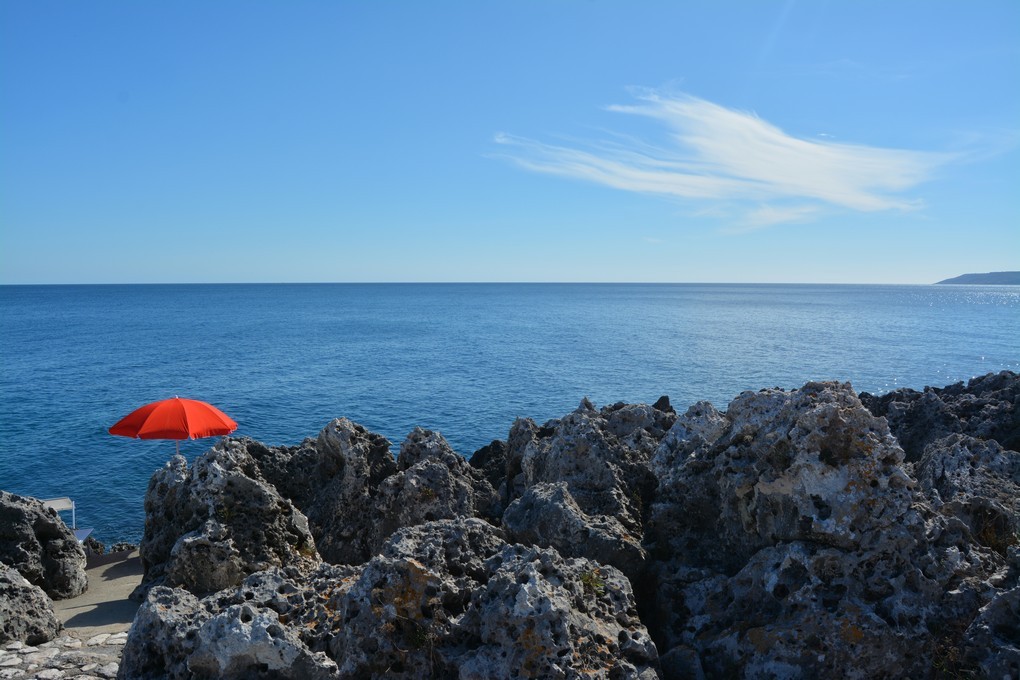 Quelques marches plus bas, se trouve une autre terrasse aménagée avec des bancs typiques en pierres, offrant elle aussi une vue sur la mer à couper le souffle.