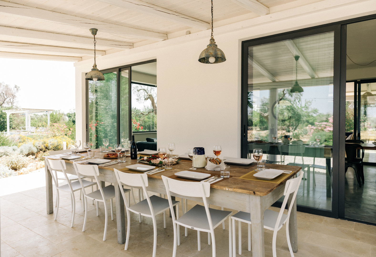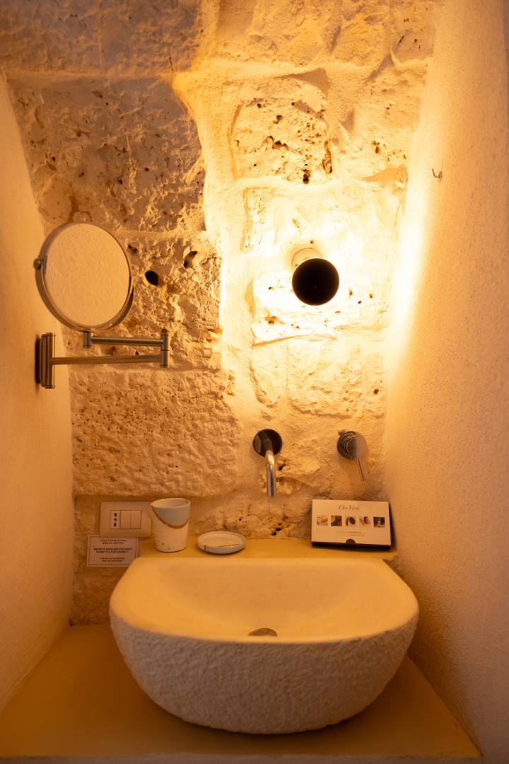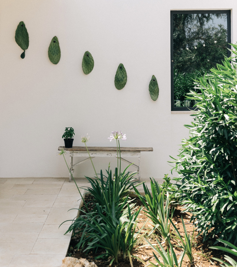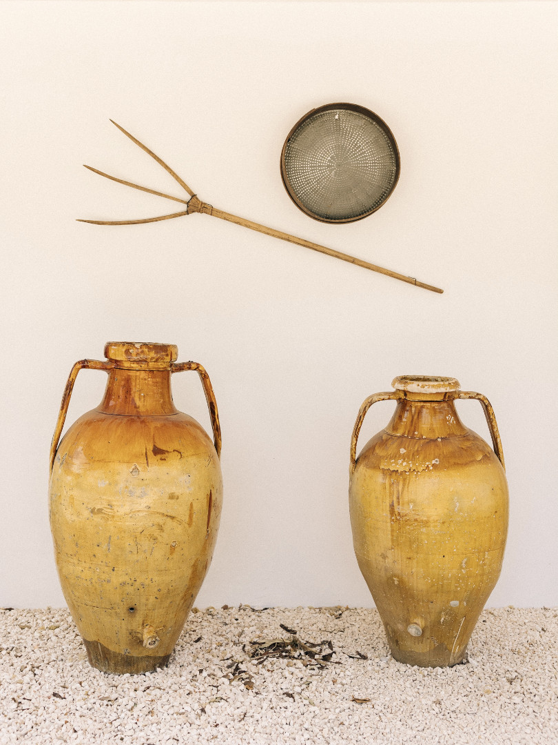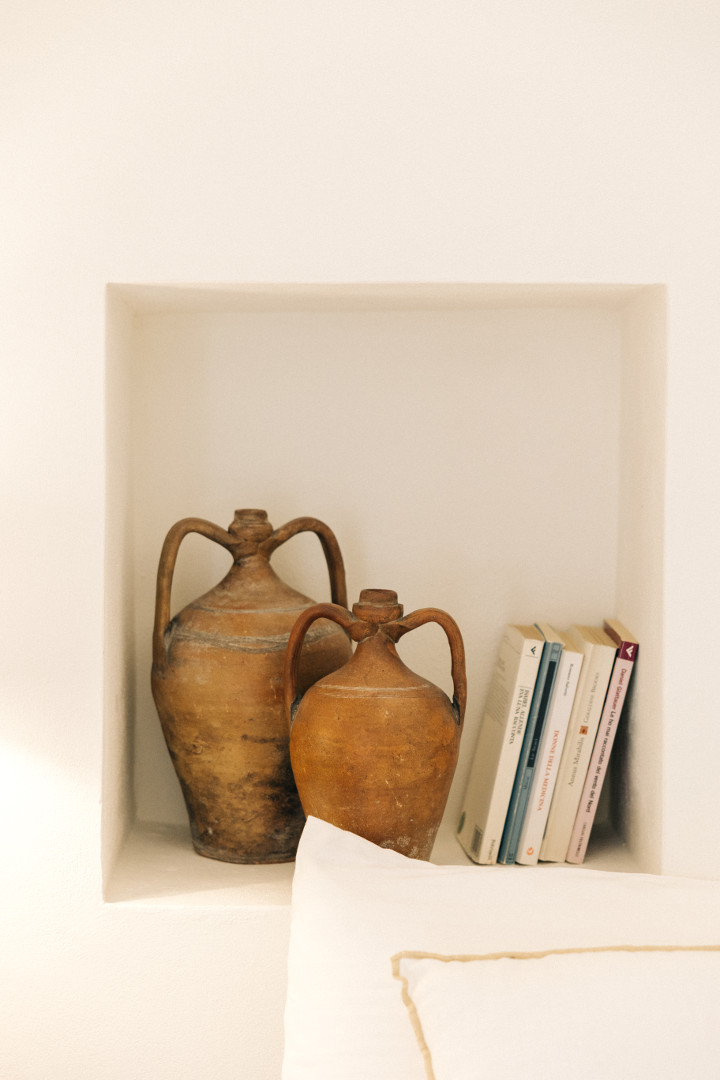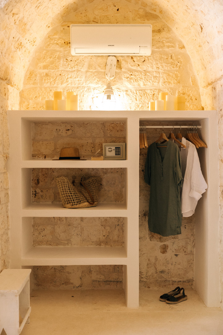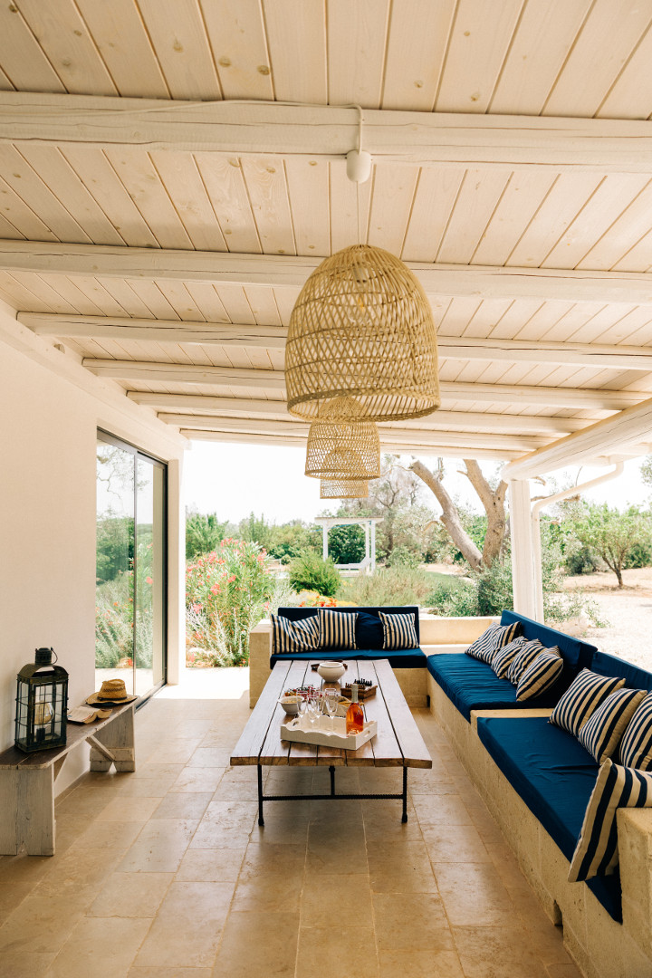 À l’intérieur, la villa mêle harmonieusement élégance rustique et raffinement contemporain. Les pièces à vivre, baignées de lumière grâce aux grandes ouvertures, créent une atmosphère chaleureuse et délicate où matières naturelles, belles pièces artisanales et touches de couleur se répondent. Le salon et la salle à manger invitent à la convivialité, tandis que la cuisine entièrement équipée ravira les amateurs de gastronomie. Avec ses appareils modernes et son agencement fonctionnel, elle se prête aussi bien aux repas familiaux qu’aux moments de cuisine partagés. Les cinq chambres, dotées chacune de leur salle de bain privative, offrent une décoration soignée, propice au repos et à l’évasion. Chacune possède son propre caractère, tout en garantissant le même niveau de confort grâce à la climatisation, aux équipements modernes et à une literie de qualité, pour des nuits aussi douces que le climat des Pouilles.