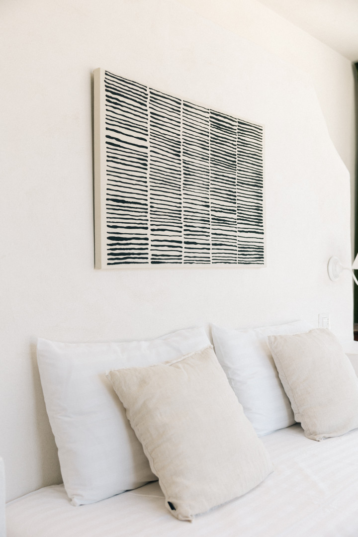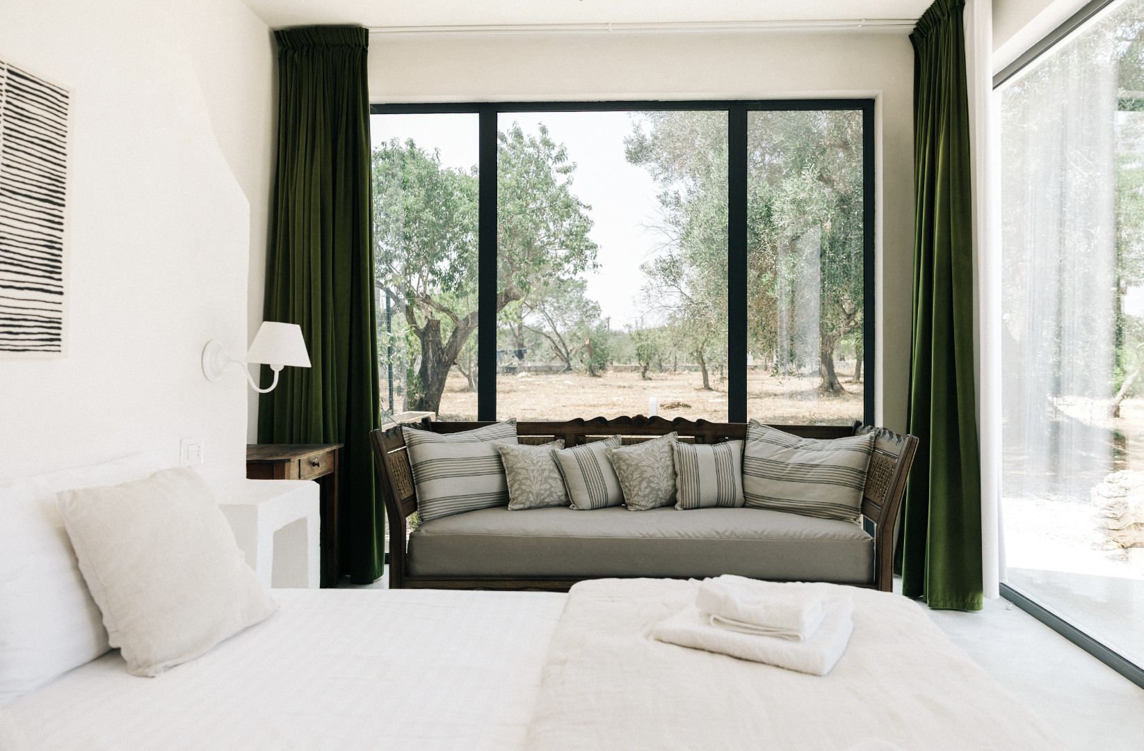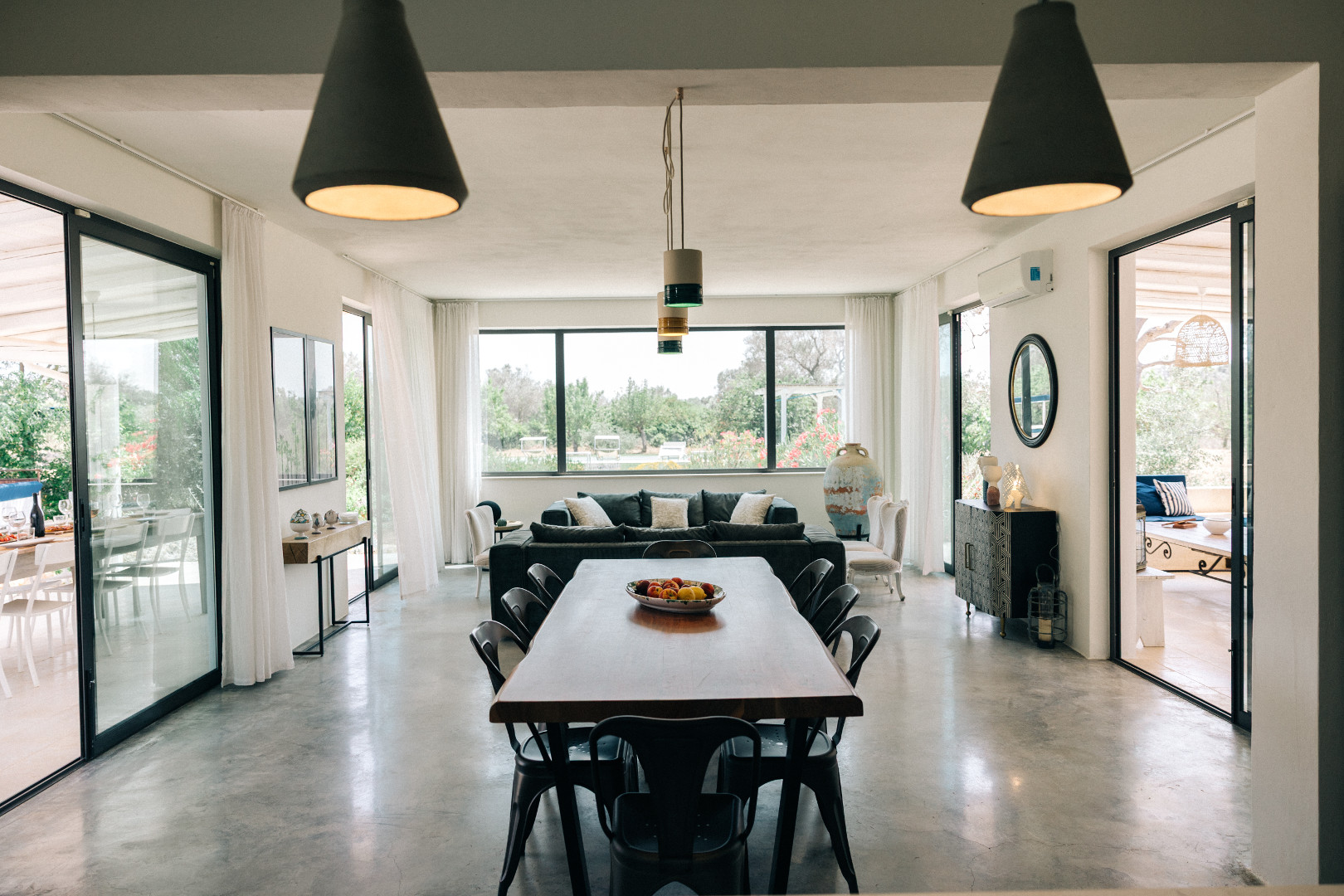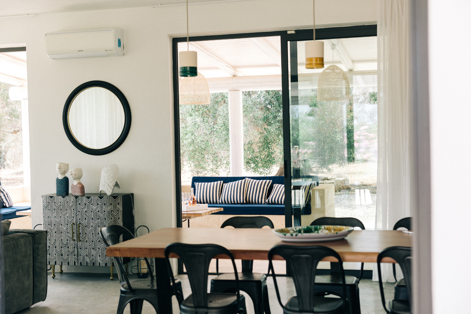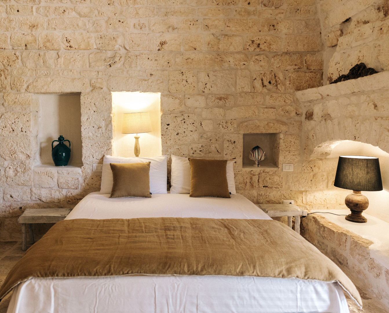 À l’intérieur, la villa mêle harmonieusement élégance rustique et raffinement contemporain. Les pièces à vivre, baignées de lumière grâce aux grandes ouvertures, créent une atmosphère chaleureuse et délicate où matières naturelles, belles pièces artisanales et touches de couleur se répondent. Le salon et la salle à manger invitent à la convivialité, tandis que la cuisine entièrement équipée ravira les amateurs de gastronomie. Avec ses appareils modernes et son agencement fonctionnel, elle se prête aussi bien aux repas familiaux qu’aux moments de cuisine partagés. Les cinq chambres, dotées chacune de leur salle de bain privative, offrent une décoration soignée, propice au repos et à l’évasion. Chacune possède son propre caractère, tout en garantissant le même niveau de confort grâce à la climatisation, aux équipements modernes et à une literie de qualité, pour des nuits aussi douces que le climat des Pouilles.