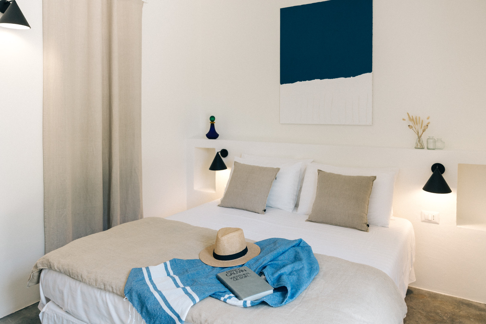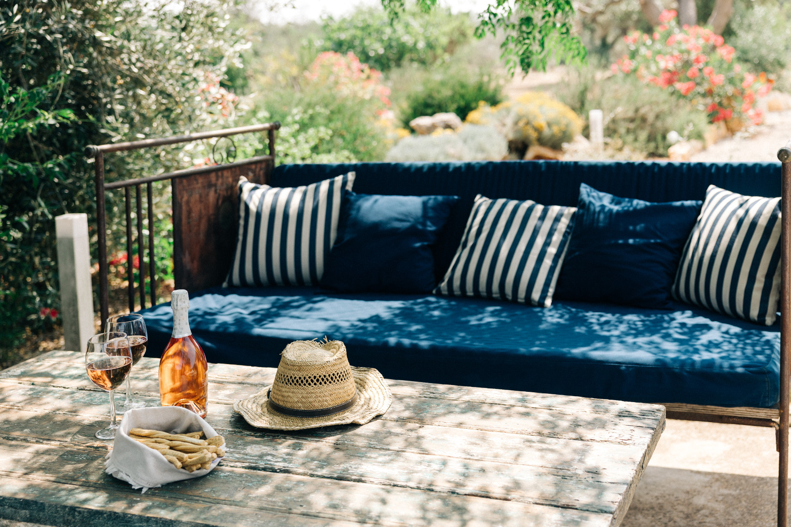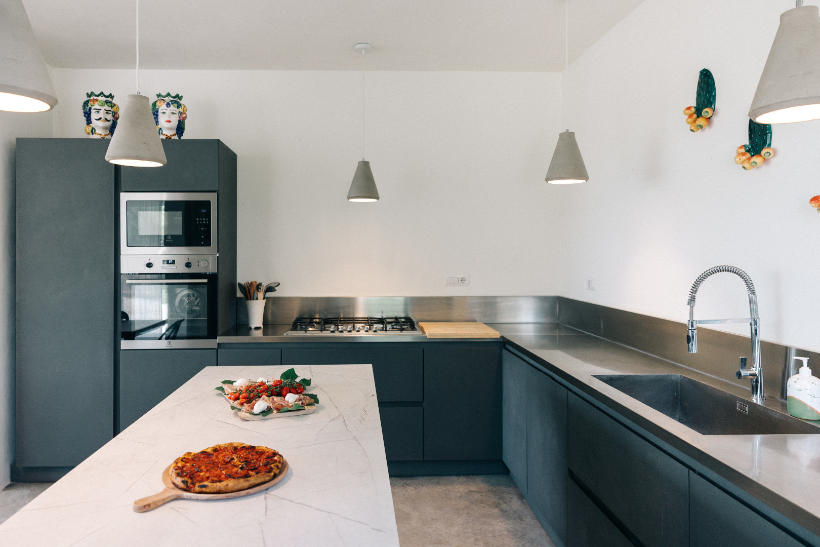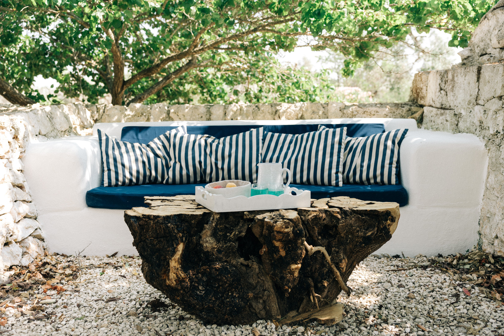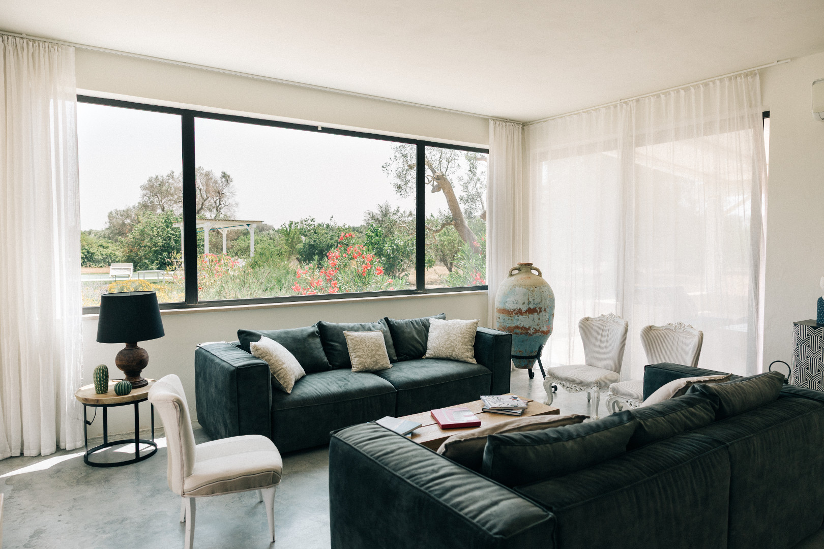 À l’intérieur, la villa mêle harmonieusement élégance rustique et raffinement contemporain. Les pièces à vivre, baignées de lumière grâce aux grandes ouvertures, créent une atmosphère chaleureuse et délicate où matières naturelles, belles pièces artisanales et touches de couleur se répondent. Le salon et la salle à manger invitent à la convivialité, tandis que la cuisine entièrement équipée ravira les amateurs de gastronomie. Avec ses appareils modernes et son agencement fonctionnel, elle se prête aussi bien aux repas familiaux qu’aux moments de cuisine partagés. Les cinq chambres, dotées chacune de leur salle de bain privative, offrent une décoration soignée, propice au repos et à l’évasion. Chacune possède son propre caractère, tout en garantissant le même niveau de confort grâce à la climatisation, aux équipements modernes et à une literie de qualité, pour des nuits aussi douces que le climat des Pouilles.