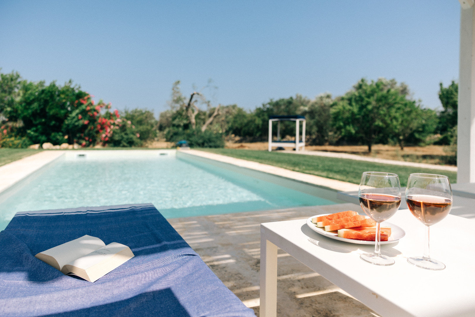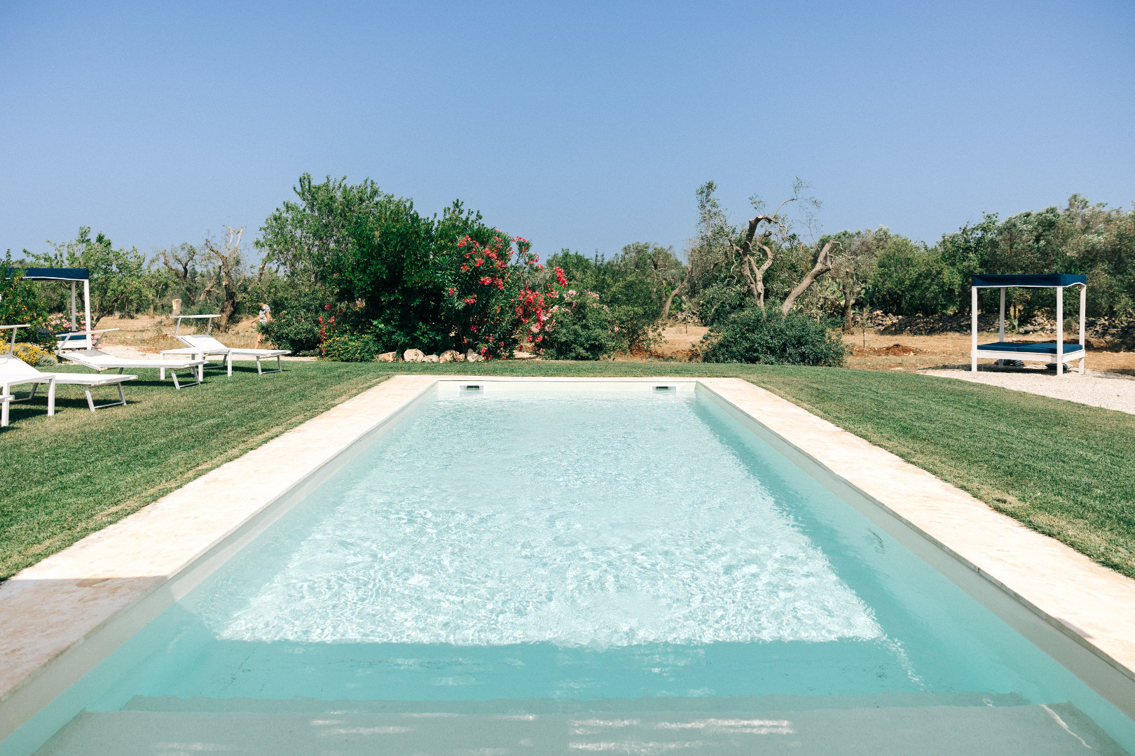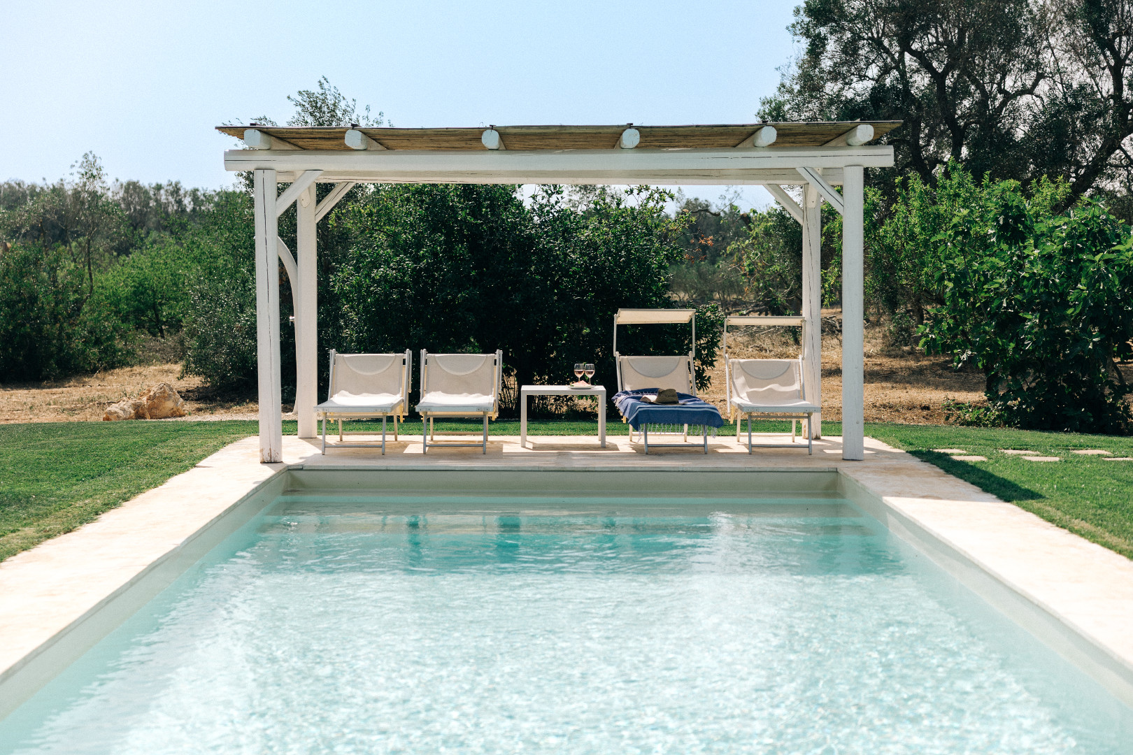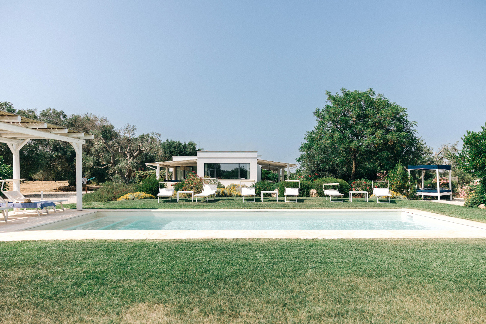À l’extérieur, la villa se déploie sur un terrain de plus d’un hectare et quatre mille mètres carrés, entièrement arboré et façonné par la beauté méditerranéenne. Les pergolas offrent des espaces ombragés parfaits pour se détendre. La piscine, véritable point d’attraction, scintille au cœur du jardin et invite à des moments de farniente sous le ciel bleu des Pouilles. Autour, plusieurs coins repos sont aménagés pour lire, se rafraîchir ou simplement admirer la nature environnante. Le soir venu, lorsque la lumière se fait plus douce, les extérieurs se transforment en un décor envoûtant, idéal pour partager de longs dîners d’été ou contempler les étoiles en toute tranquillité.
