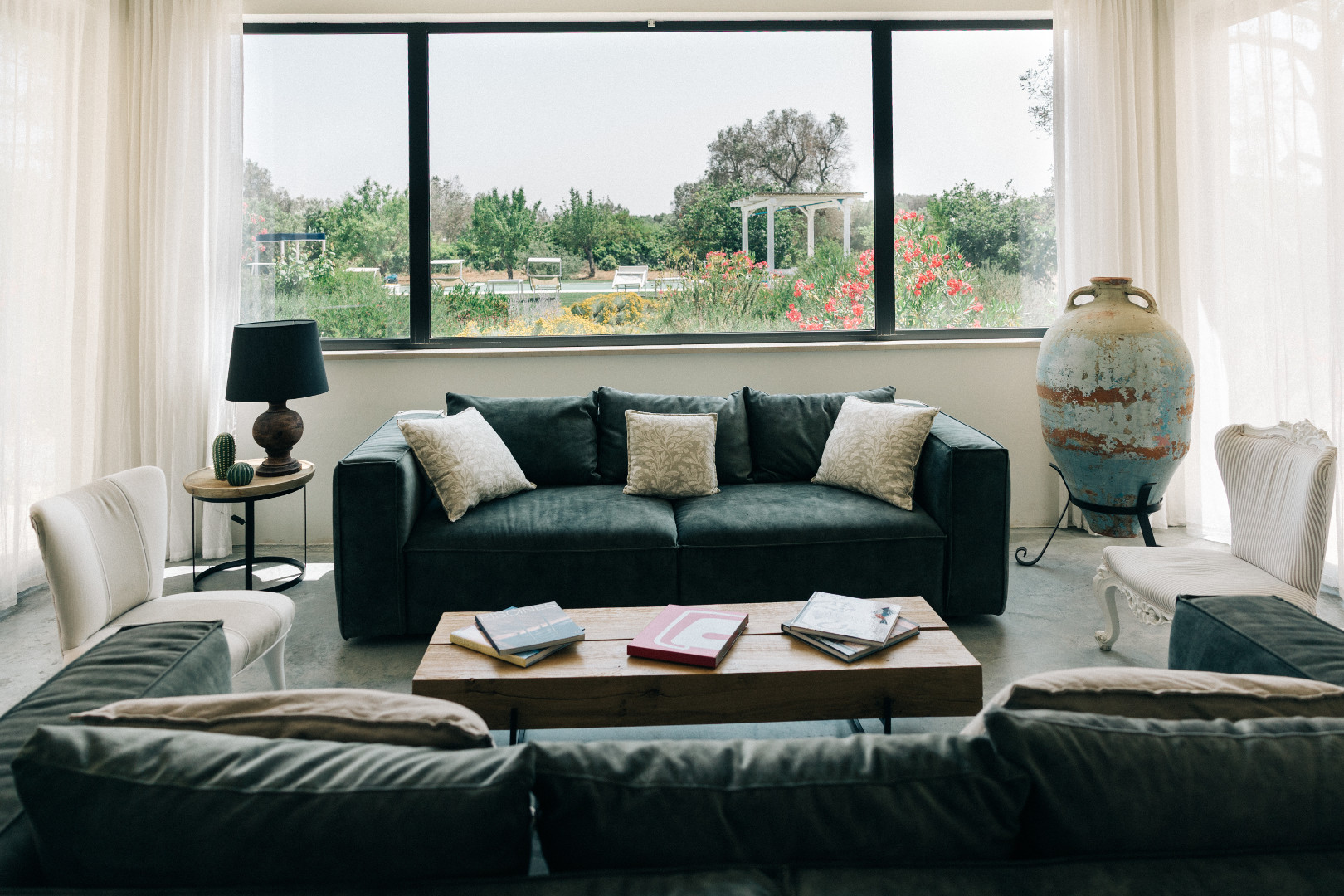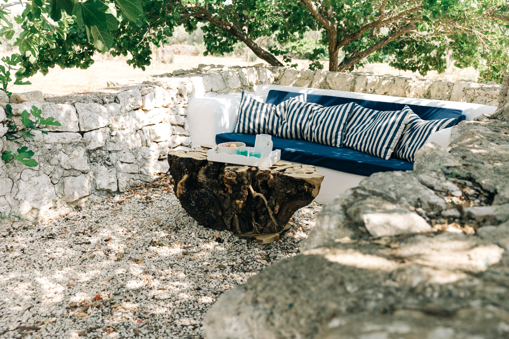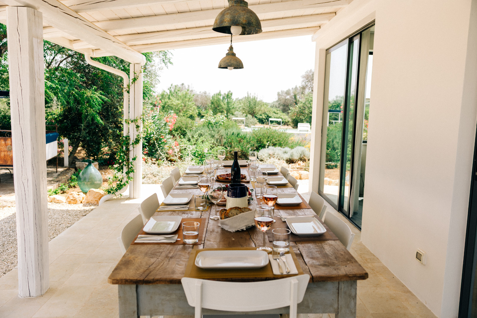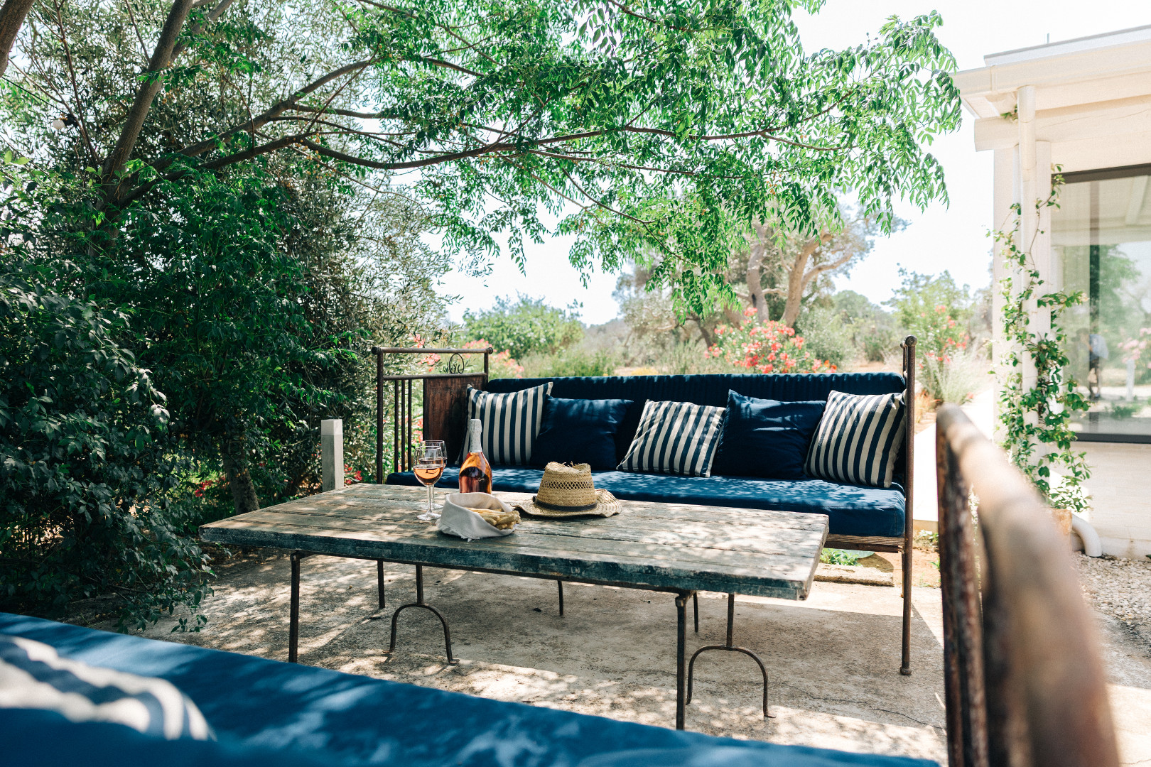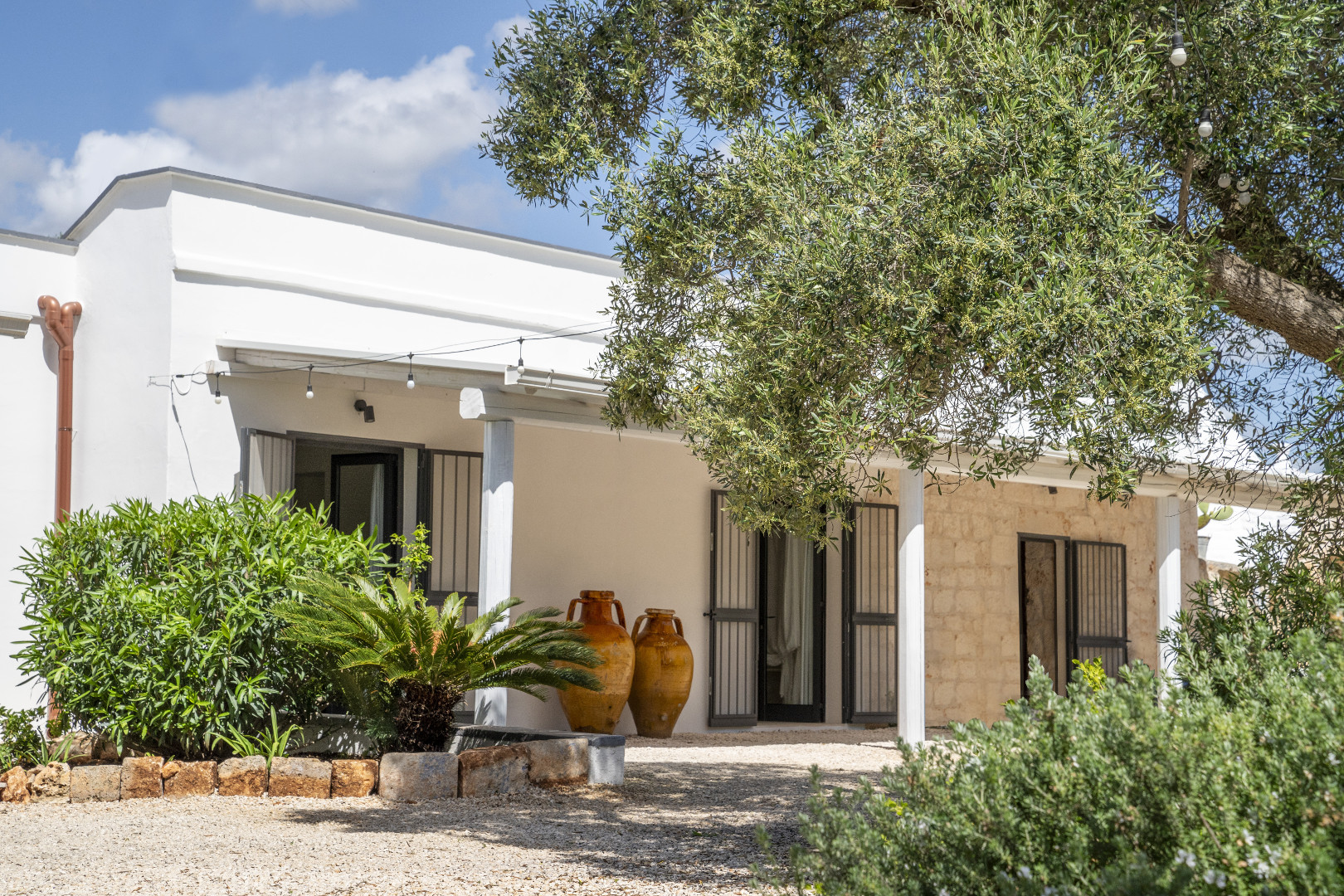 À l’extérieur, la villa se déploie sur un terrain de plus d’un hectare et quatre mille mètres carrés, entièrement arboré et façonné par la beauté méditerranéenne. Les pergolas offrent des espaces ombragés parfaits pour se détendre. La piscine, véritable point d’attraction, scintille au cœur du jardin et invite à des moments de farniente sous le ciel bleu des Pouilles. Autour, plusieurs coins repos sont aménagés pour lire, se rafraîchir ou simplement admirer la nature environnante. Le soir venu, lorsque la lumière se fait plus douce, les extérieurs se transforment en un décor envoûtant, idéal pour partager de longs dîners d’été ou contempler les étoiles en toute tranquillité.