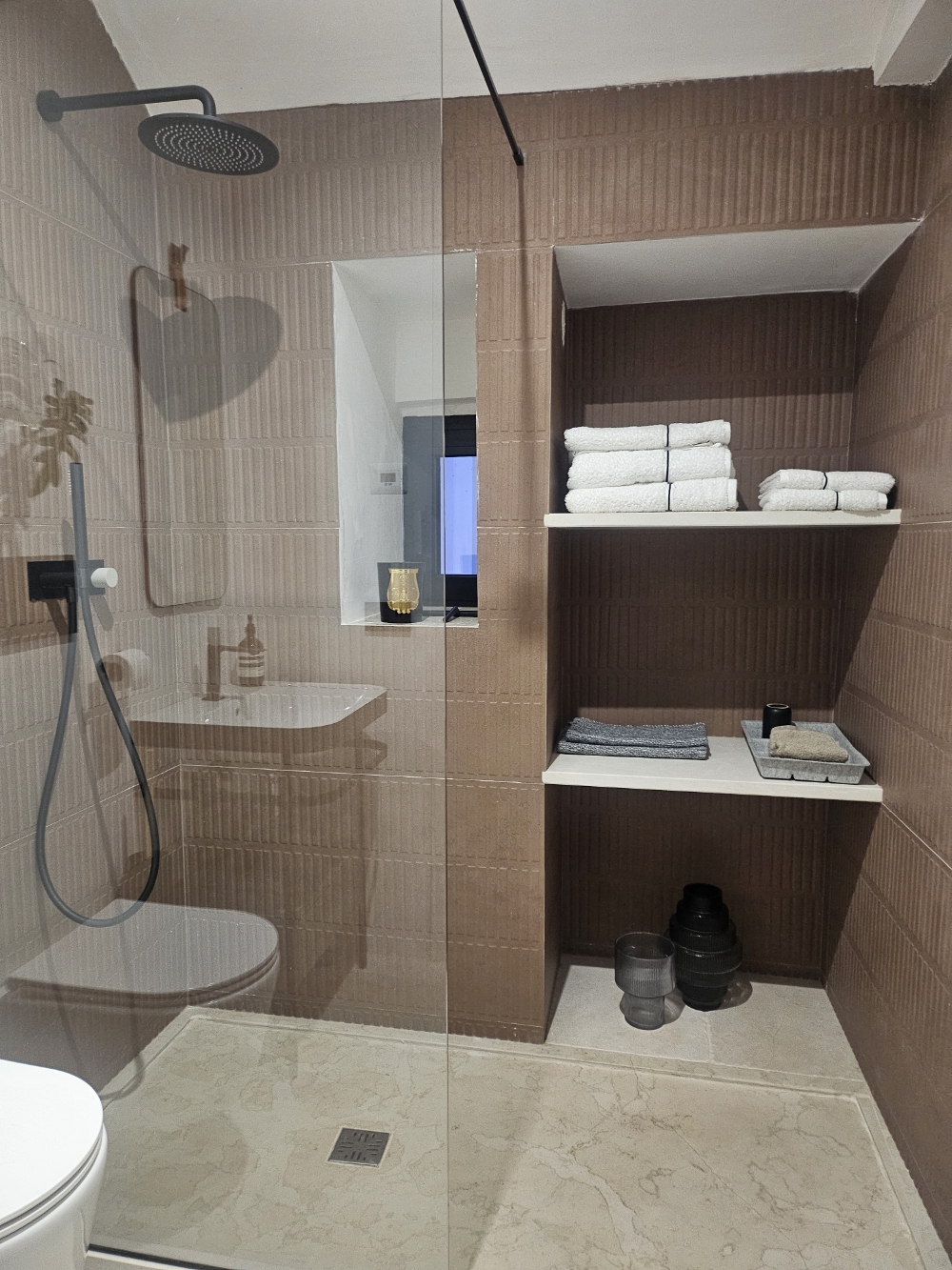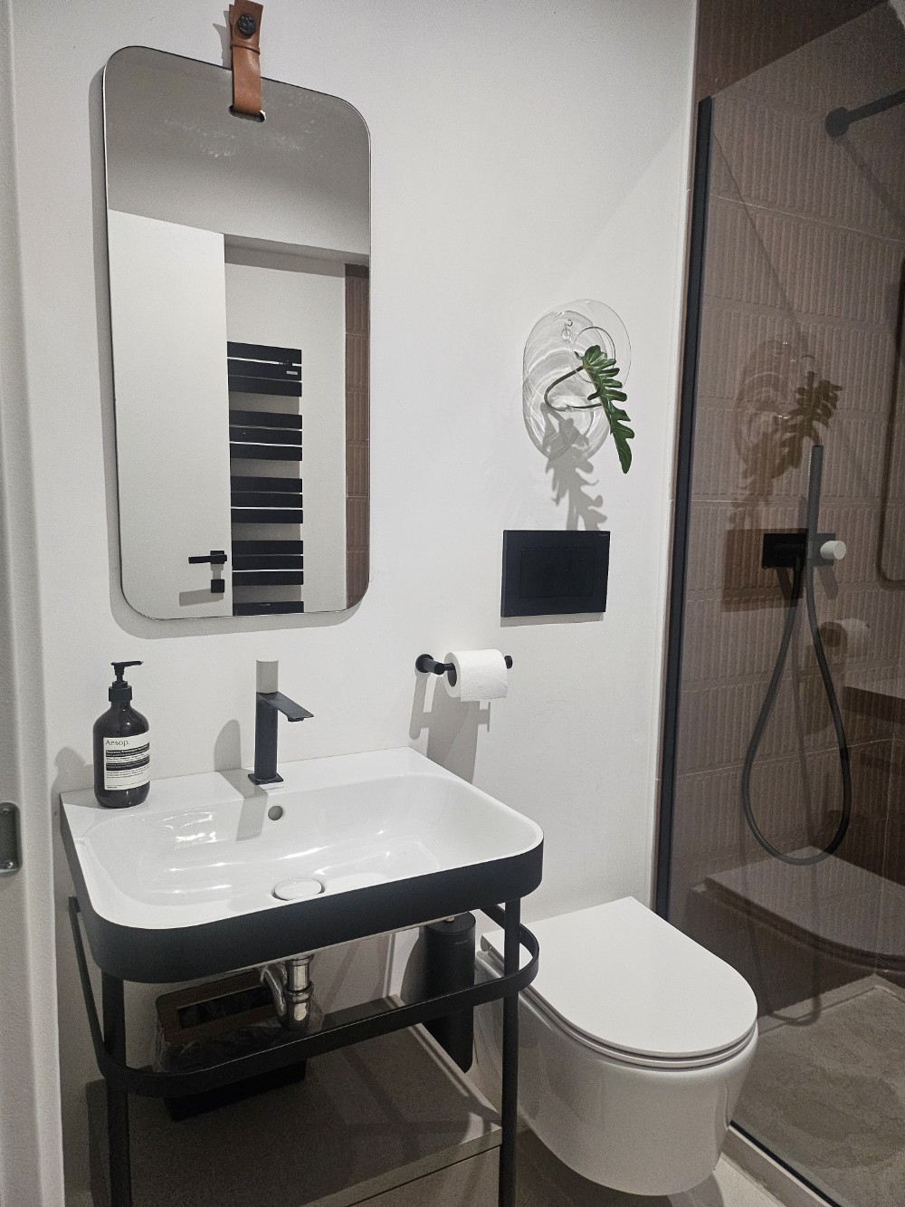 Chambre double avec lit 160, climatisation et Salle de bain séparée avec lavabo simple, douche, chauffe serviettes, wc