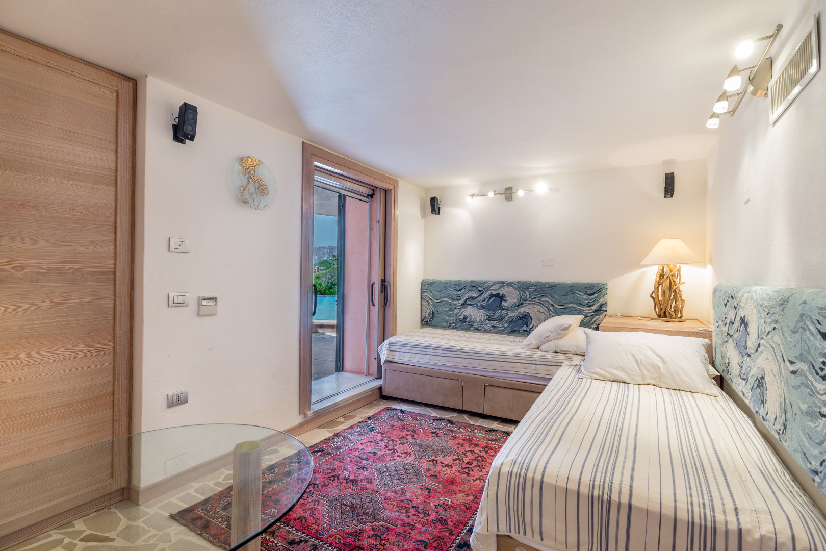 Chambre à lits jumeaux accessible uniquement de l’extérieure depuis la zone piscine et Salle de bain en suite avec douche