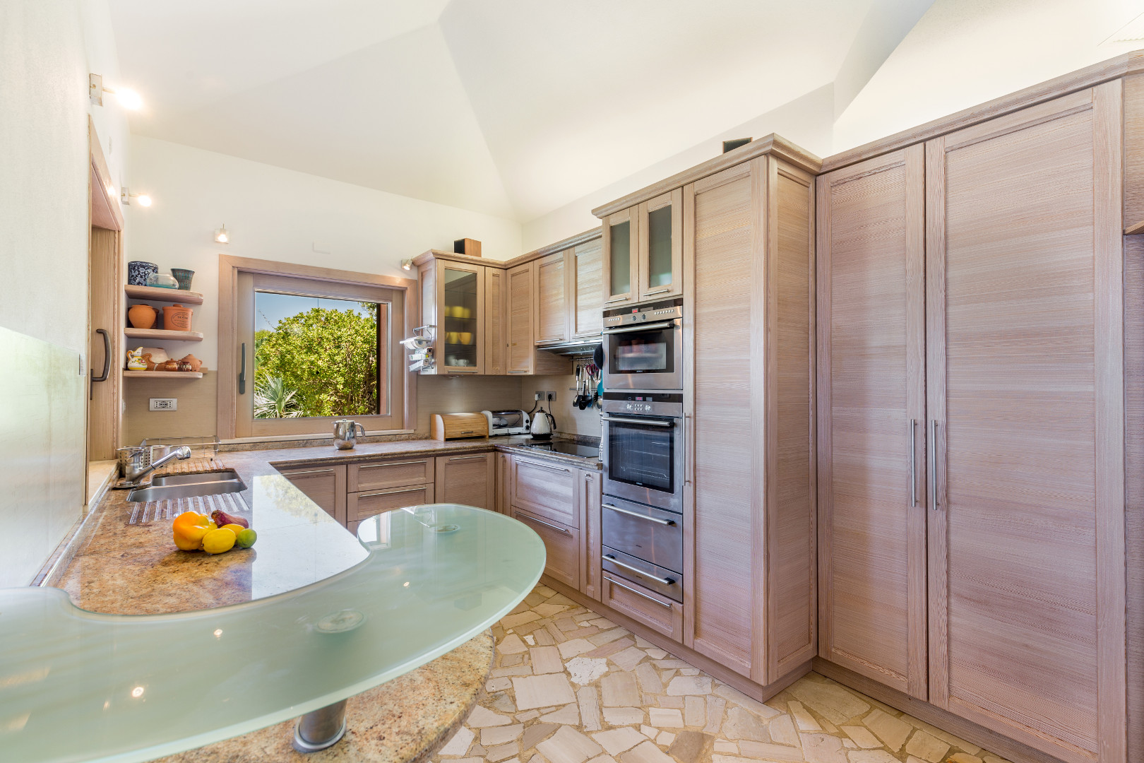 Cuisine ouverte avec percolateur, réfrigérateur, bouilloire, four électrique, plaques vitrocéramiques, lave vaisselle