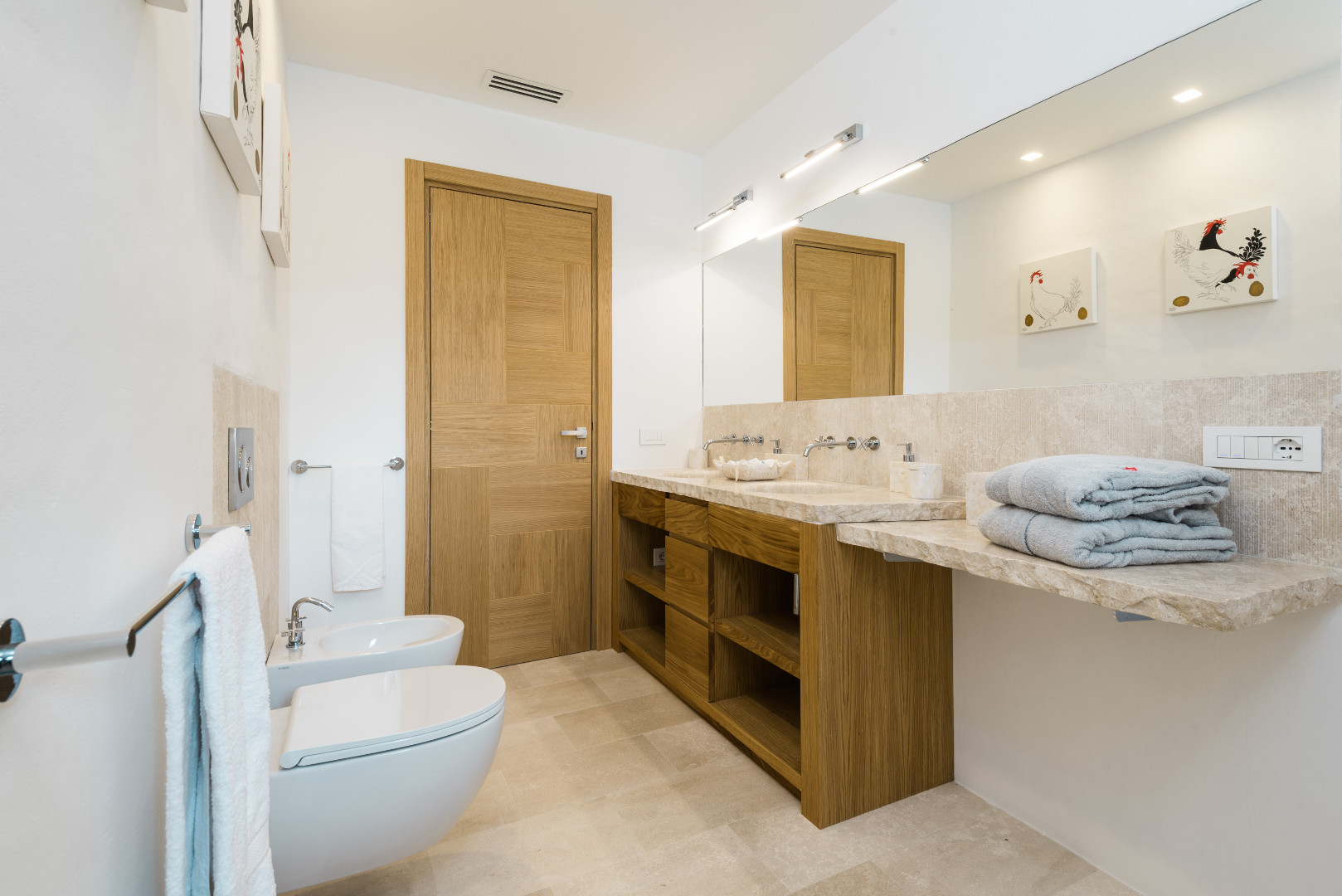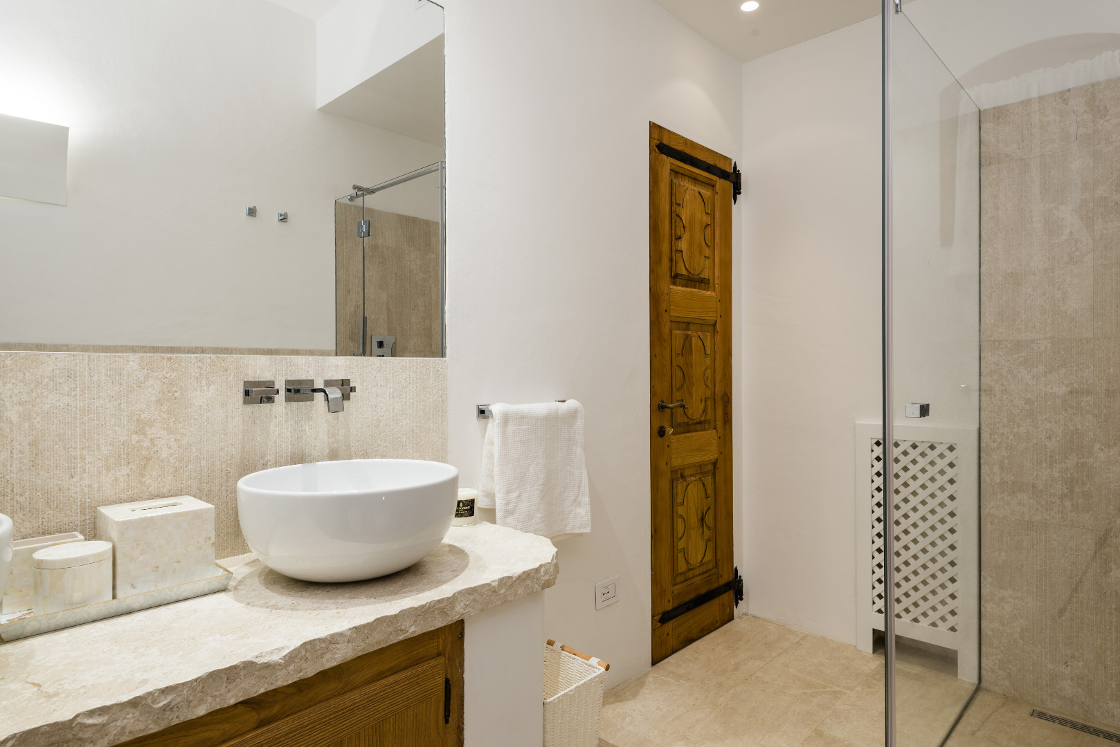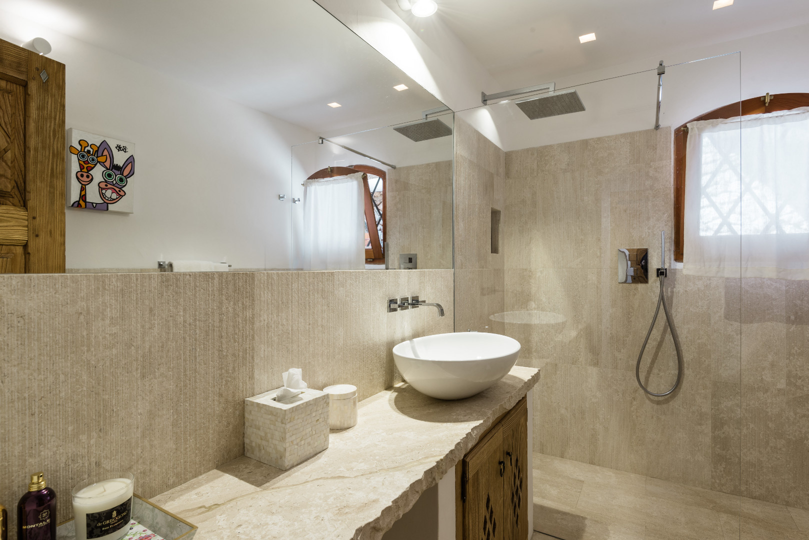 Chambre double avec accès terrasse et Salle de bain en suite avec douche, lavabo double