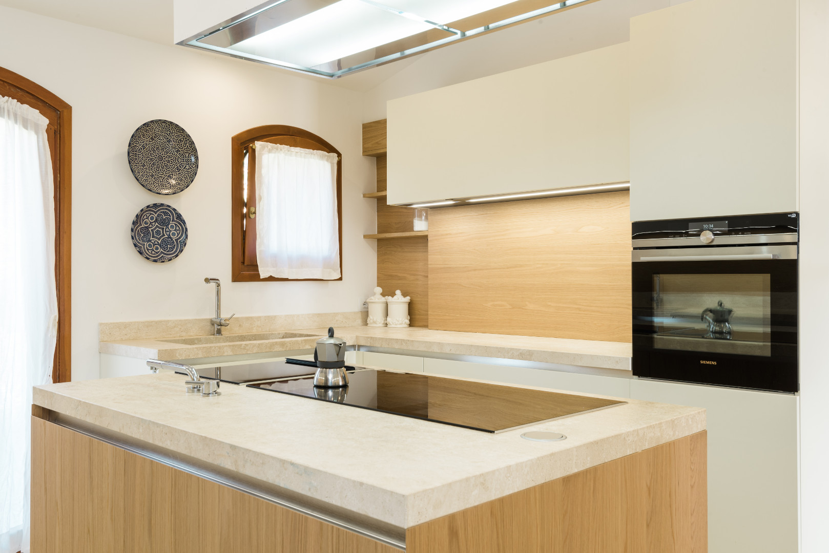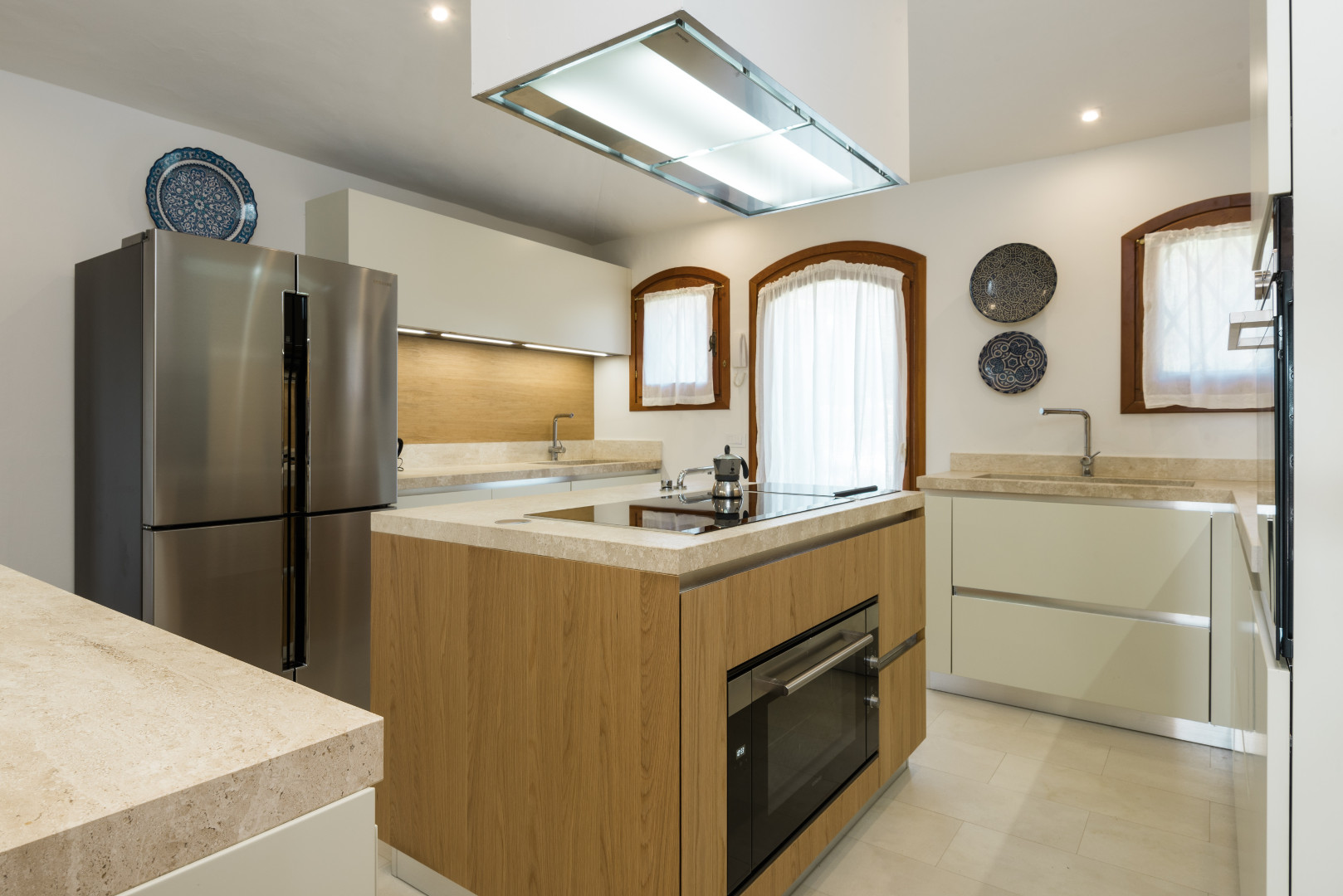 Cuisine avec four électrique, cafetière, réfrigérateur