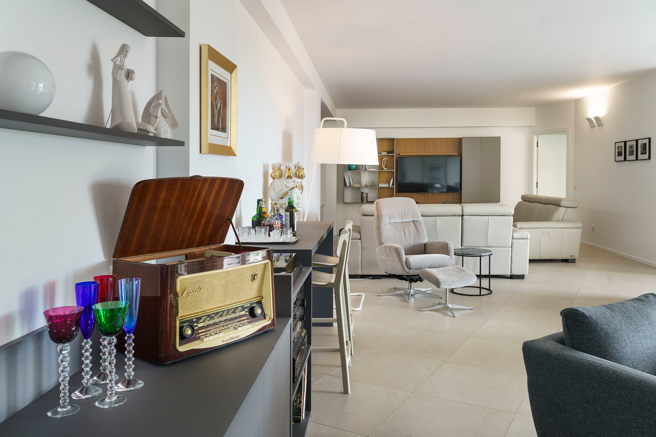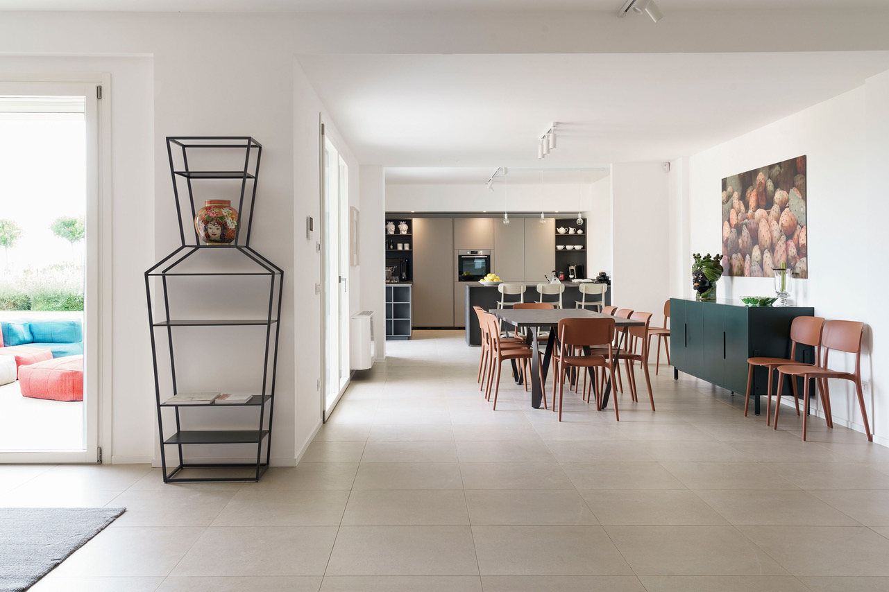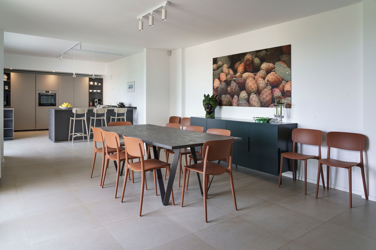 Nul doute que l’architecte a souhaité retrouver cette continuité à l’intérieur de la villa. D’abord, par un bel espace à vivre qui se développe en salon, salle à manger et cuisine, habilement pensé pour organiser dans un grand volume trois univers distincts mais complémentaires. Ensuite, par une décoration qui allie à un mobilier moderne des objets en céramique traditionnels ainsi que des pièces résolument vintage.