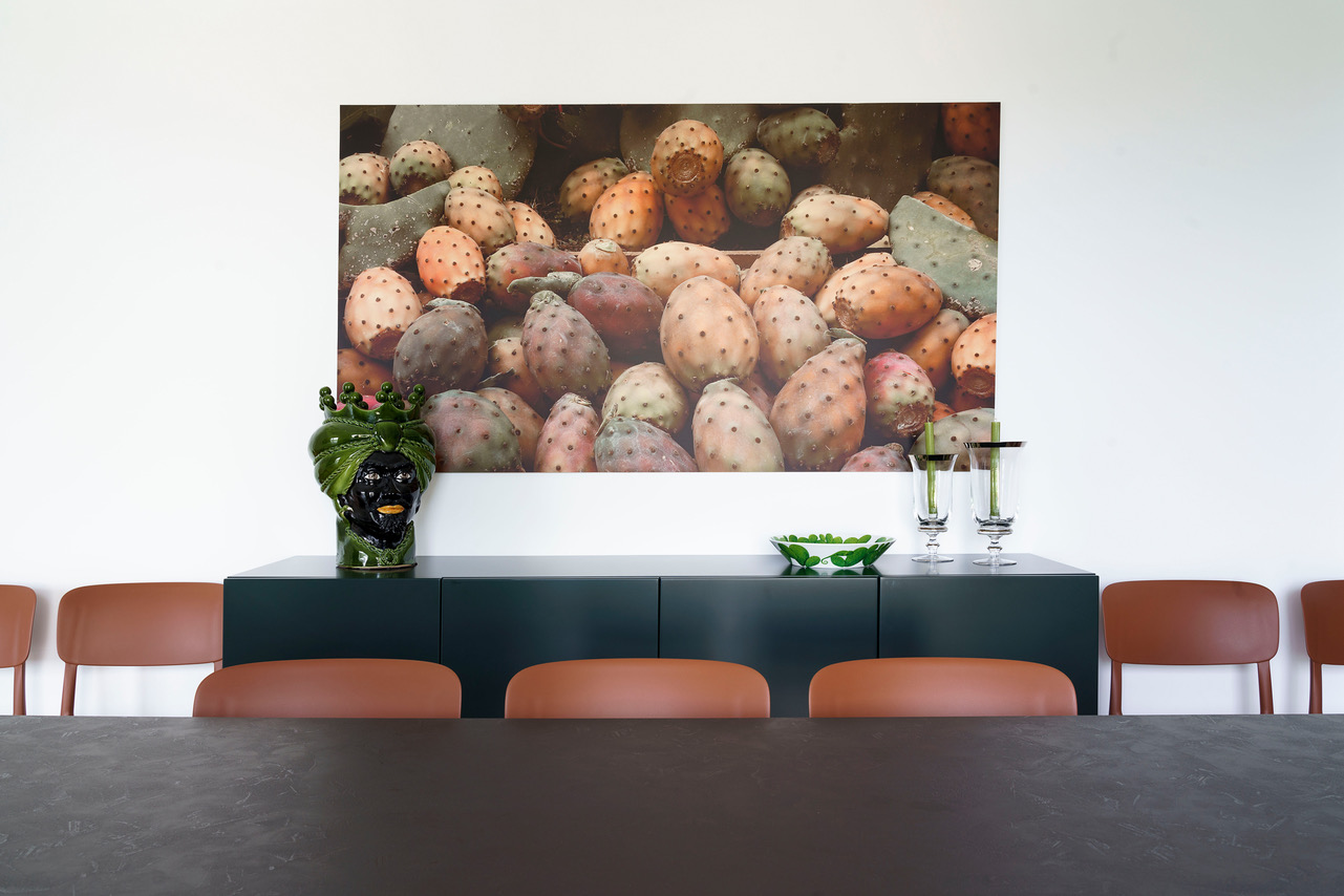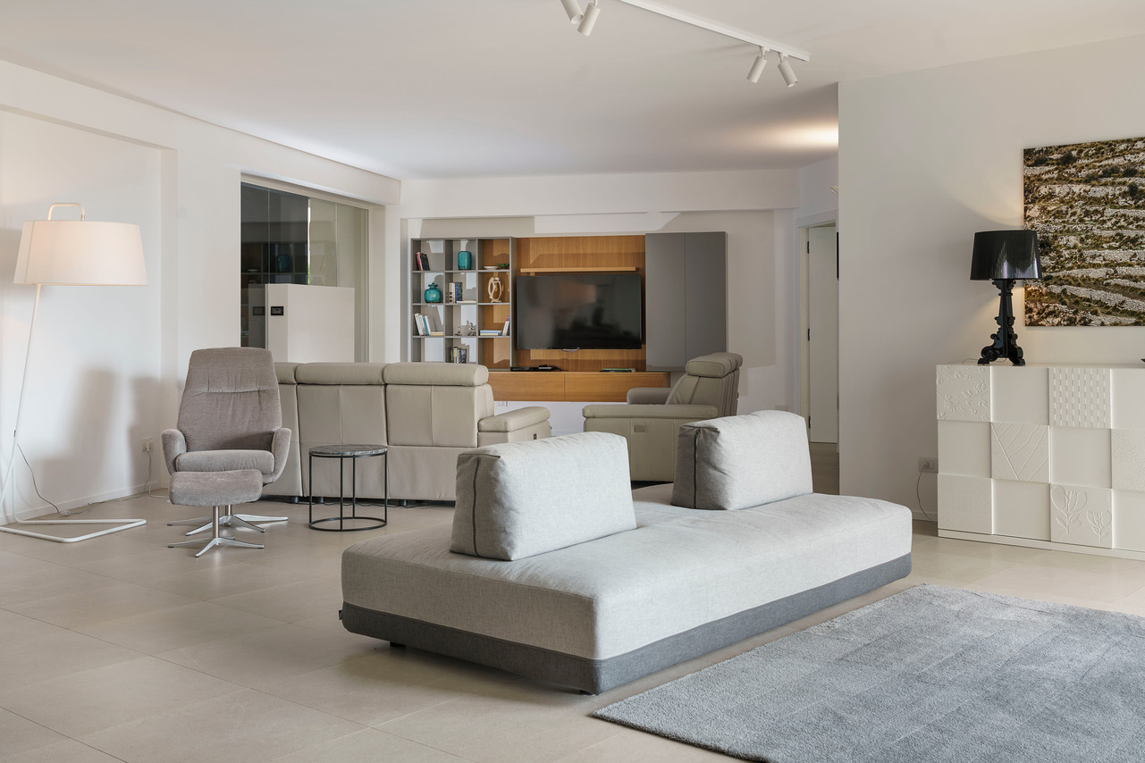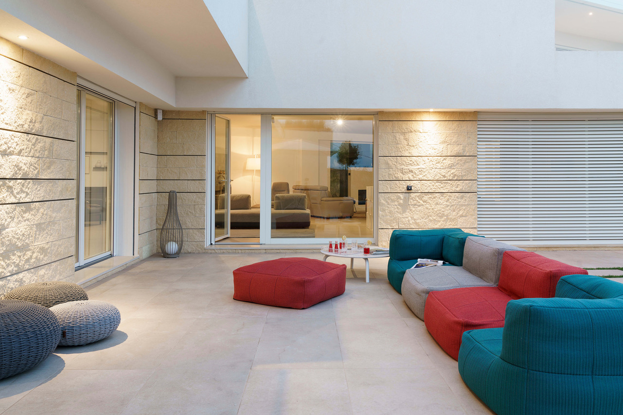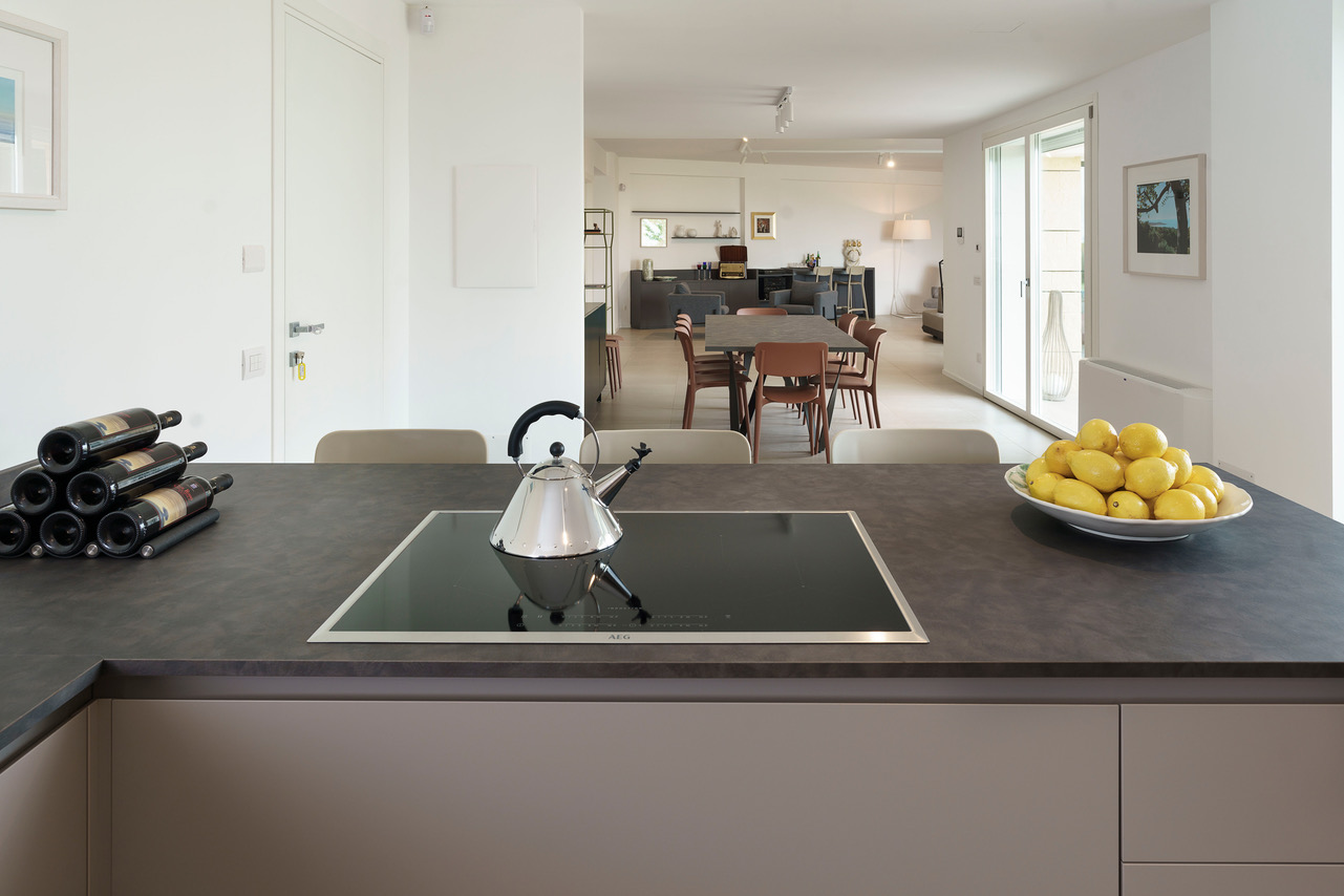 Nul doute que l’architecte a souhaité retrouver cette continuité à l’intérieur de la villa. D’abord, par un bel espace à vivre qui se développe en salon, salle à manger et cuisine, habilement pensé pour organiser dans un grand volume trois univers distincts mais complémentaires. Ensuite, par une décoration qui allie à un mobilier moderne des objets en céramique traditionnels ainsi que des pièces résolument vintage.