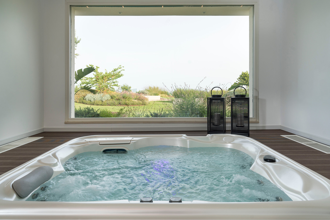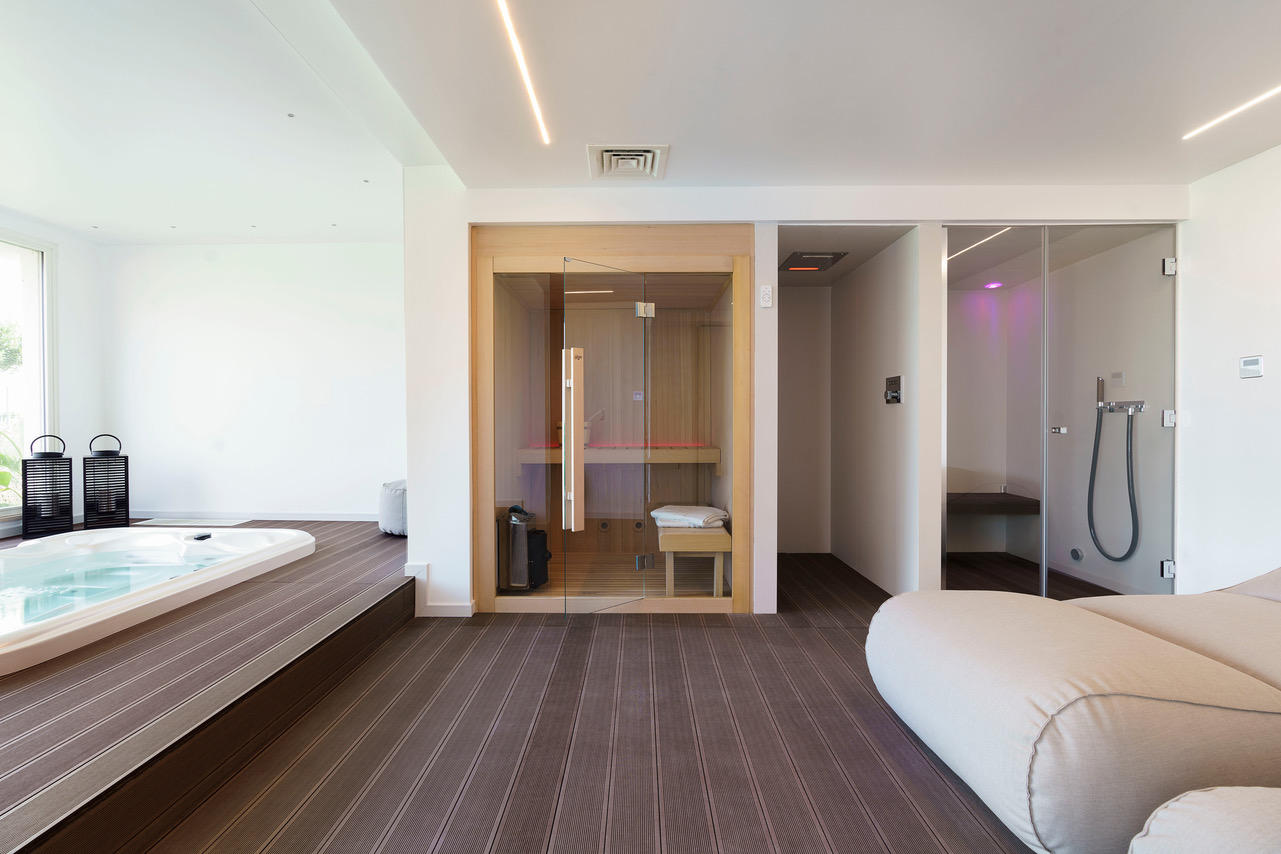 Encore dans l’espace bien-être, équipé d’une douche émotionnelle, bain turc et jacuzzi, on retrouve une superbe vue sur la nature grâce à une grande baie vitrée.