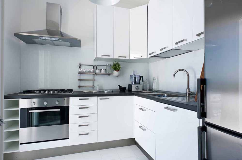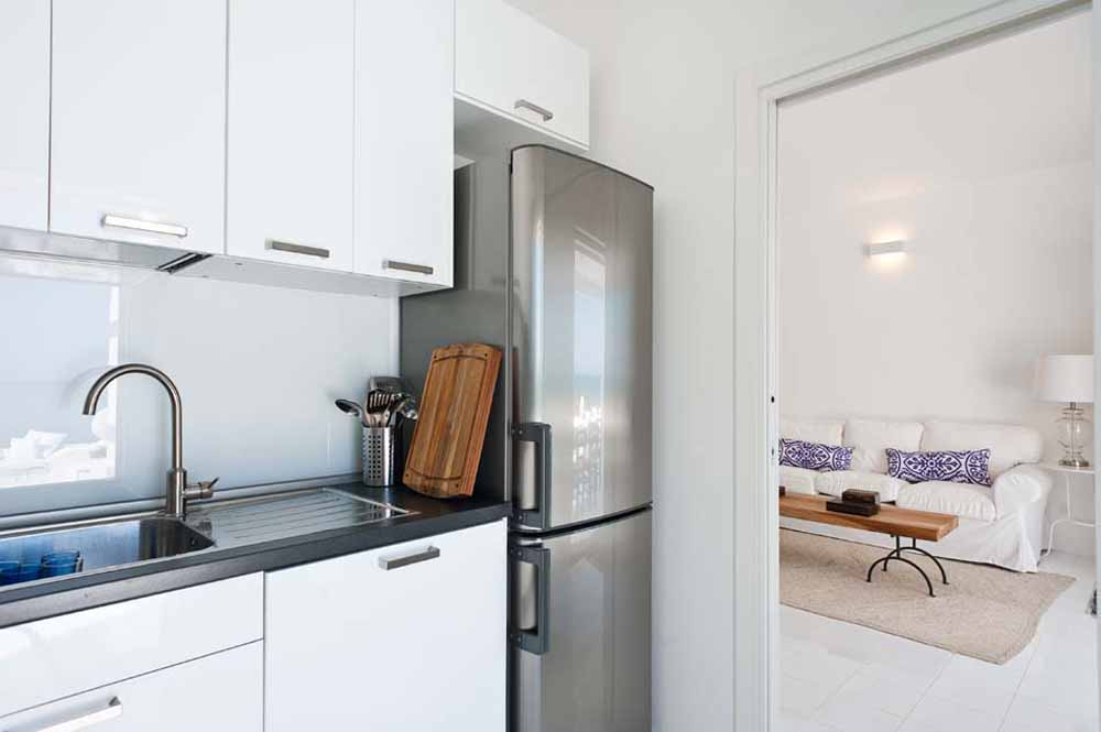 Cuisine avec lave vaisselle, table de cuisson à gaz, four électrique, réfrigérateur, grille pain, four micro ondes, machine à expresso